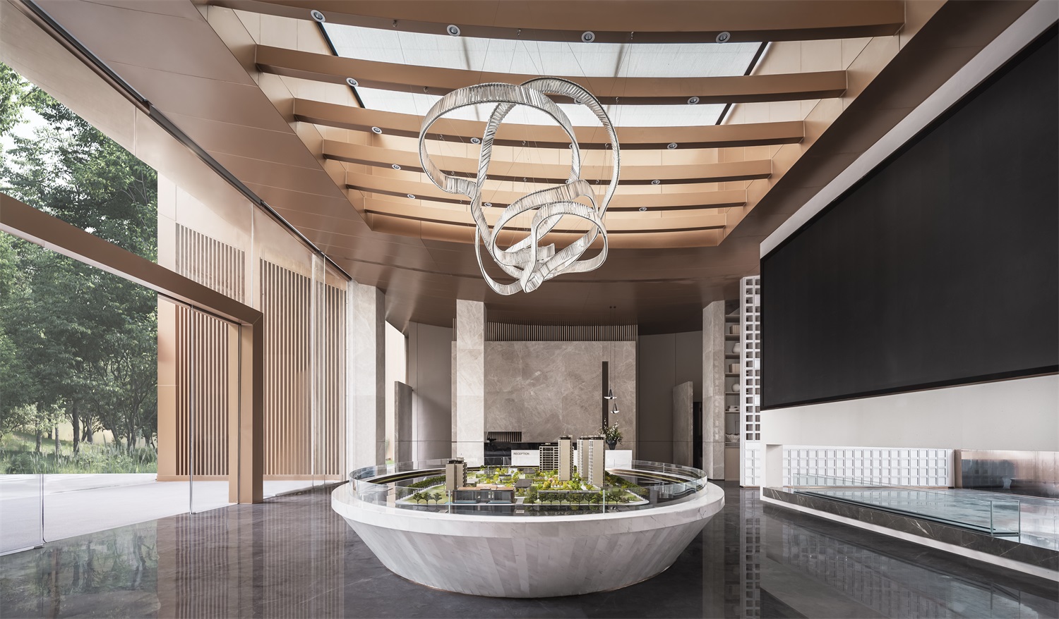 借助顶部天井 ,实现最大化自然采光。天花螺旋造型的艺术吊灯如同一条蜿蜒曲折的河流,随着水形的变化,将凤翔湖之景浓缩其上,仿若挥洒于人间的优美缎带,动静相宜,光彩交织。