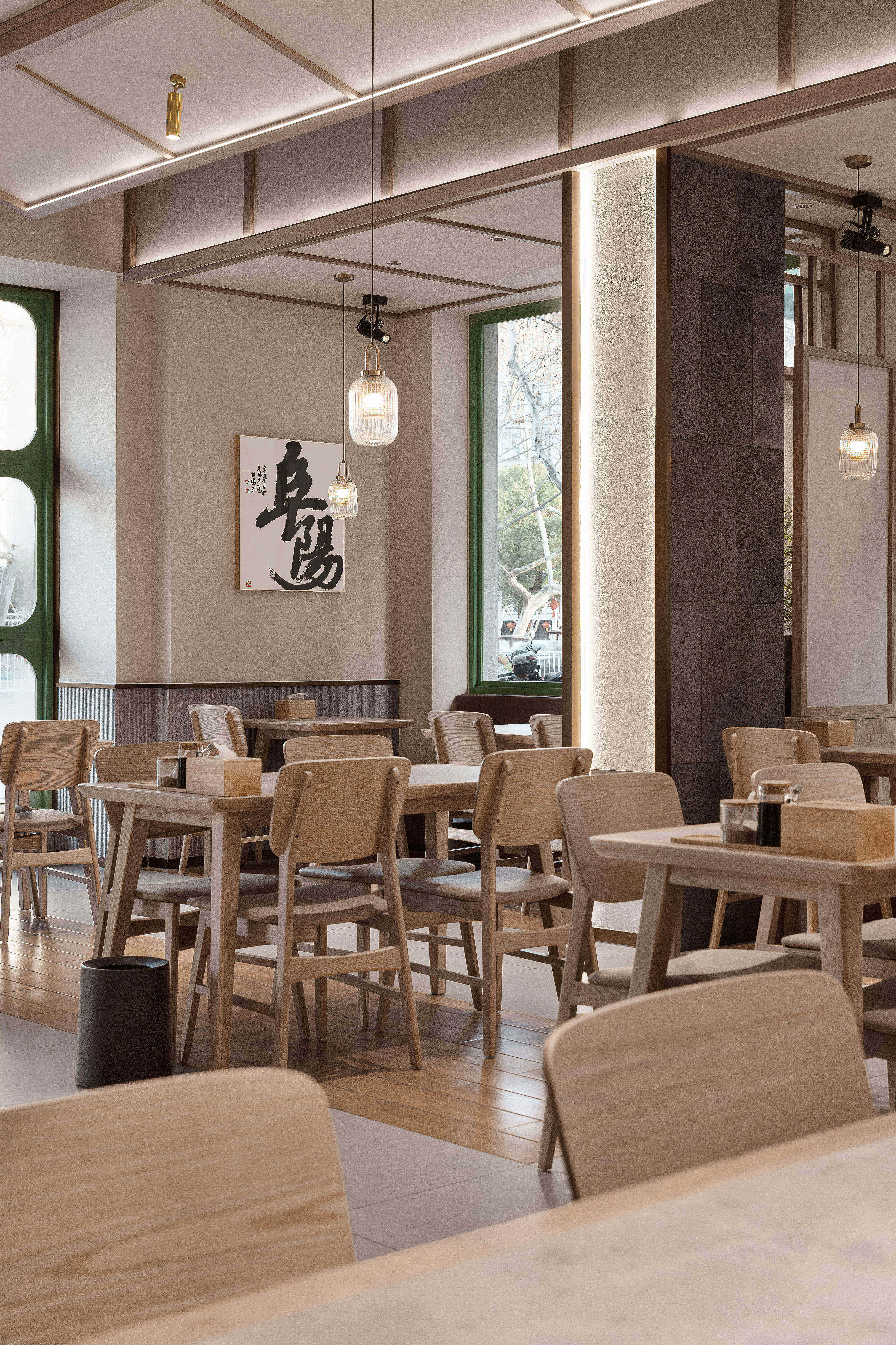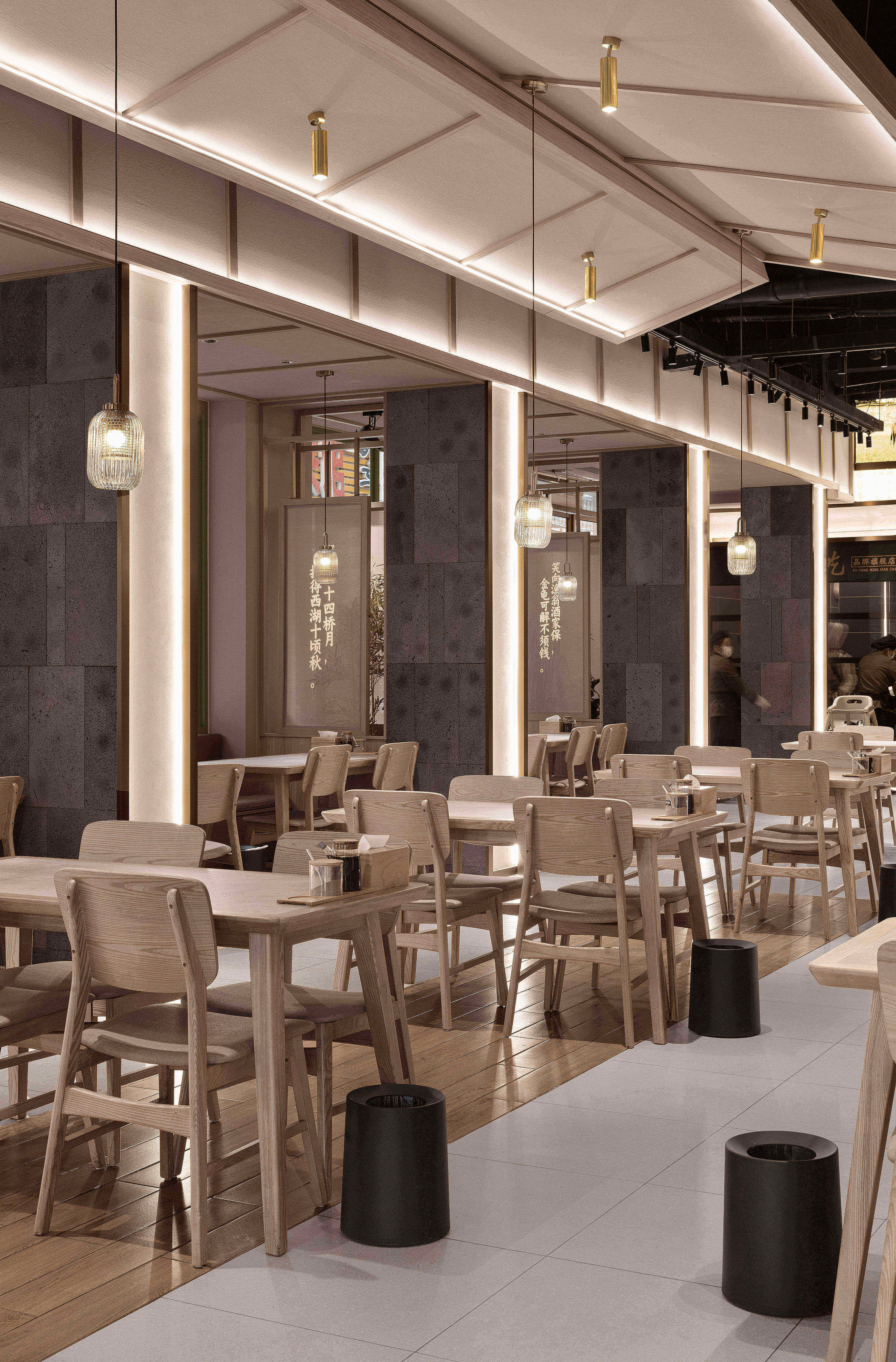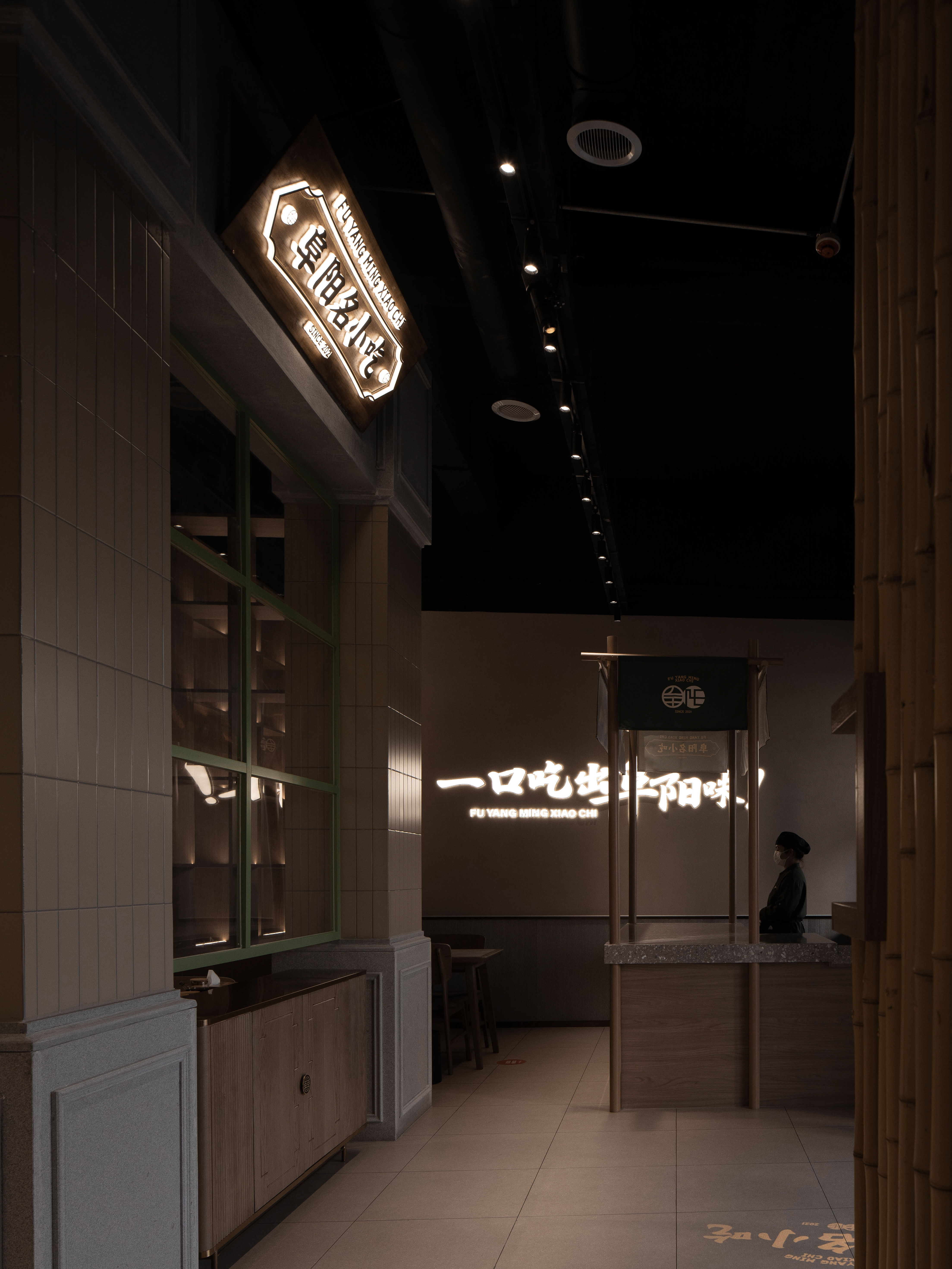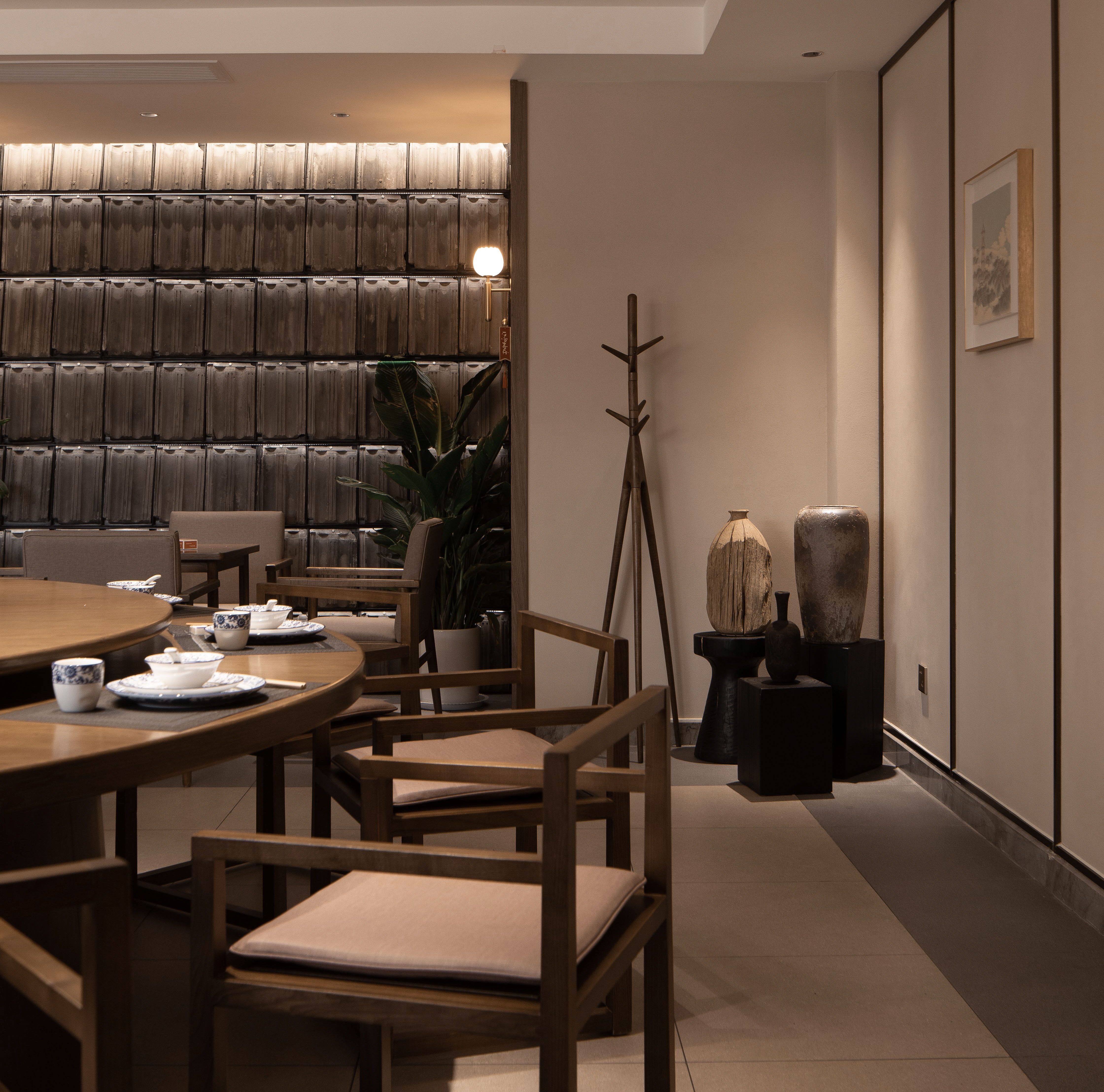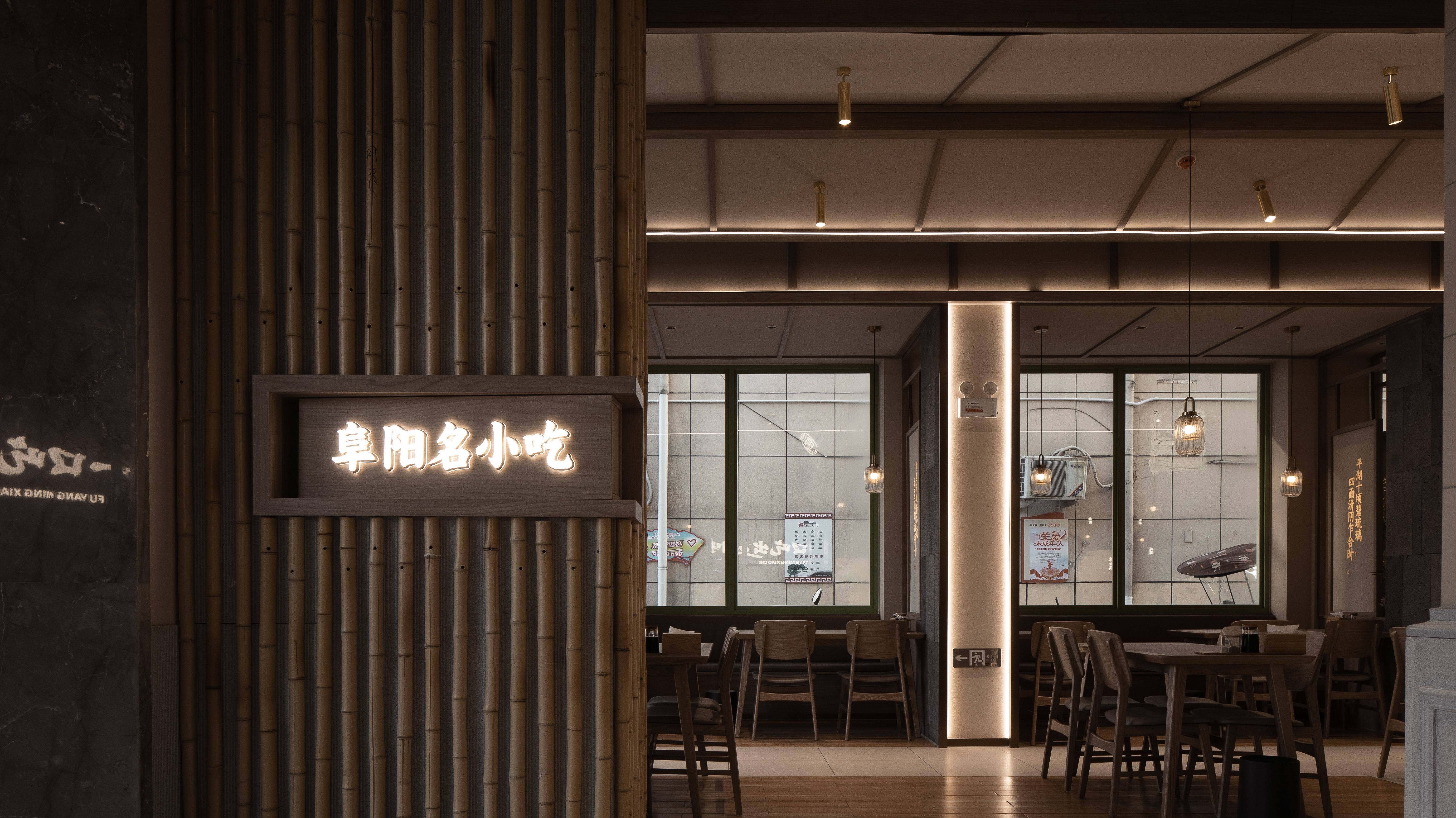 项目定位:”一口吃出阜阳味“ 特色地方餐饮除了有味道的传承也要有文化的传递,文化传递需心领神会。本案以东方传统文化古韵为灵感,东方暗调宋雅美学空间,寻找美学与功能的平衡,探索器物精神下的美学创造,整个空间清新自然,典雅含蓄,没有过多的装饰,回归质朴。家具通过现代的设计手法和材料,将传统宋雅的语汇,转译为一次东方美学的现代表达。
