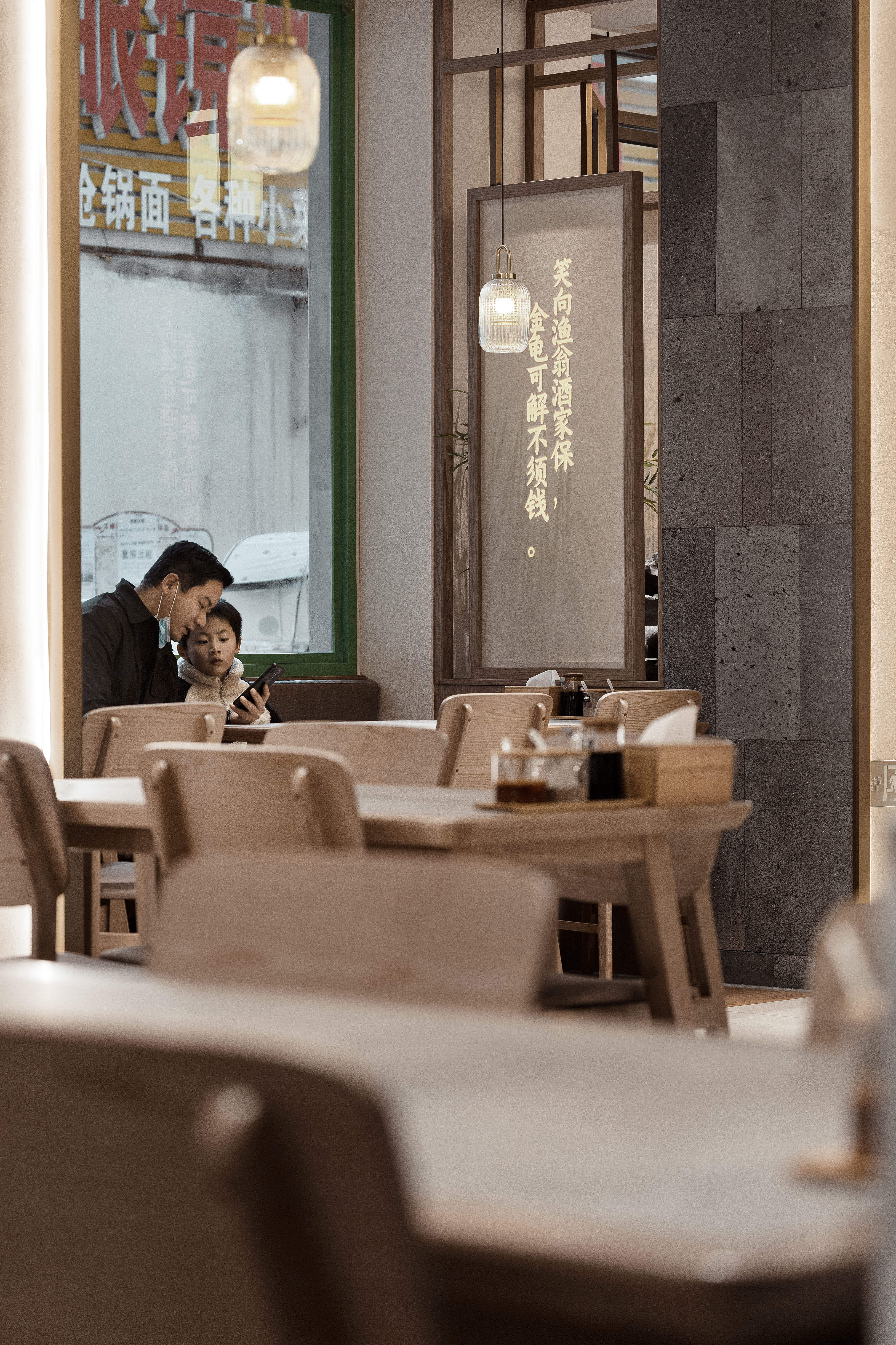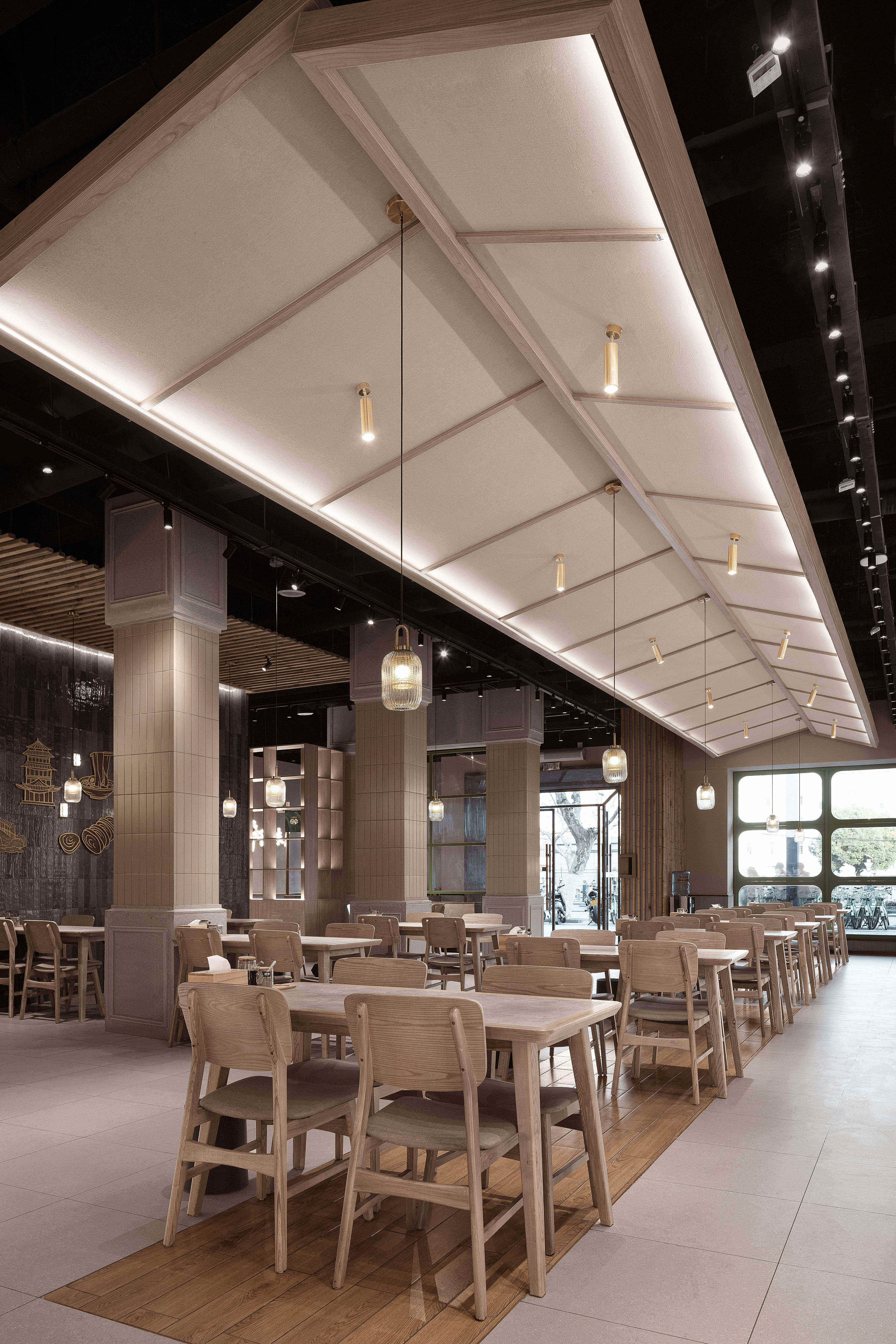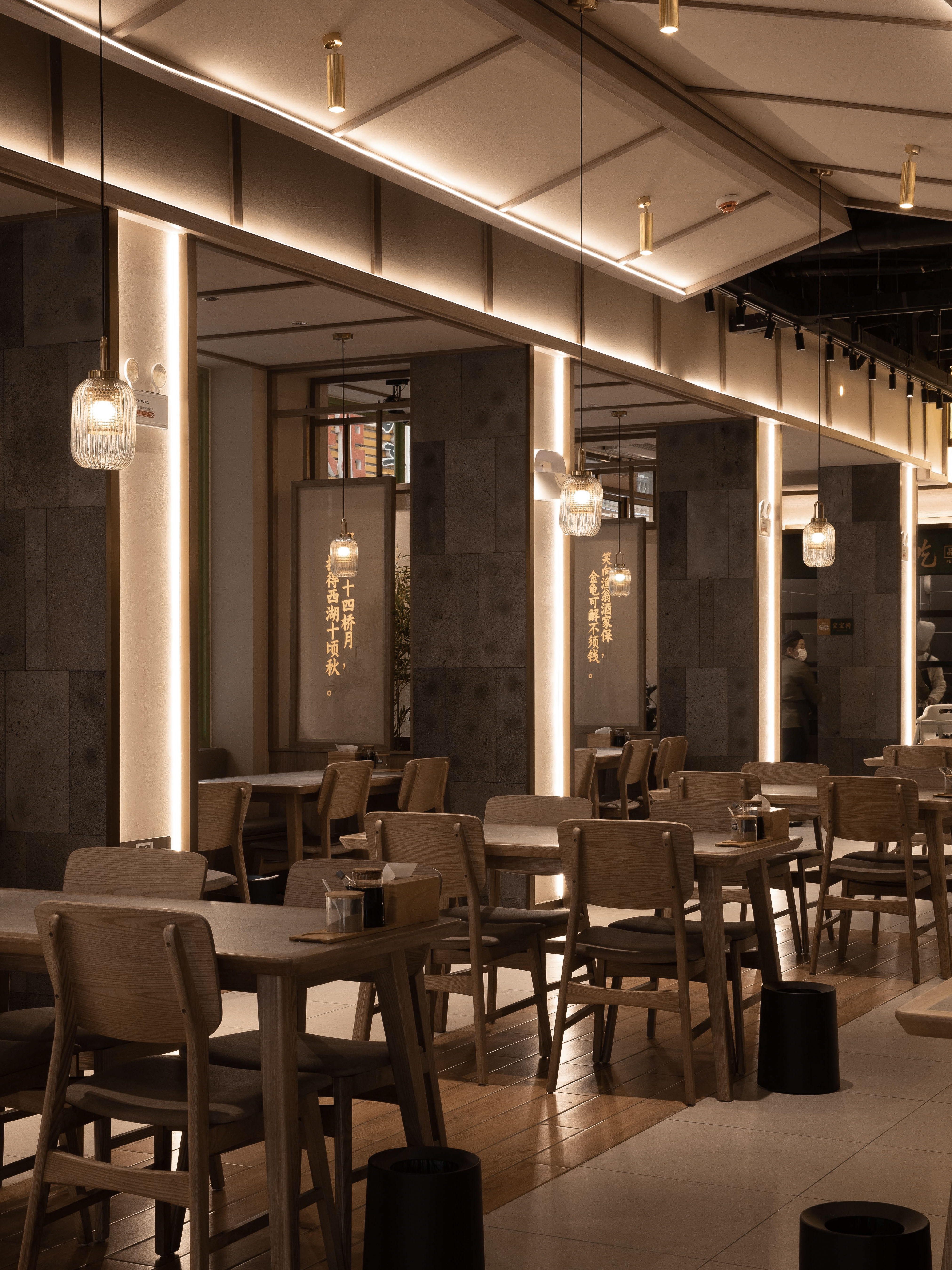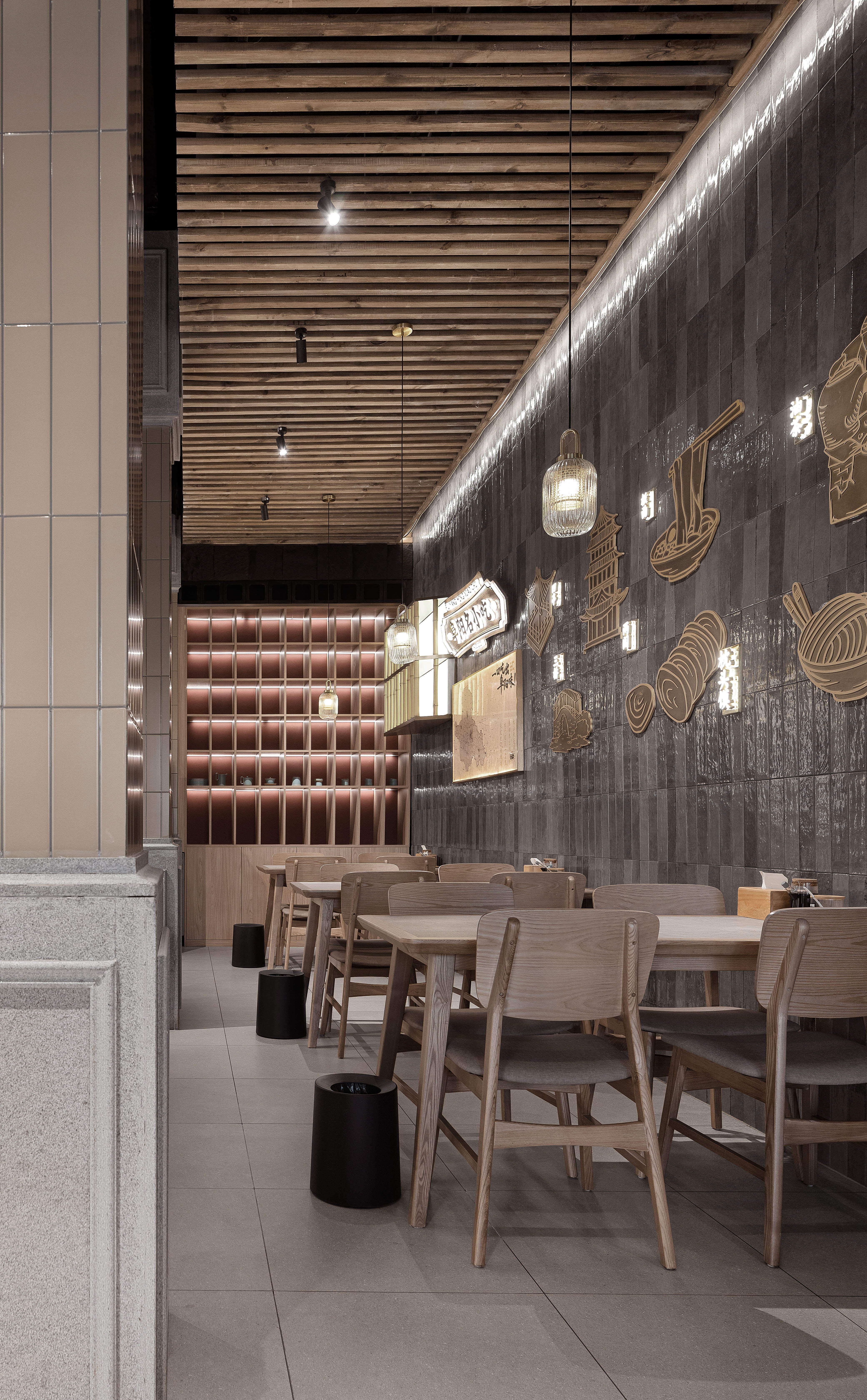 项目定位:”一口吃出阜阳味“ 特色地方餐饮除了有味道的传承也要有文化的传递,文化传递需心领神会。本案以东方传统文化古韵为灵感,东方暗调宋雅美学空间,寻找美学与功能的平衡,探索器物精神下的美学创造,整个空间清新自然,典雅含蓄,没有过多的装饰,回归质朴。家具通过现代的设计手法和材料,将传统宋雅的语汇,转译为一次东方美学的现代表达。