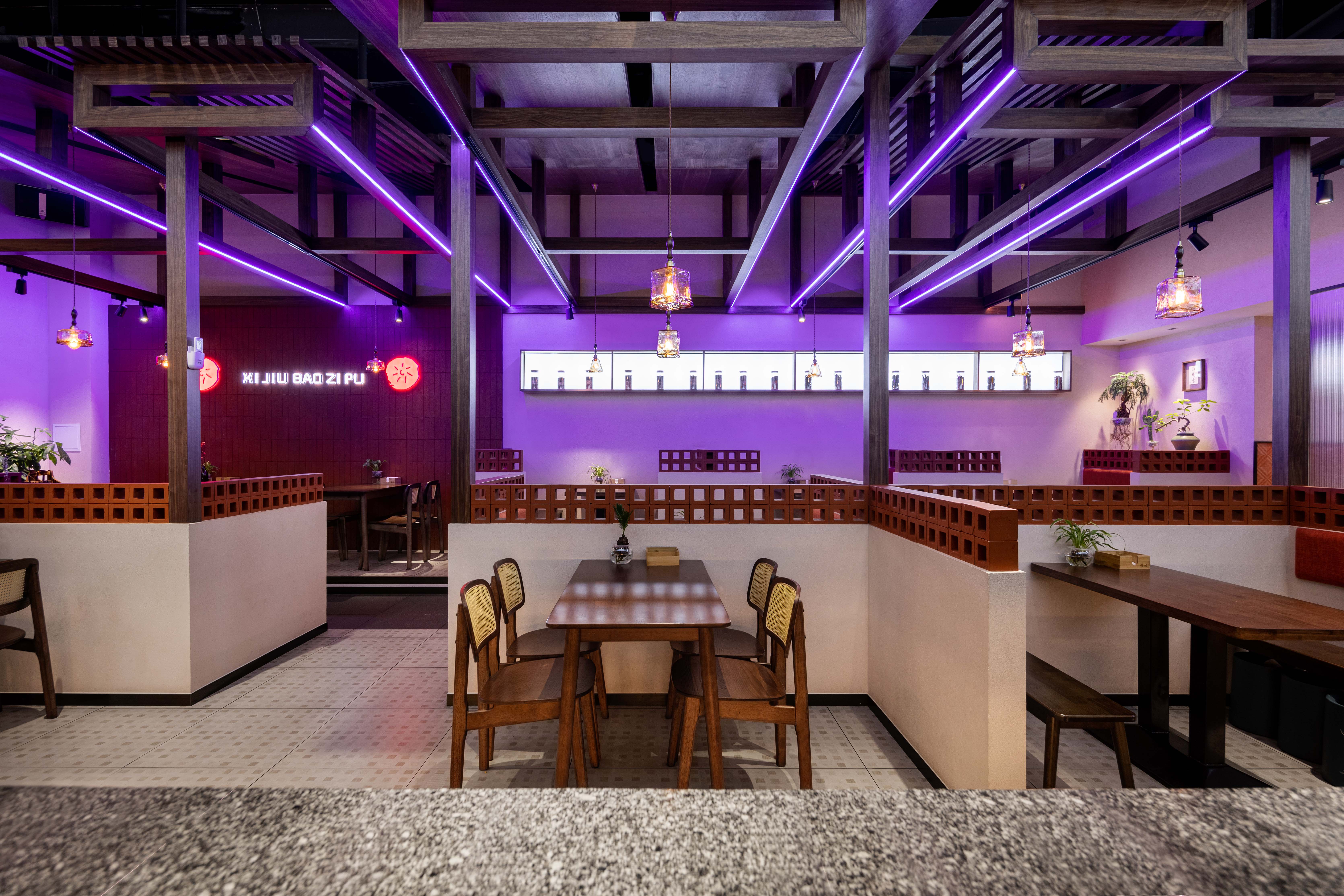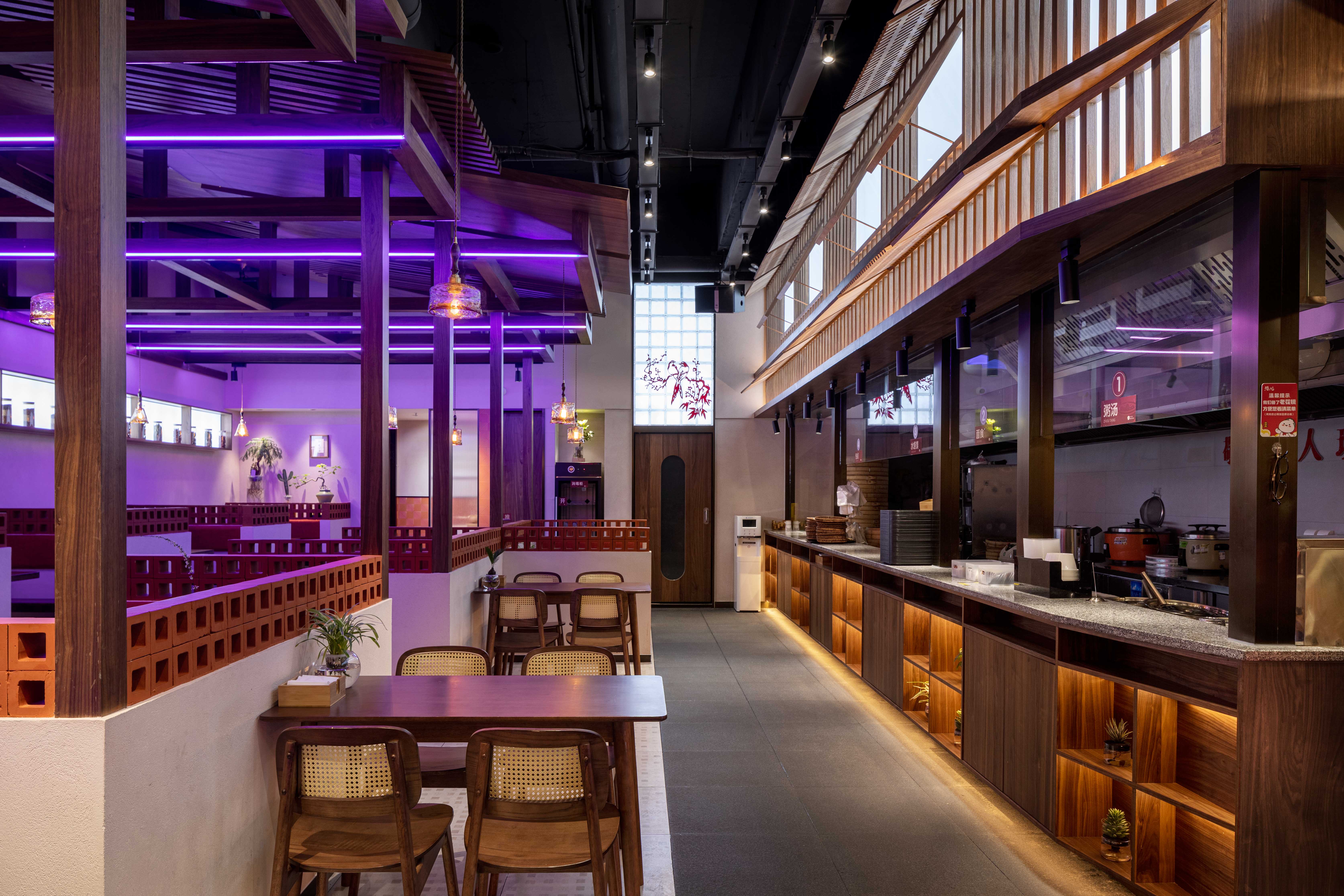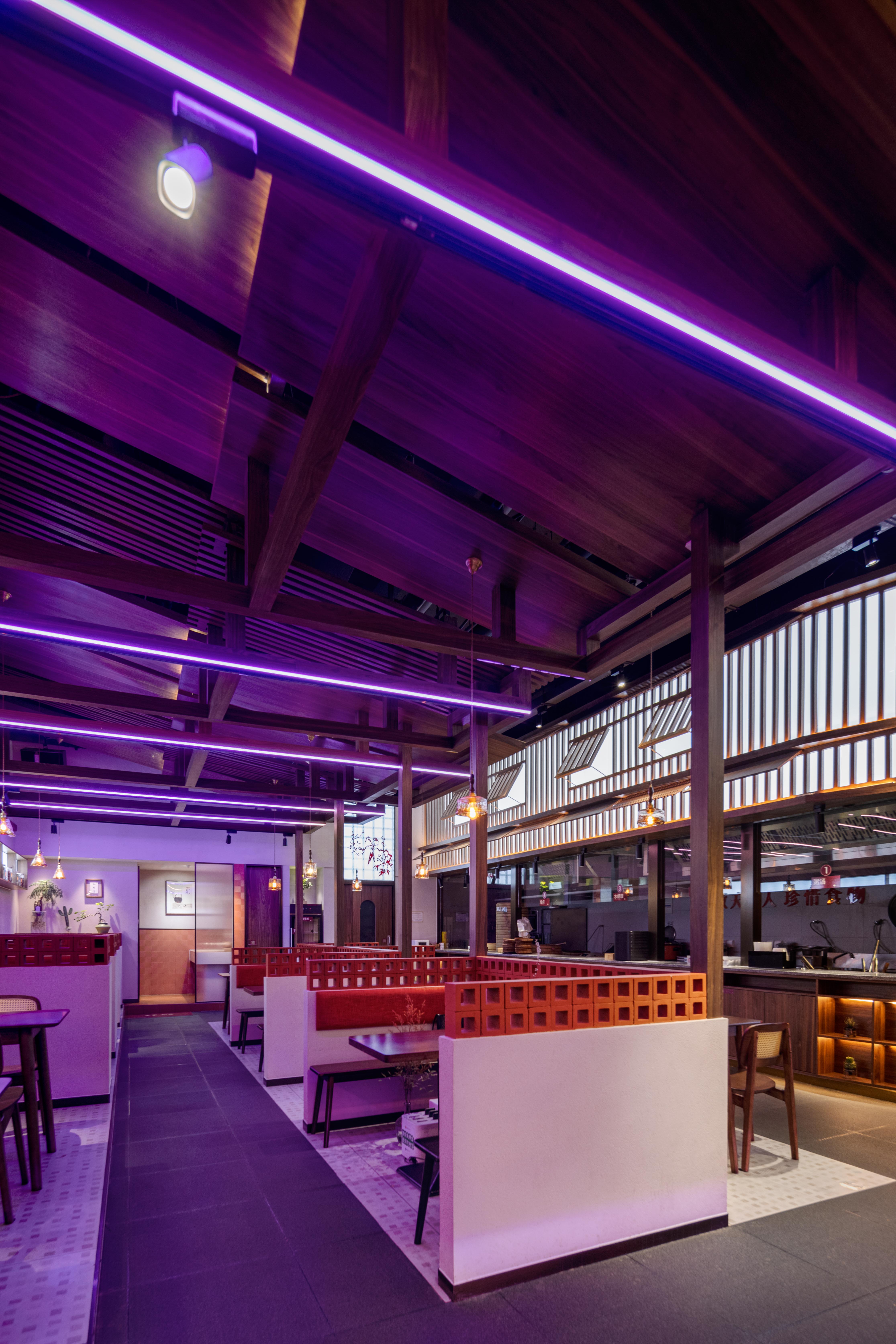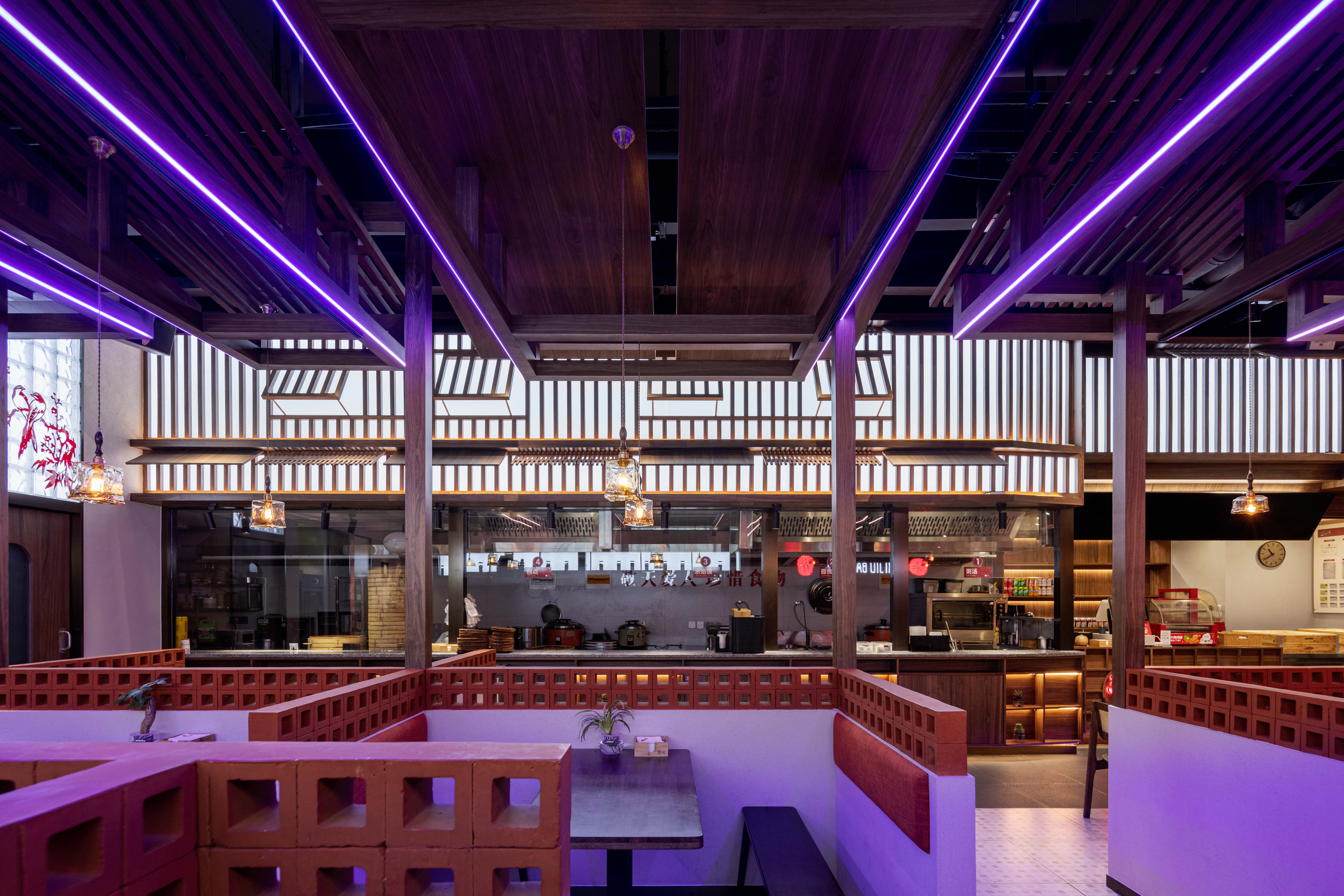 新现代中式 空间使用了大量木质廊架 与厨房上方造型格栅遥相呼应,同时木廊架与格栅融入各角度的线条灯,让空间更加立体,同时空间内使用了两套灯光系统,白天社区市井包子铺,晚间卤点酒水铺。优化空间维度的同时立体时间维度。暮色降临,蓝色的灯光对比的色彩,繁复有致的线条,未来感很强,抓住刹那间光的变化,格调清丽在云烟濛濛、有与无之间的美。