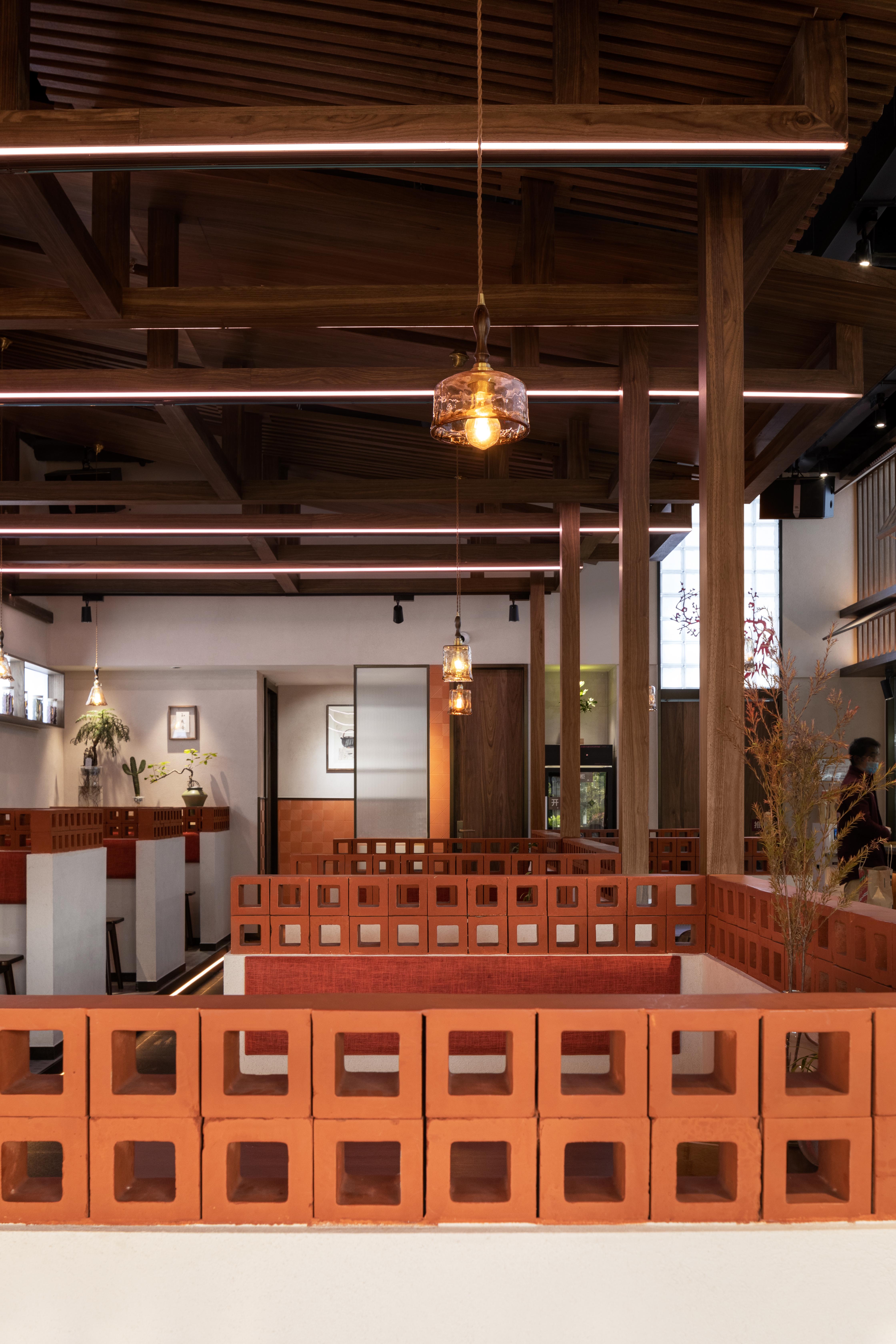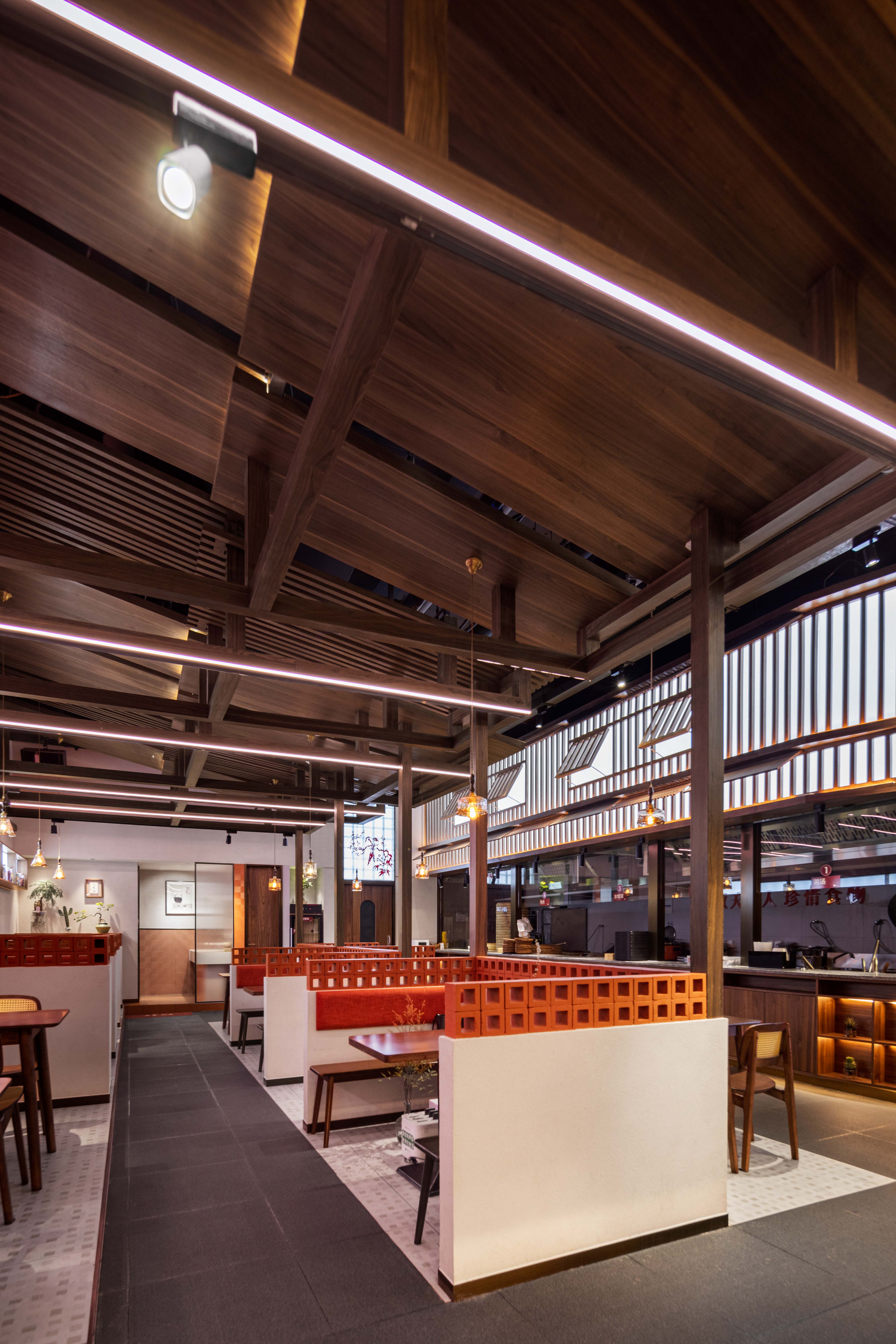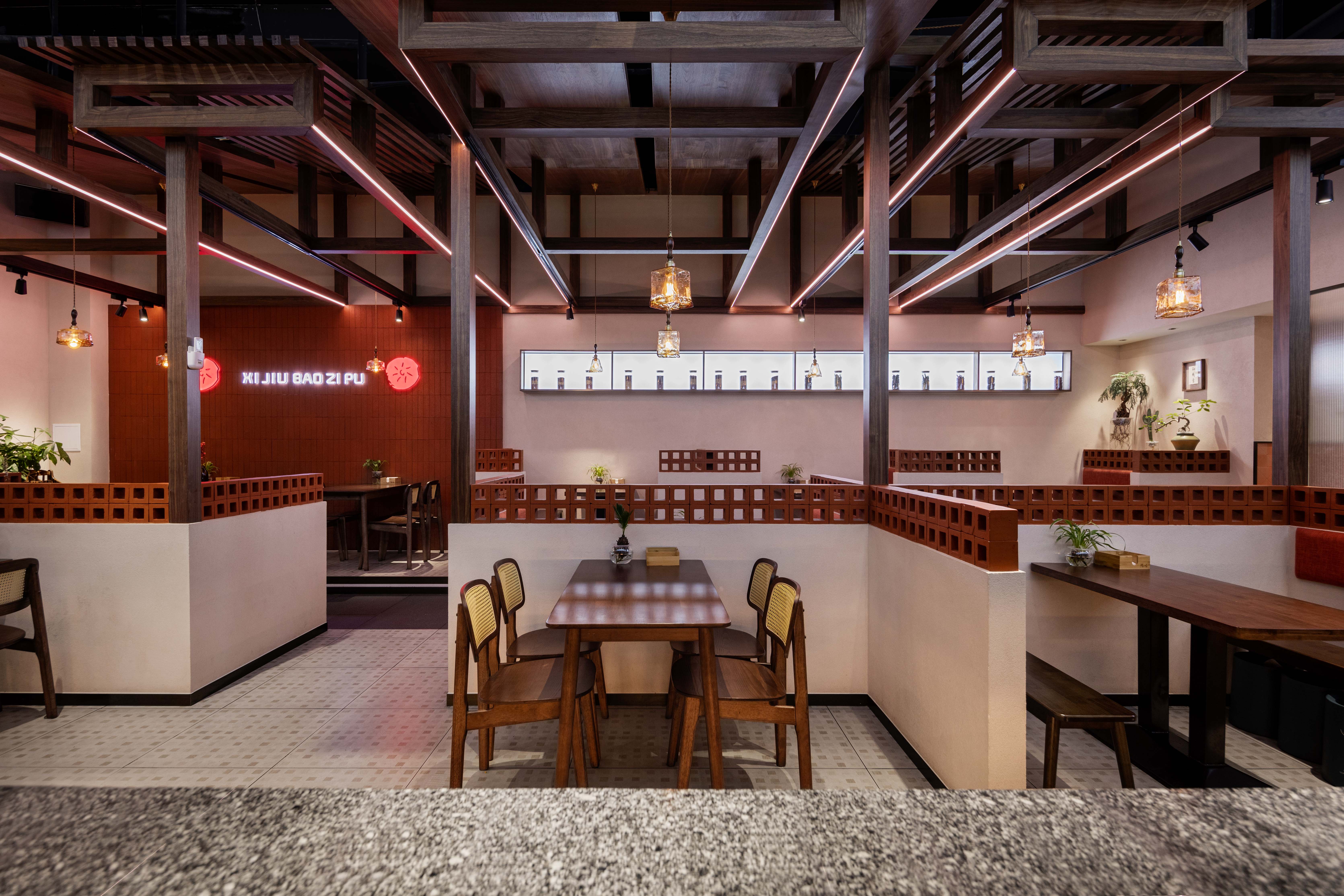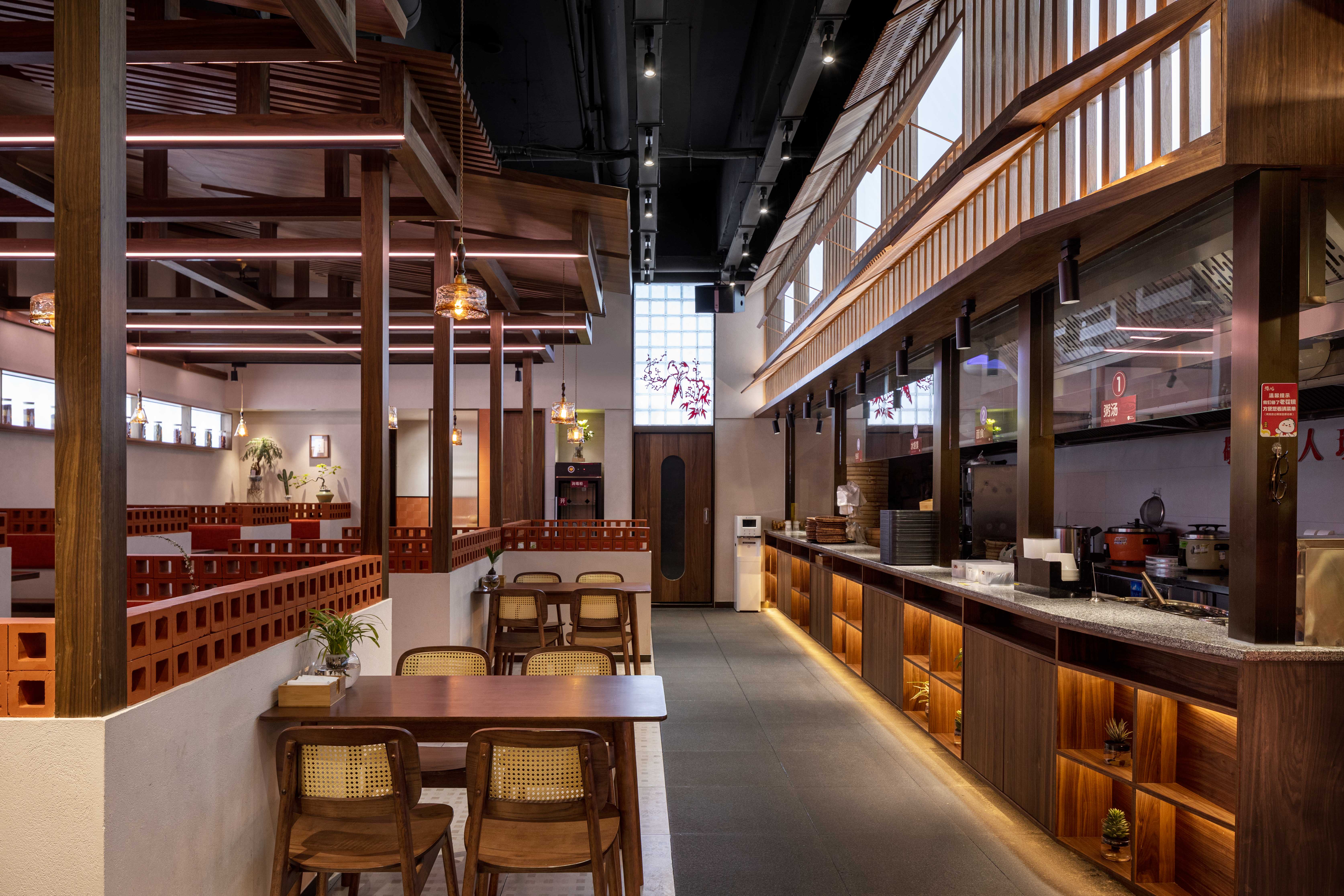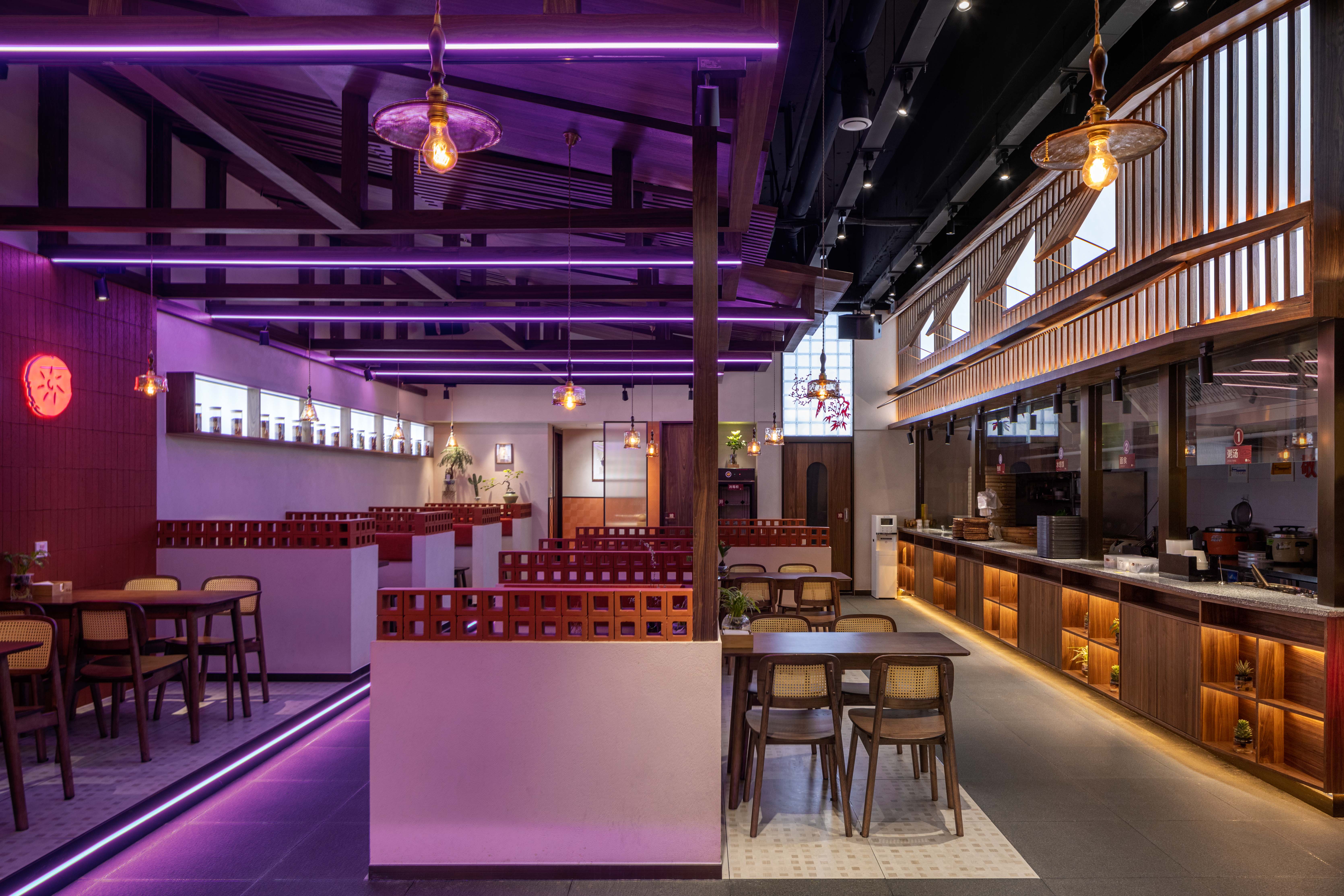 新现代中式 空间使用了大量木质廊架 与厨房上方造型格栅遥相呼应,同时木廊架与格栅融入各角度的线条灯,让空间更加立体,同时空间内使用了两套灯光系统,白天社区市井包子铺,晚间卤点酒水铺。优化空间维度的同时立体时间维度。暮色降临,蓝色的灯光对比的色彩,繁复有致的线条,未来感很强,抓住刹那间光的变化,格调清丽在云烟濛濛、有与无之间的美。