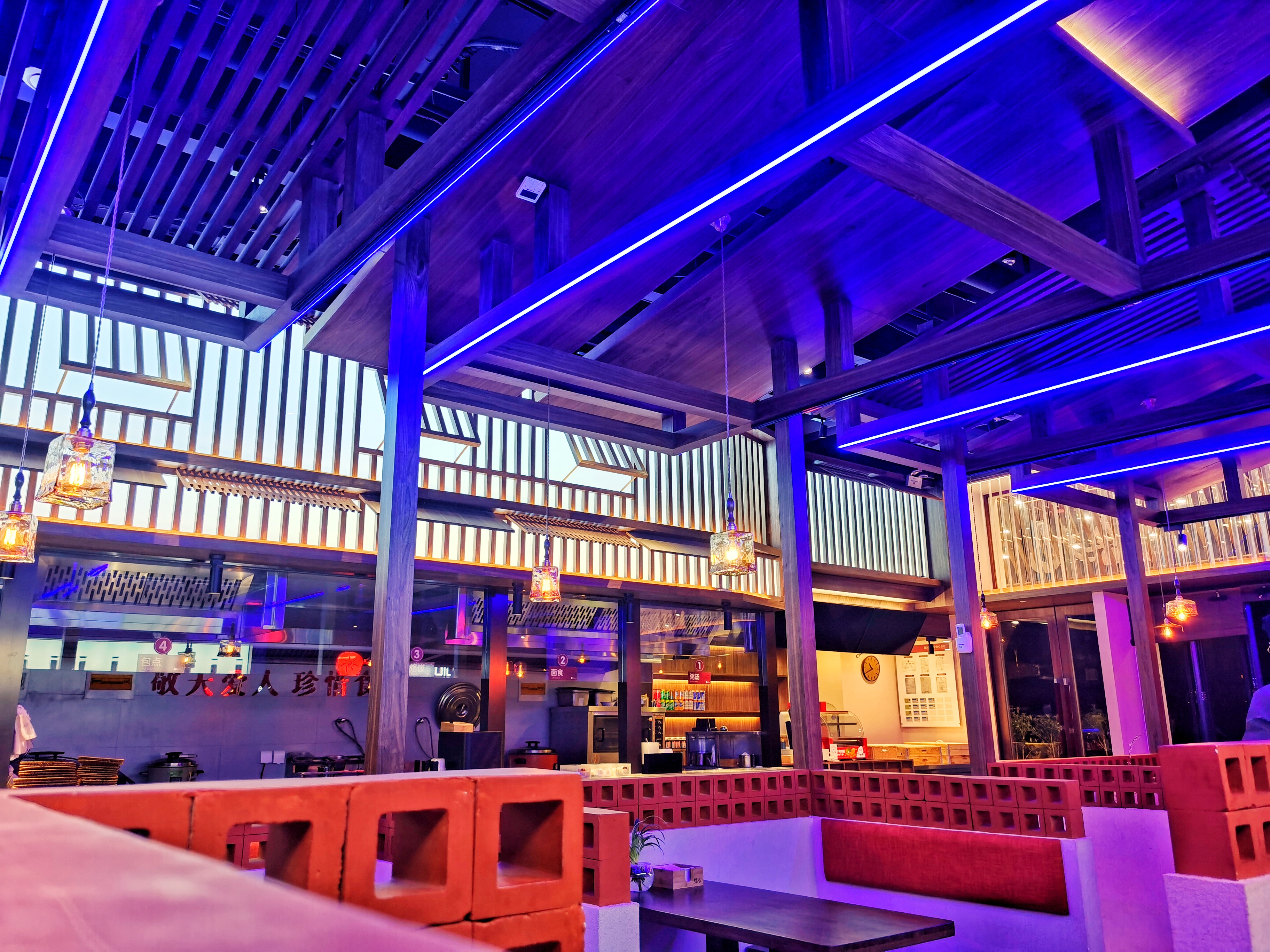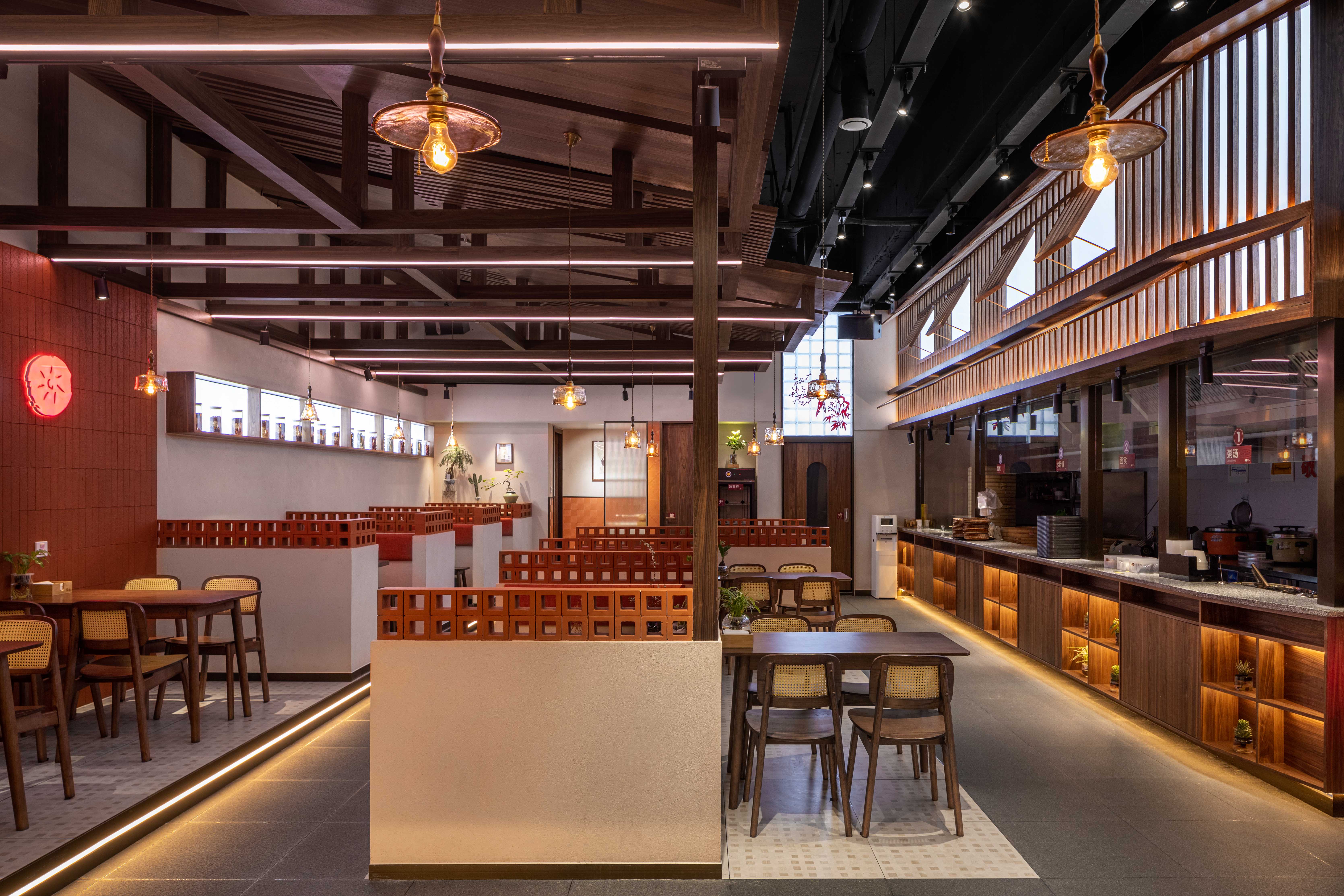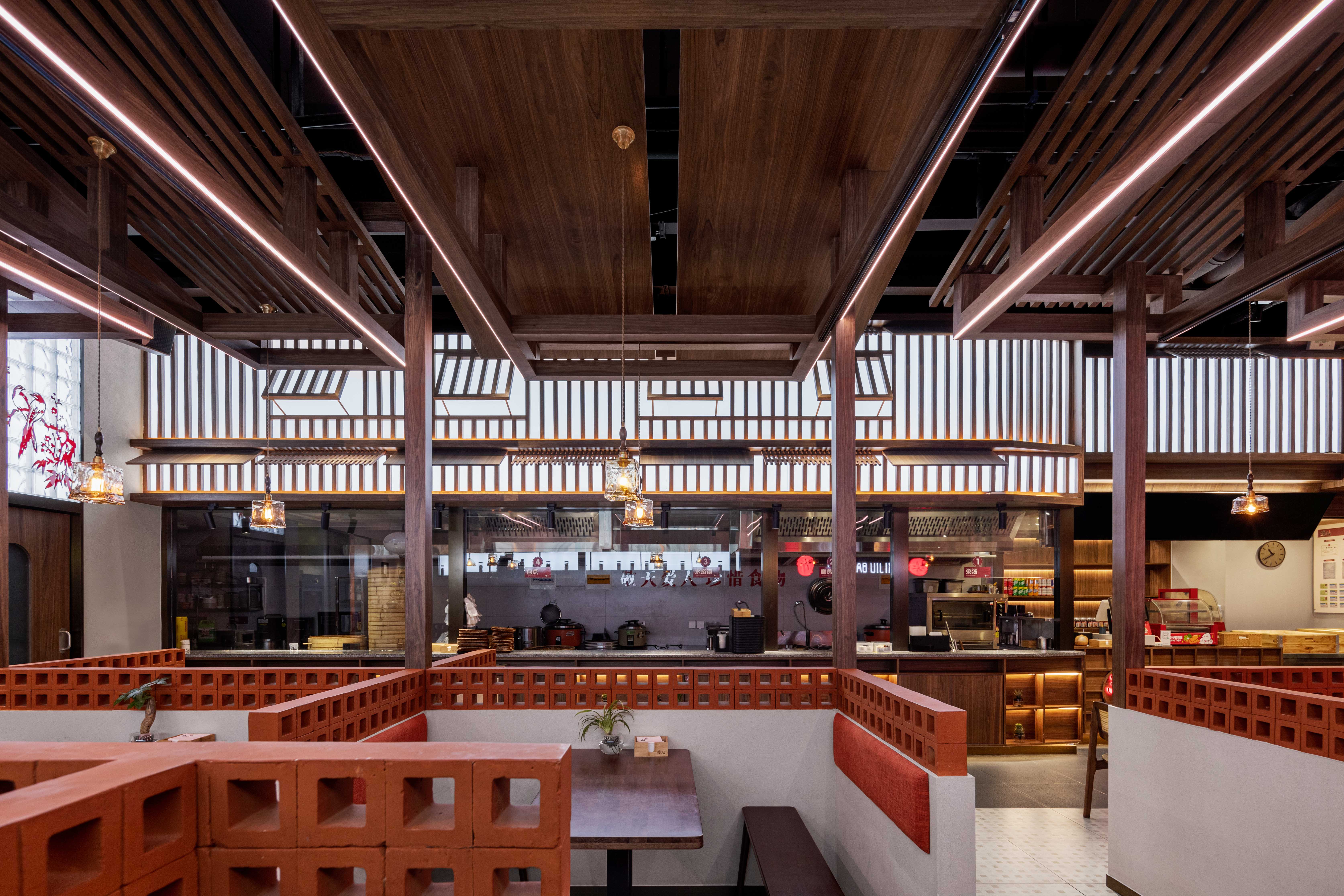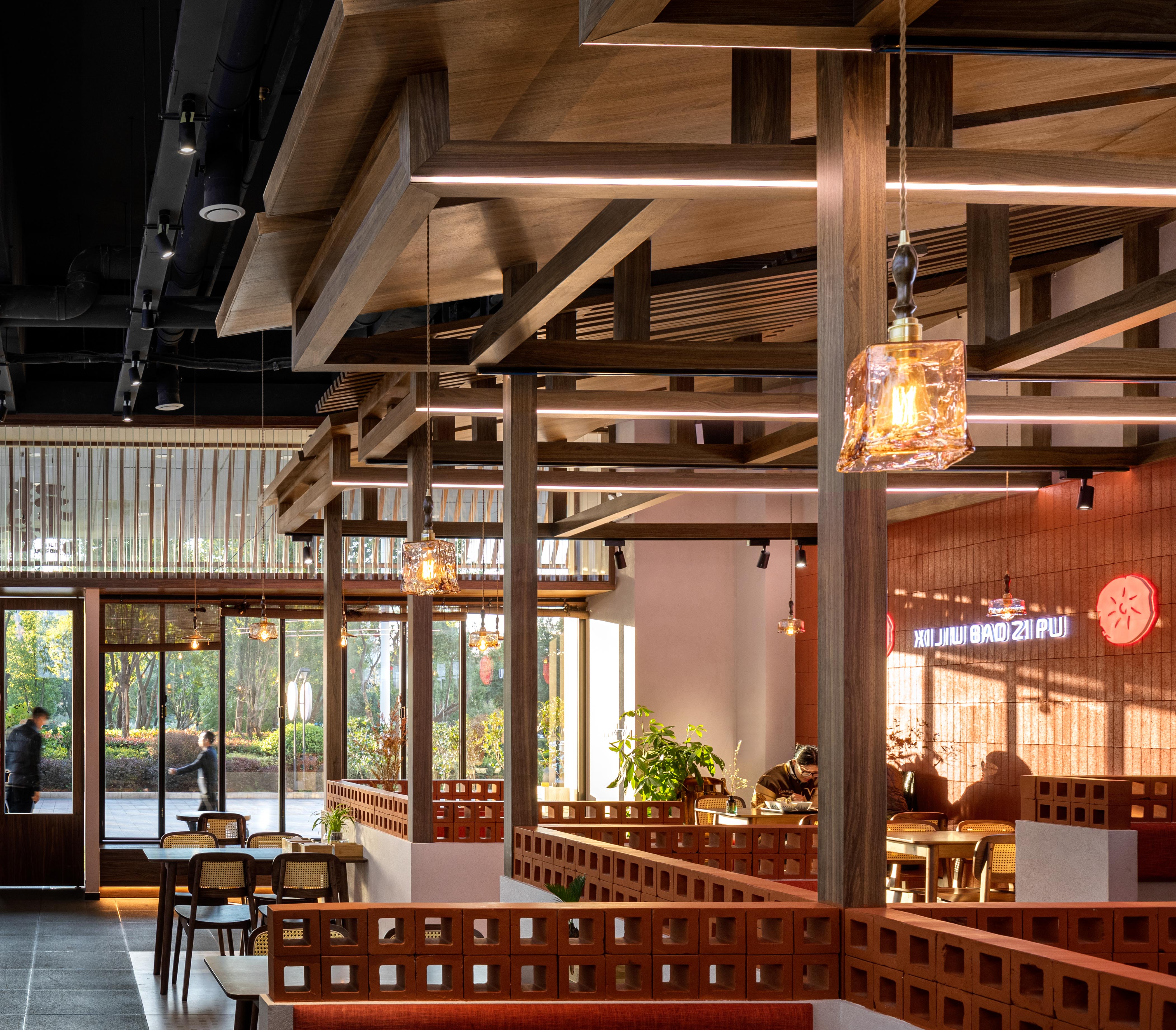 新现代中式 空间使用了大量木质廊架 与厨房上方造型格栅遥相呼应,同时木廊架与格栅融入各角度的线条灯,让空间更加立体,同时空间内使用了两套灯光系统,白天社区市井包子铺,晚间卤点酒水铺。优化空间维度的同时立体时间维度。暮色降临,蓝色的灯光对比的色彩,繁复有致的线条,未来感很强,抓住刹那间光的变化,格调清丽在云烟濛濛、有与无之间的美。