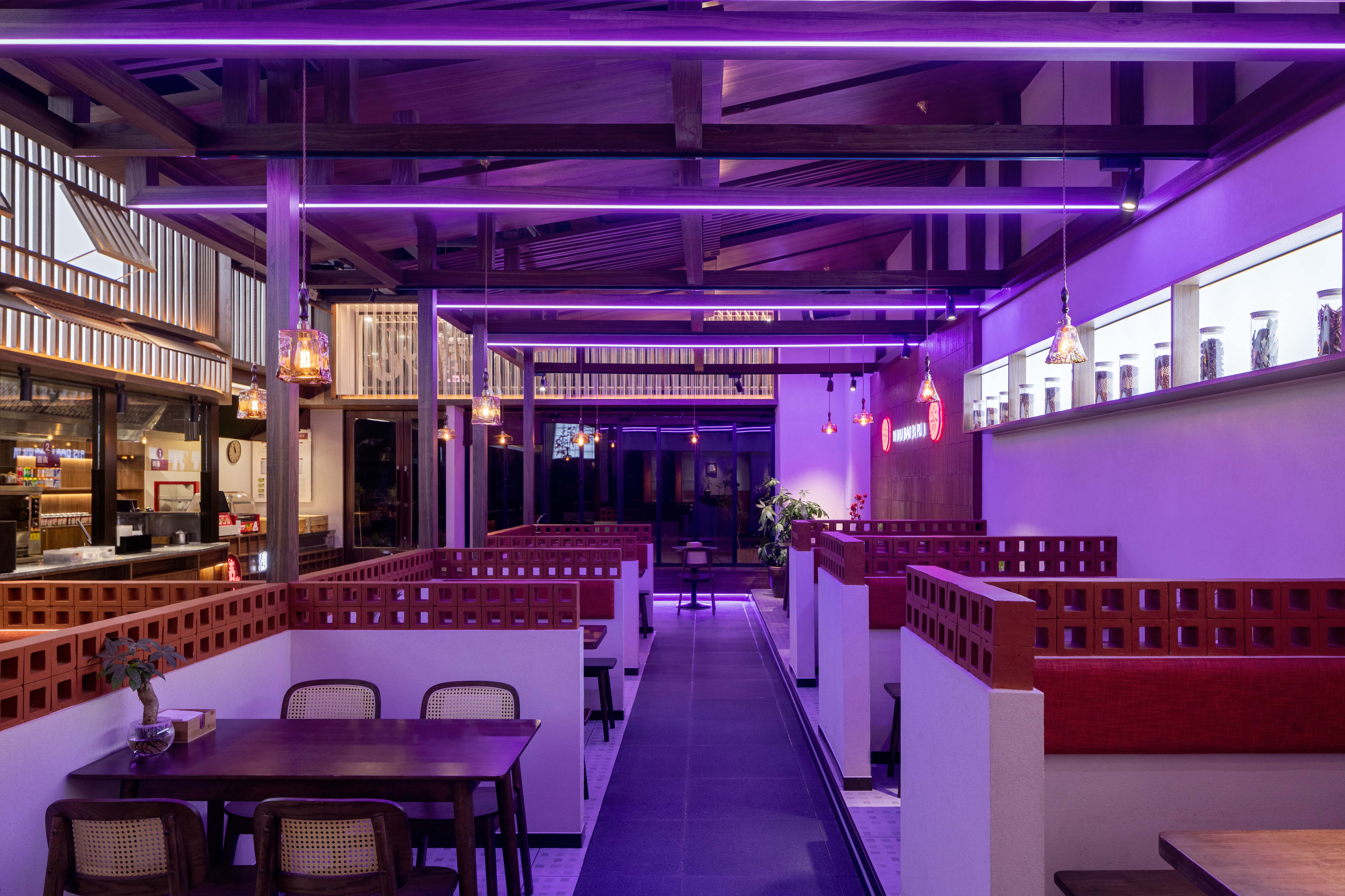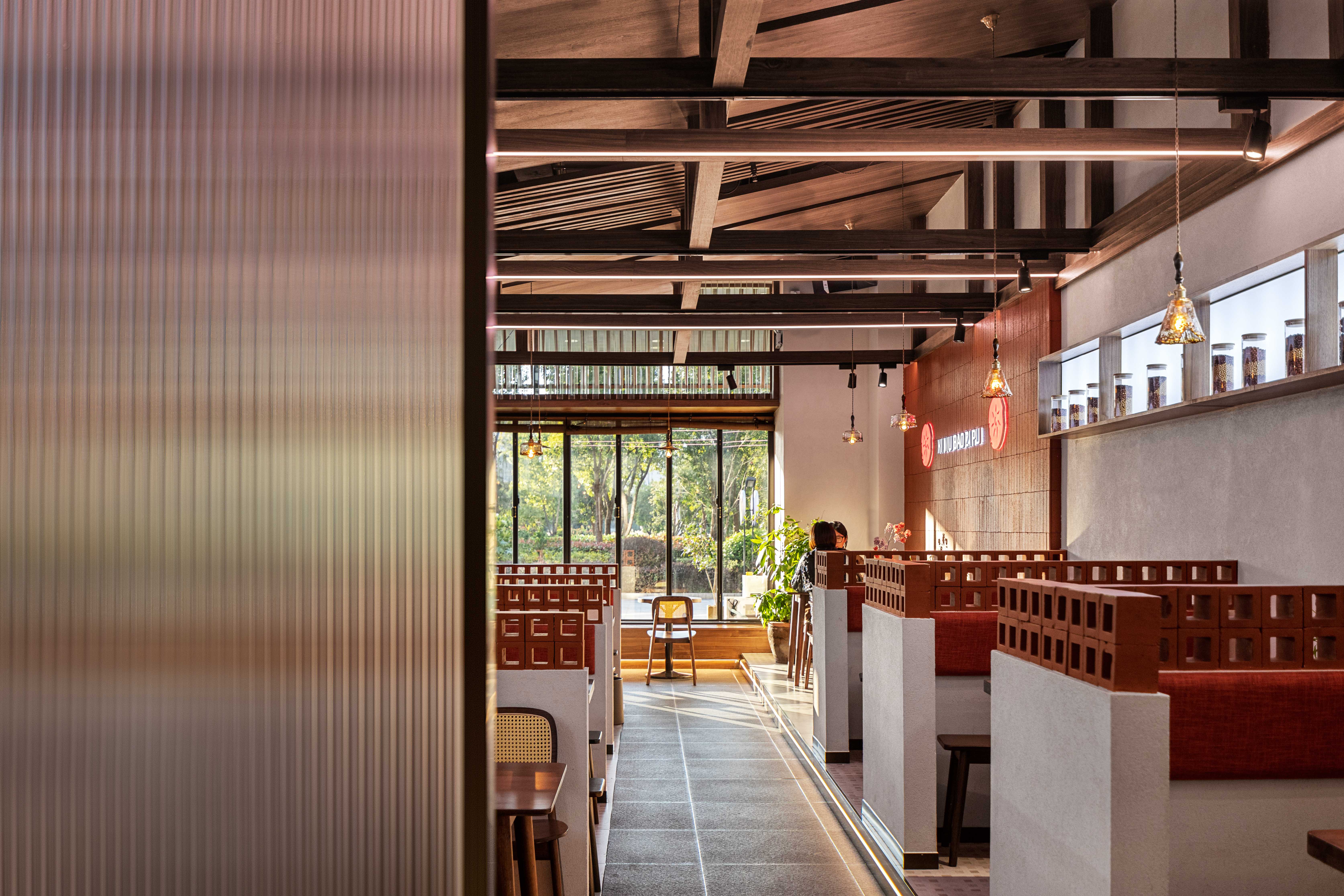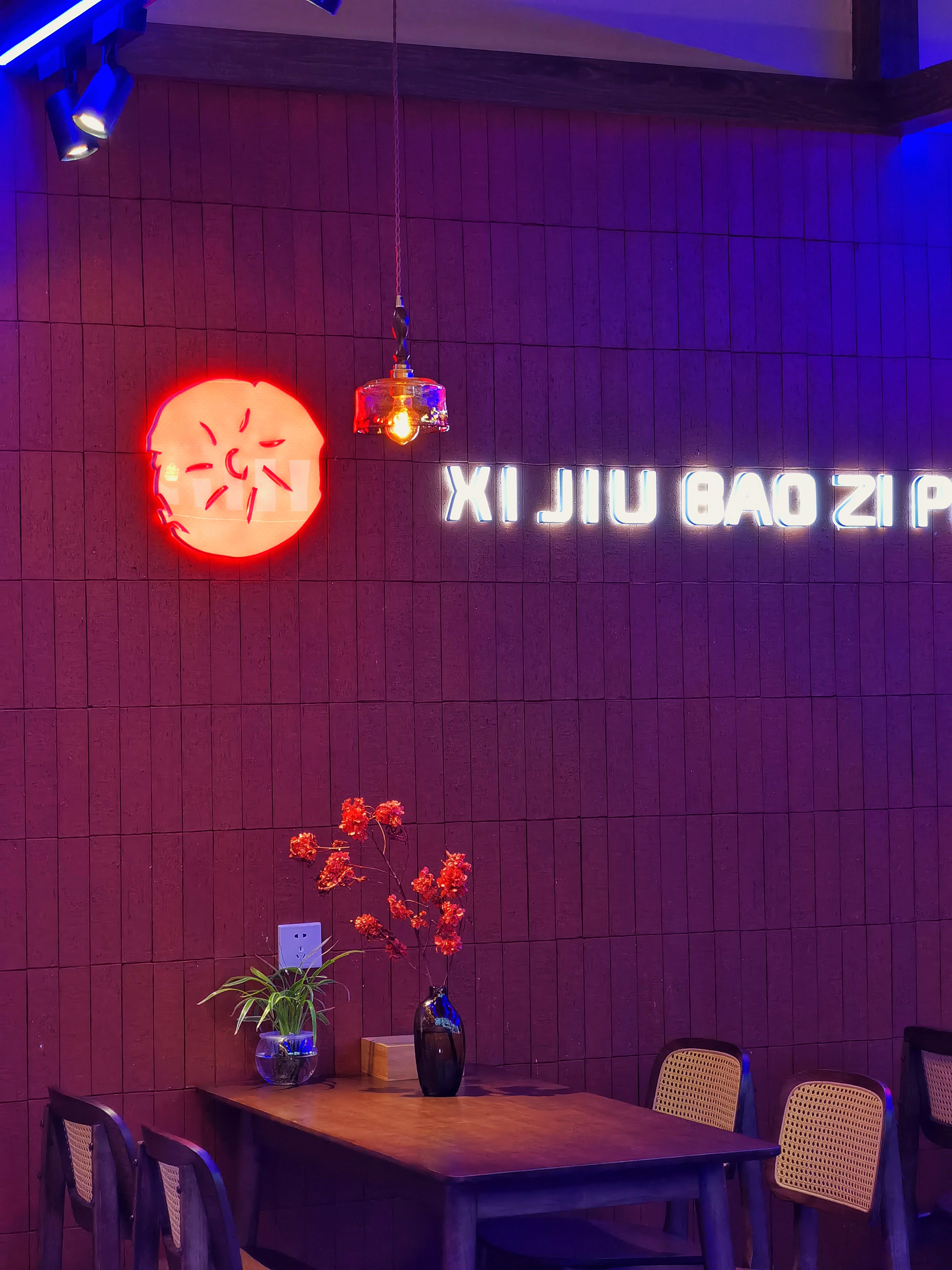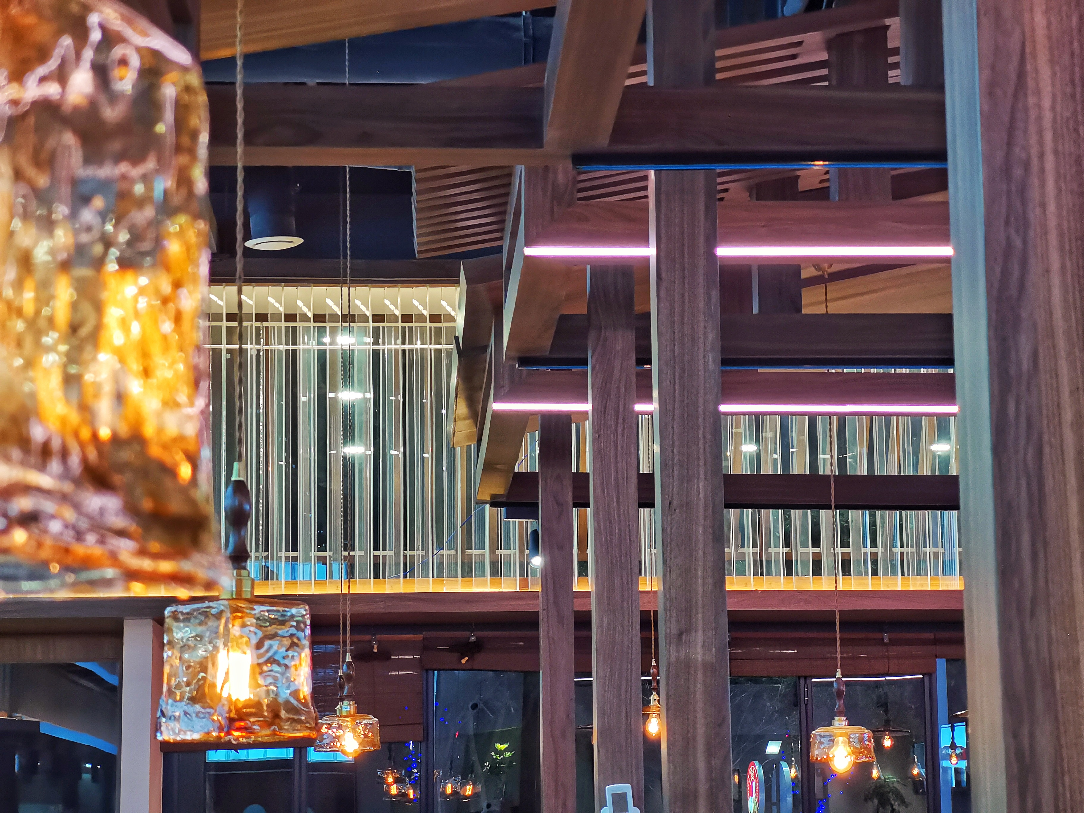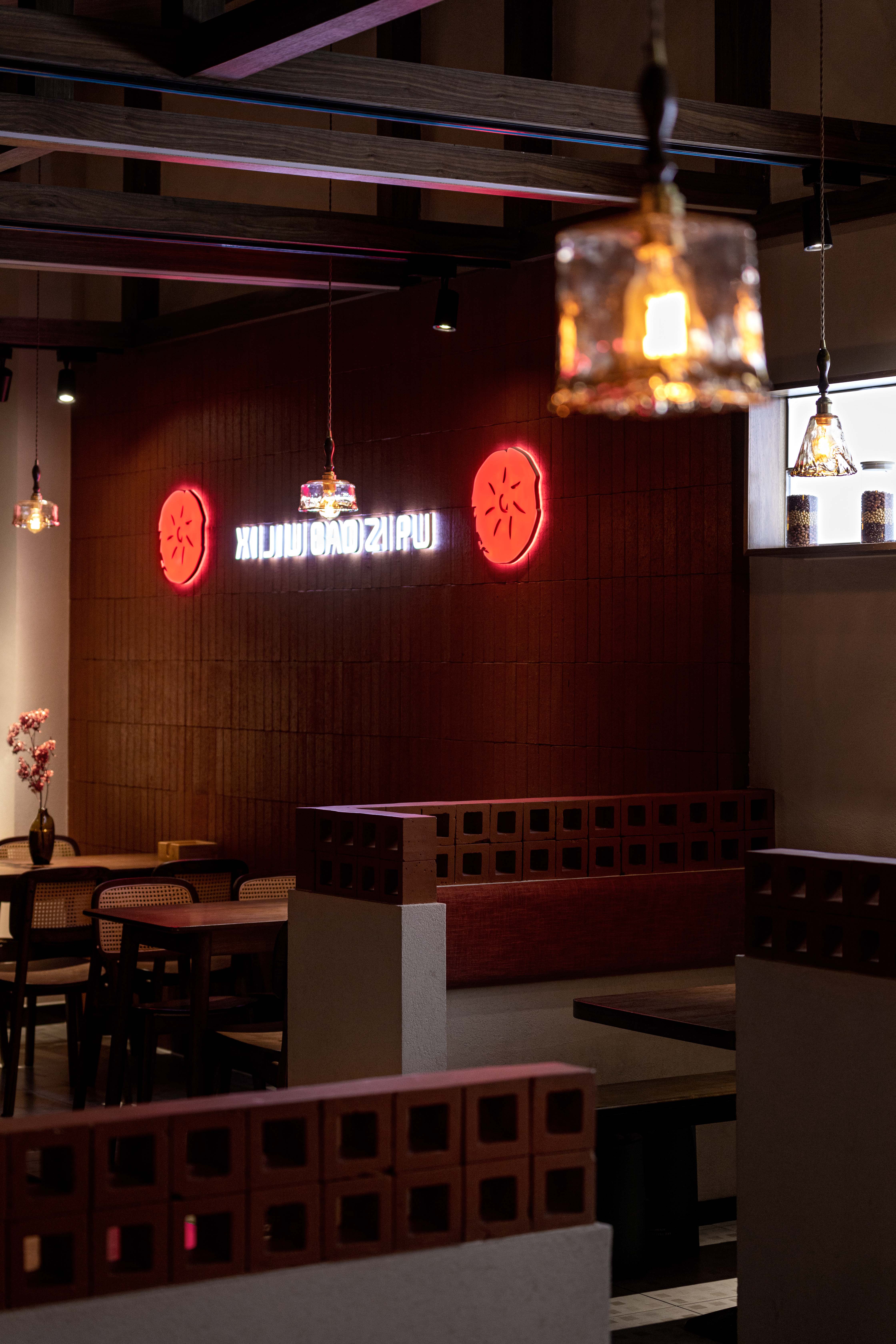 新现代中式 空间使用了大量木质廊架 与厨房上方造型格栅遥相呼应,同时木廊架与格栅融入各角度的线条灯,让空间更加立体,同时空间内使用了两套灯光系统,白天社区市井包子铺,晚间卤点酒水铺。优化空间维度的同时立体时间维度。暮色降临,蓝色的灯光对比的色彩,繁复有致的线条,未来感很强,抓住刹那间光的变化,格调清丽在云烟濛濛、有与无之间的美。
