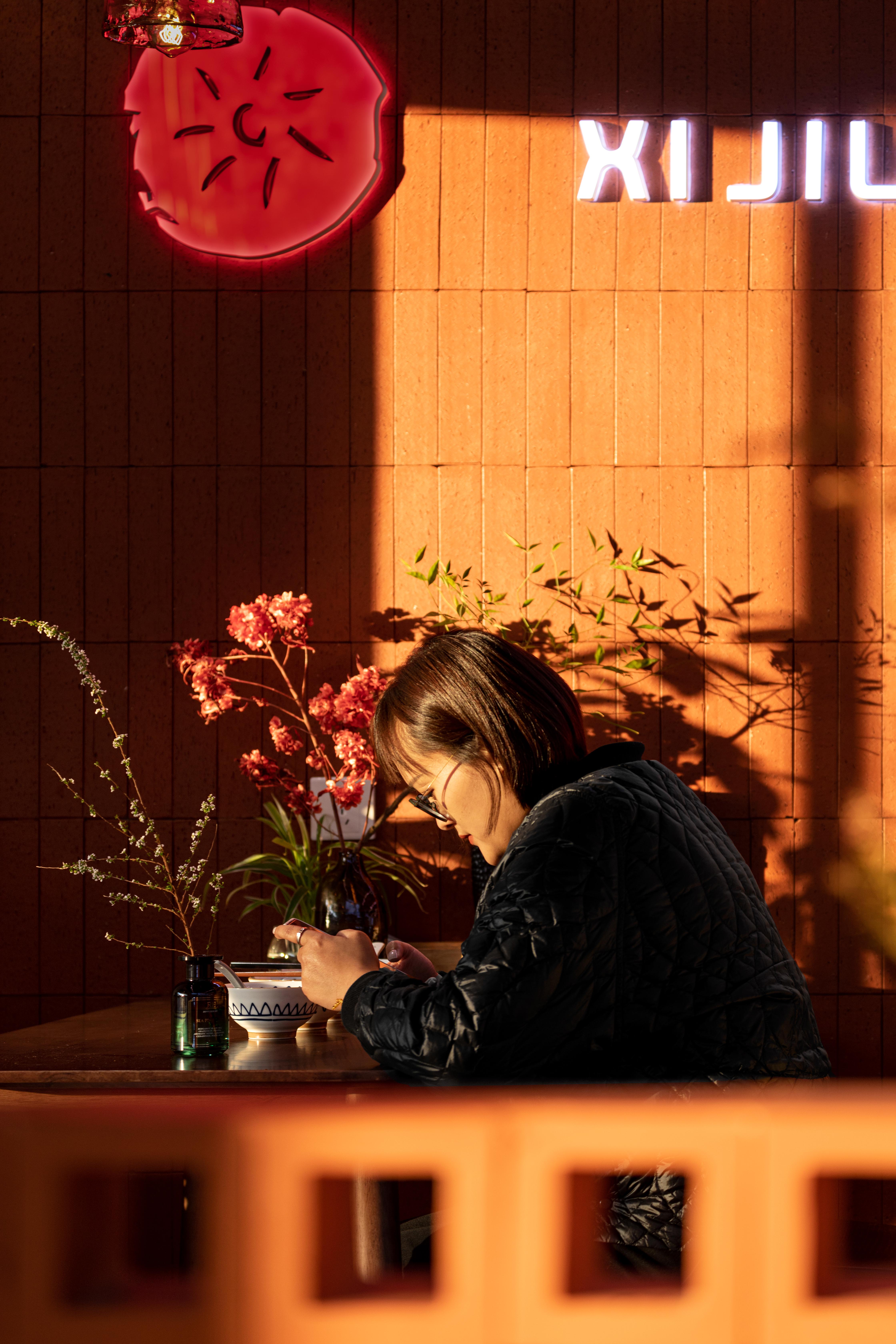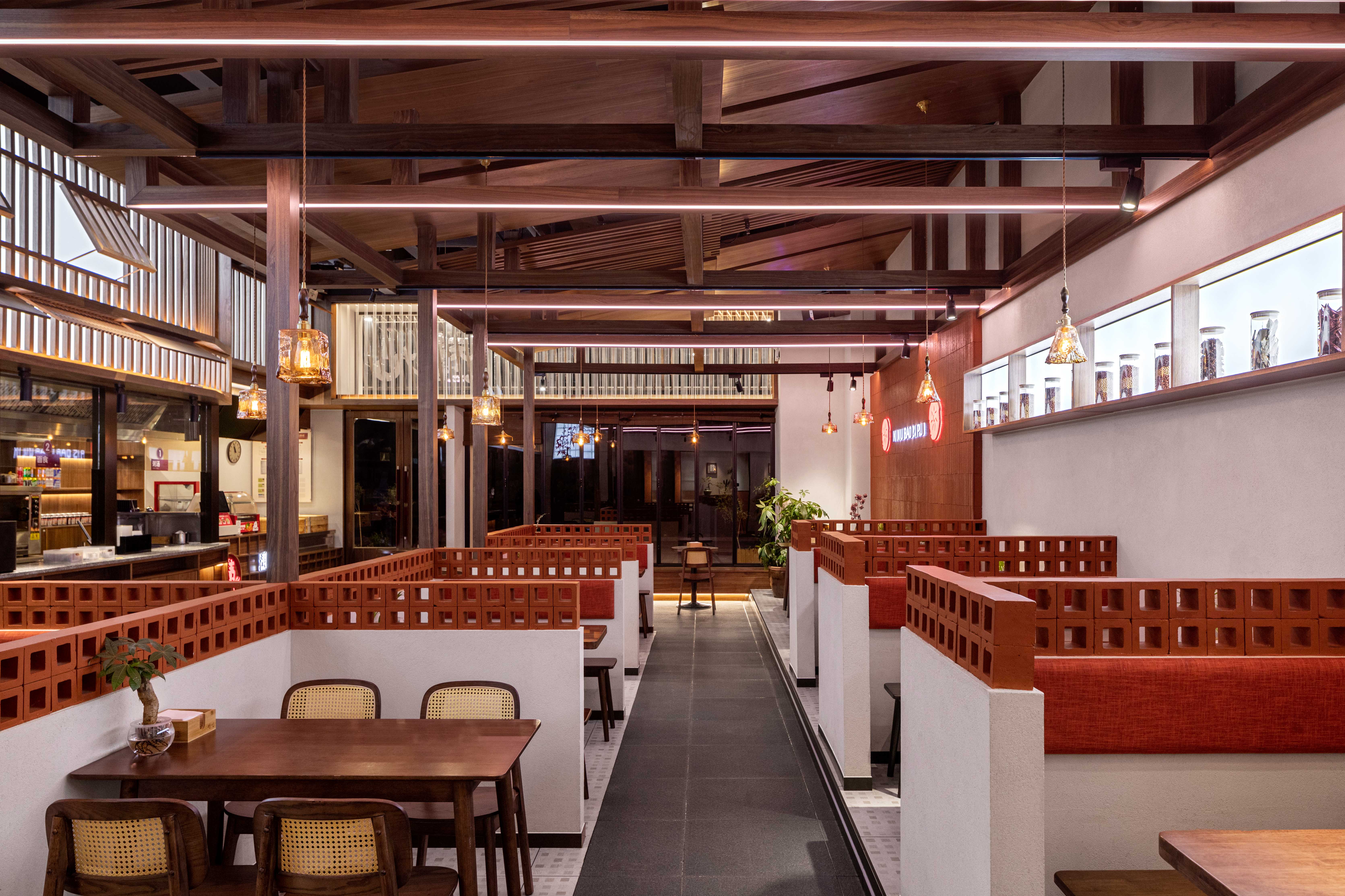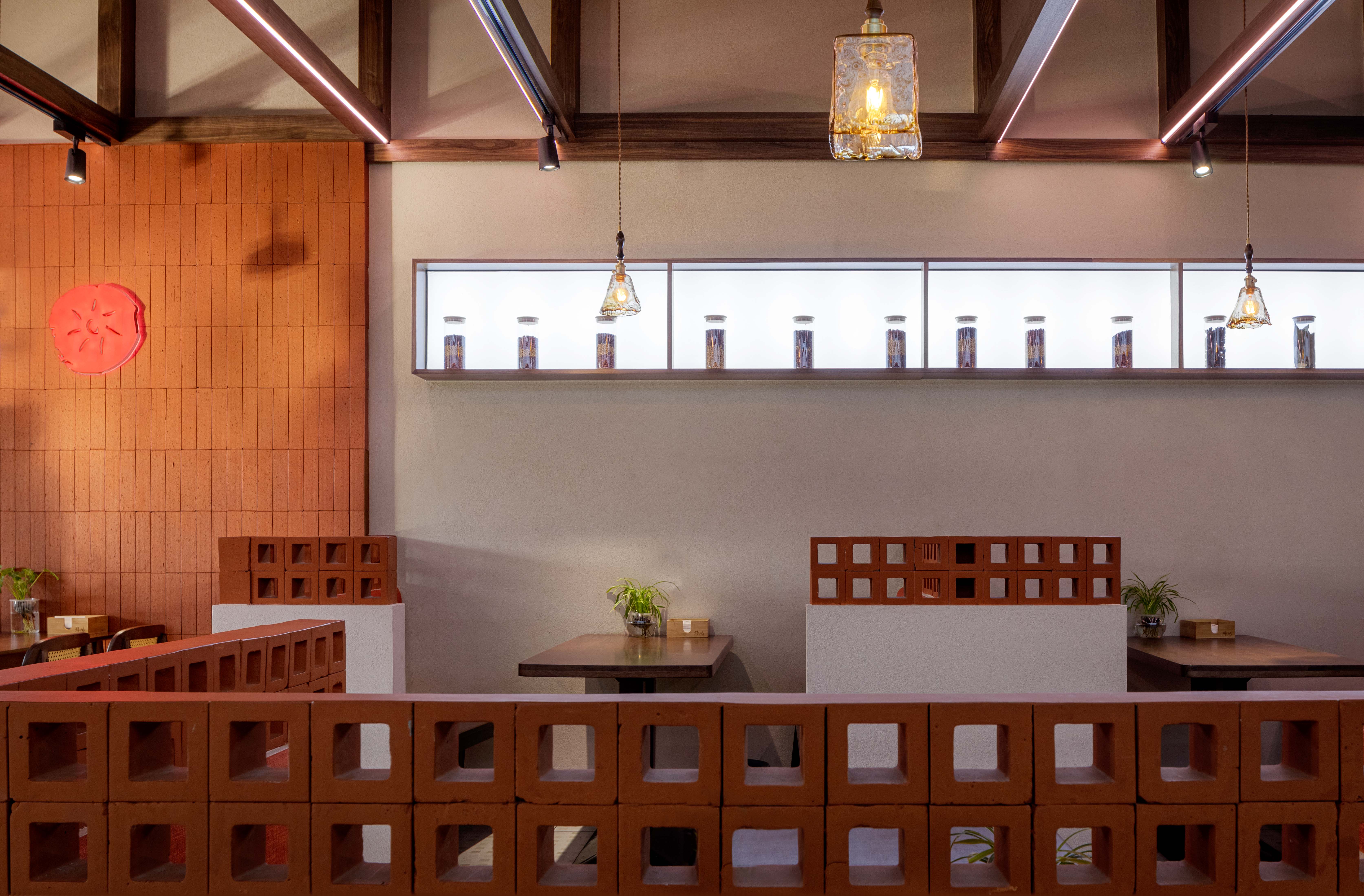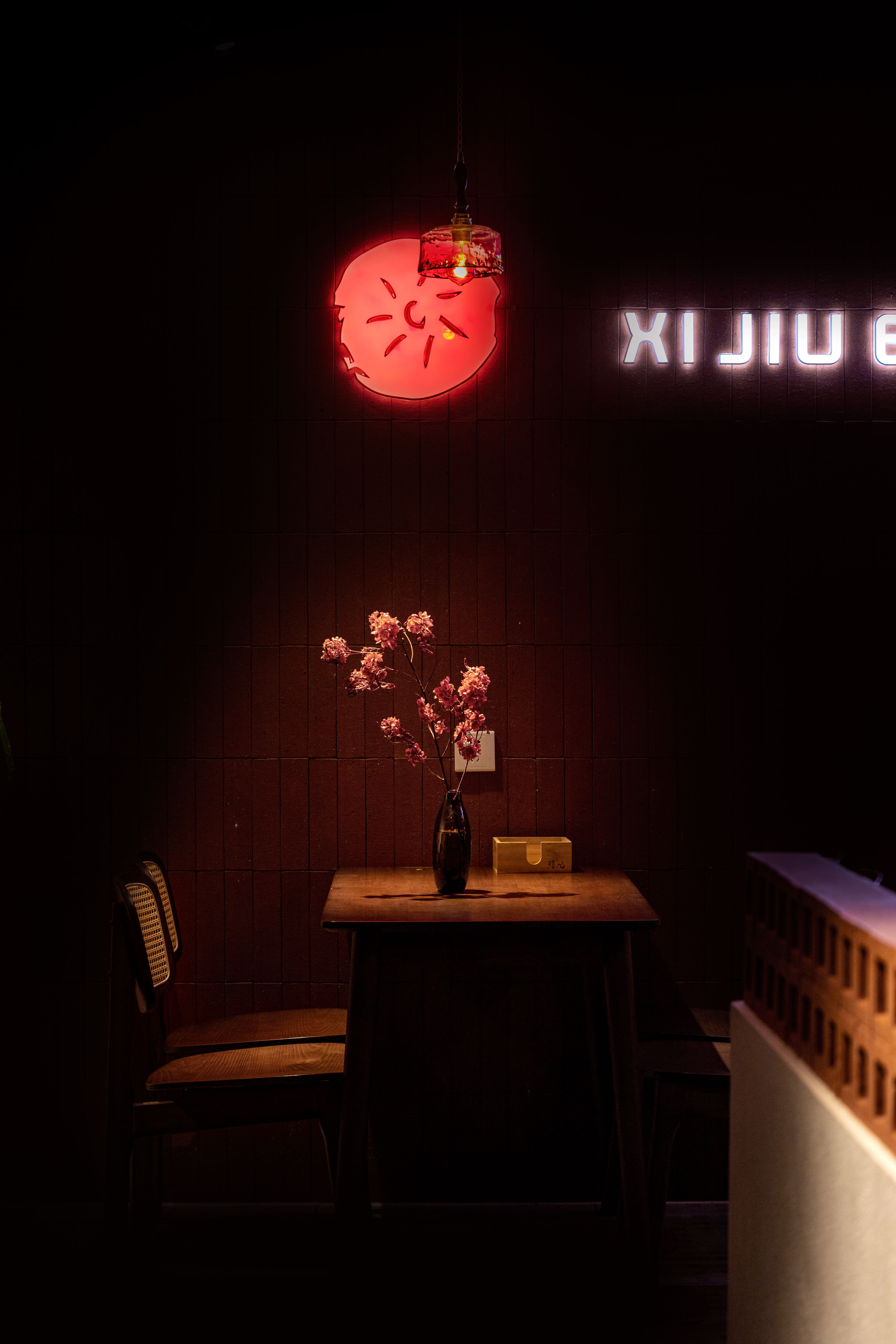 新现代中式 空间使用了大量木质廊架 与厨房上方造型格栅遥相呼应,同时木廊架与格栅融入各角度的线条灯,让空间更加立体,同时空间内使用了两套灯光系统,白天社区市井包子铺,晚间卤点酒水铺。优化空间维度的同时立体时间维度。暮色降临,蓝色的灯光对比的色彩,繁复有致的线条,未来感很强,抓住刹那间光的变化,格调清丽在云烟濛濛、有与无之间的美。