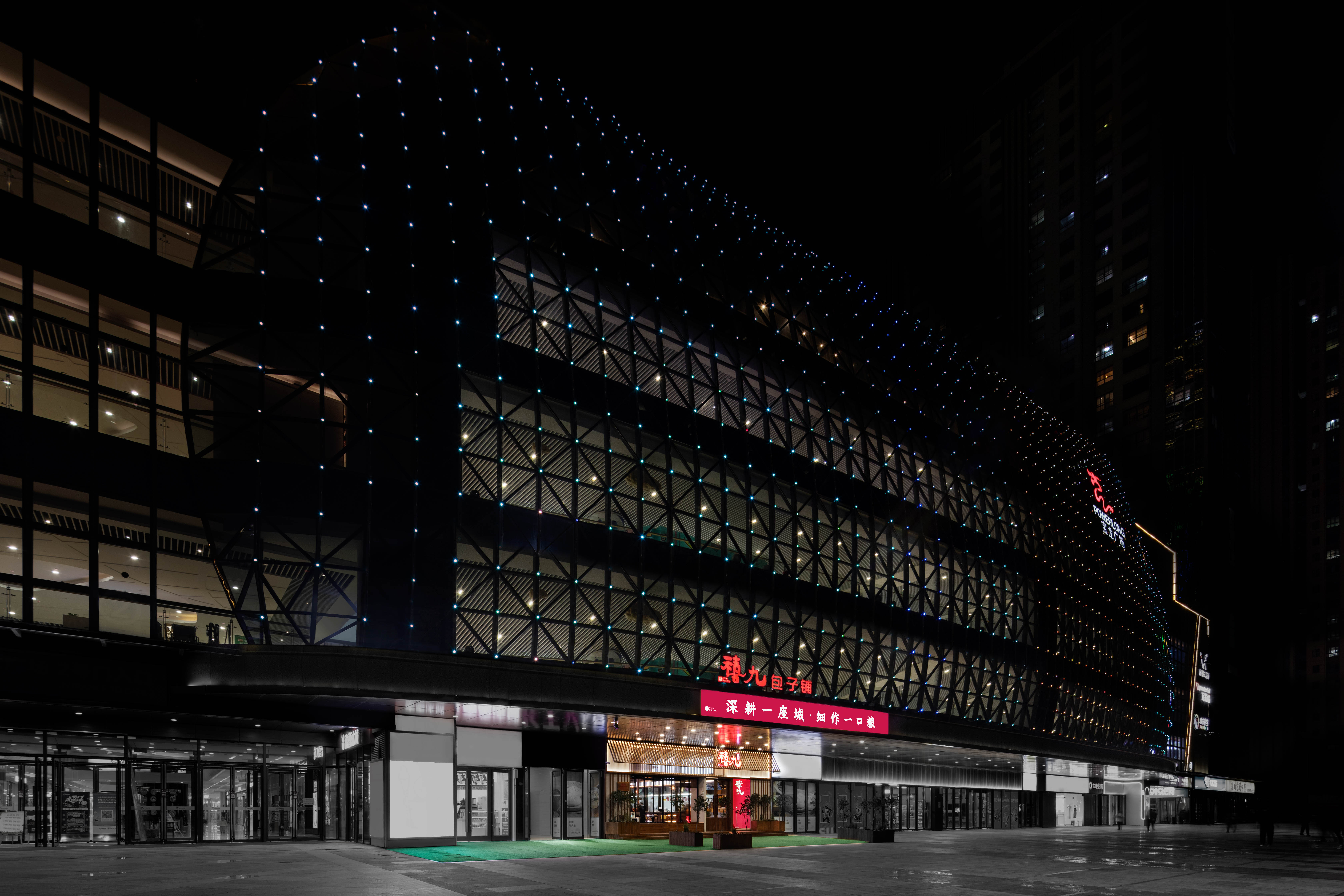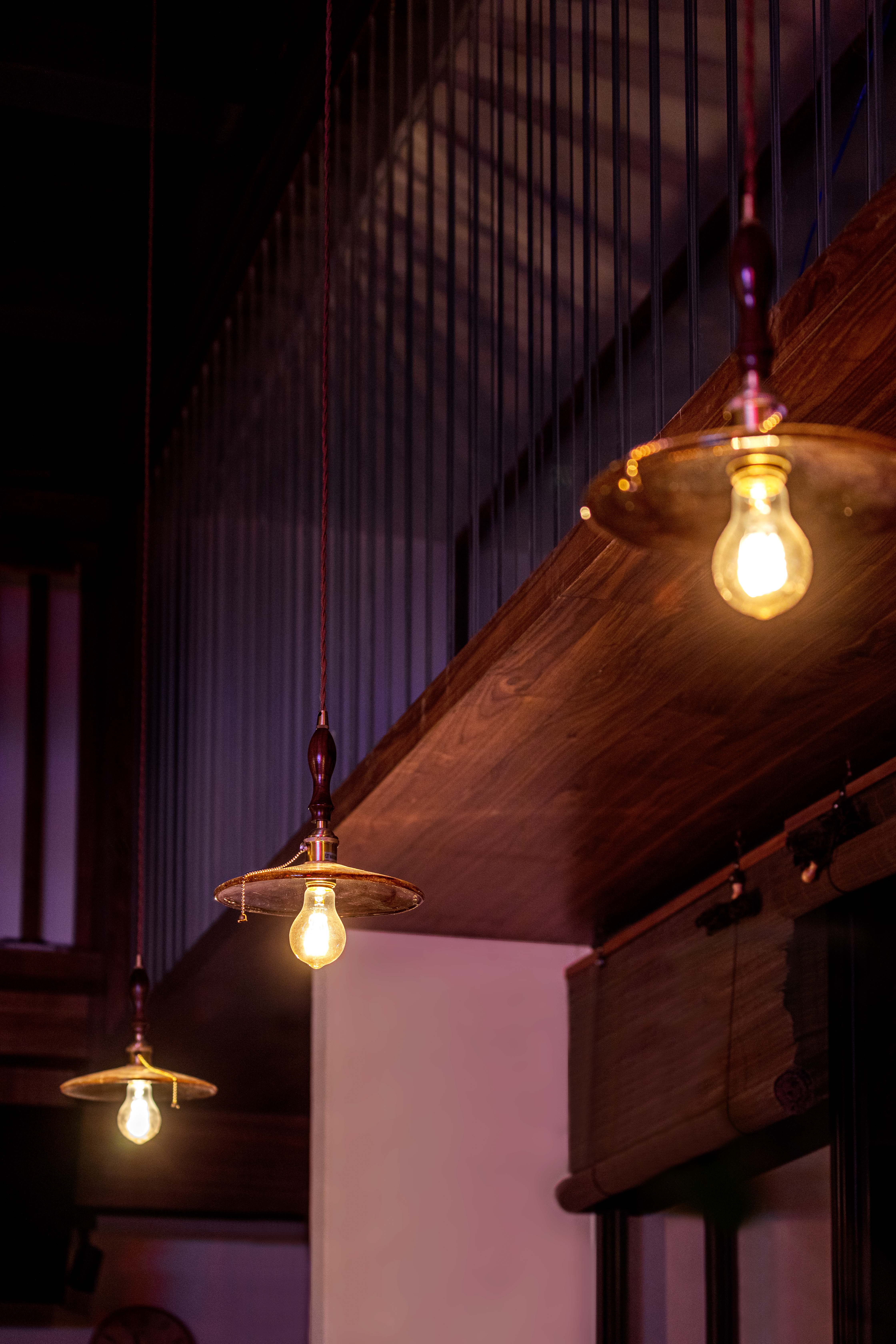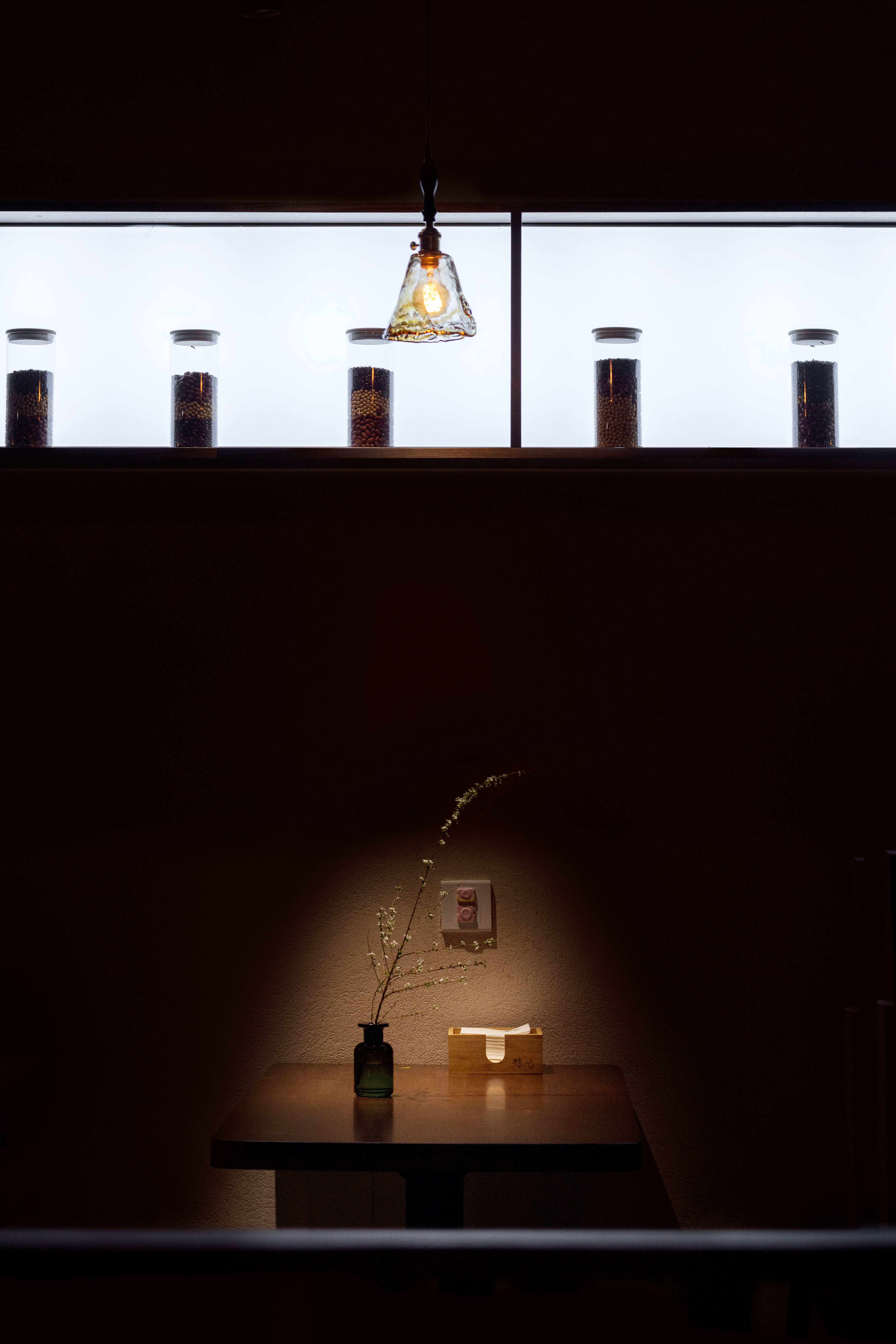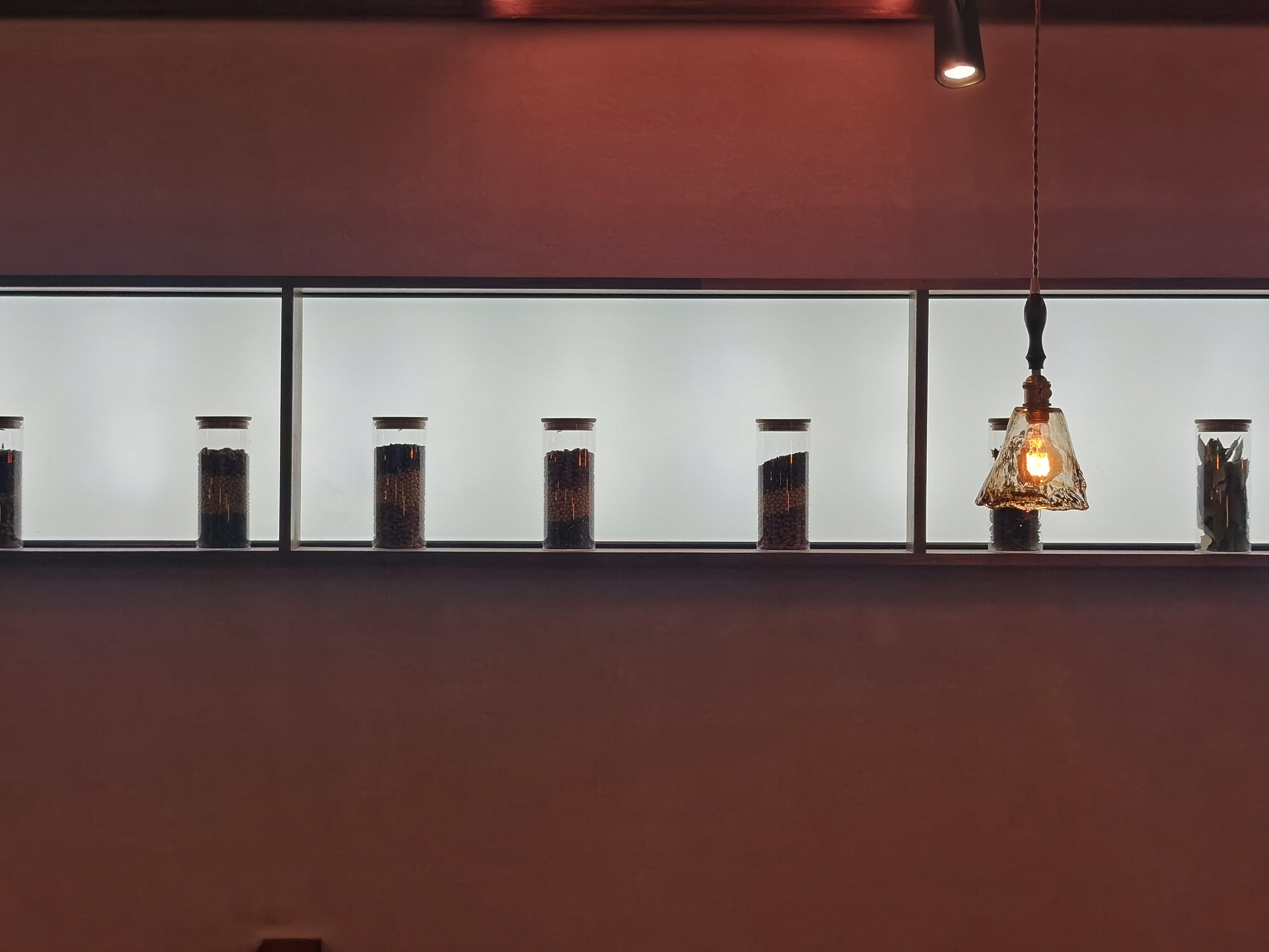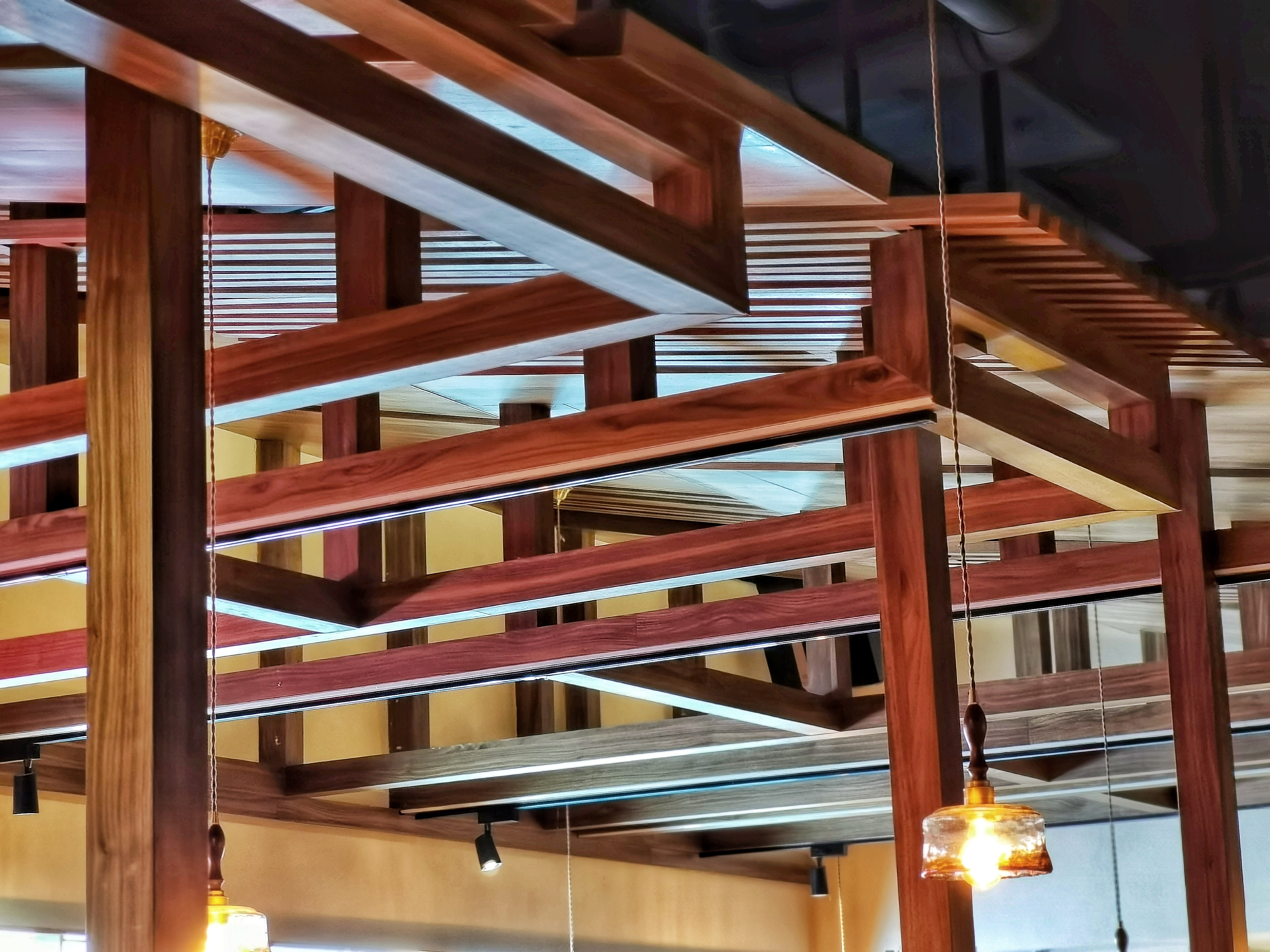 新现代中式 空间使用了大量木质廊架 与厨房上方造型格栅遥相呼应,同时木廊架与格栅融入各角度的线条灯,让空间更加立体,同时空间内使用了两套灯光系统,白天社区市井包子铺,晚间卤点酒水铺。优化空间维度的同时立体时间维度。暮色降临,蓝色的灯光对比的色彩,繁复有致的线条,未来感很强,抓住刹那间光的变化,格调清丽在云烟濛濛、有与无之间的美。