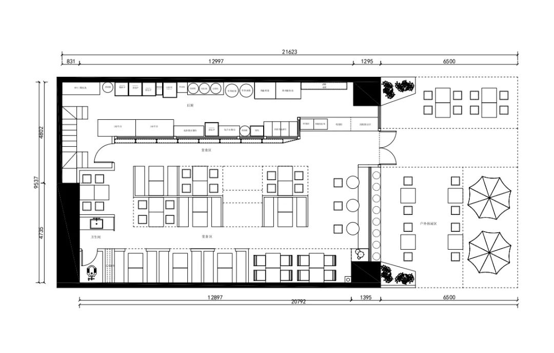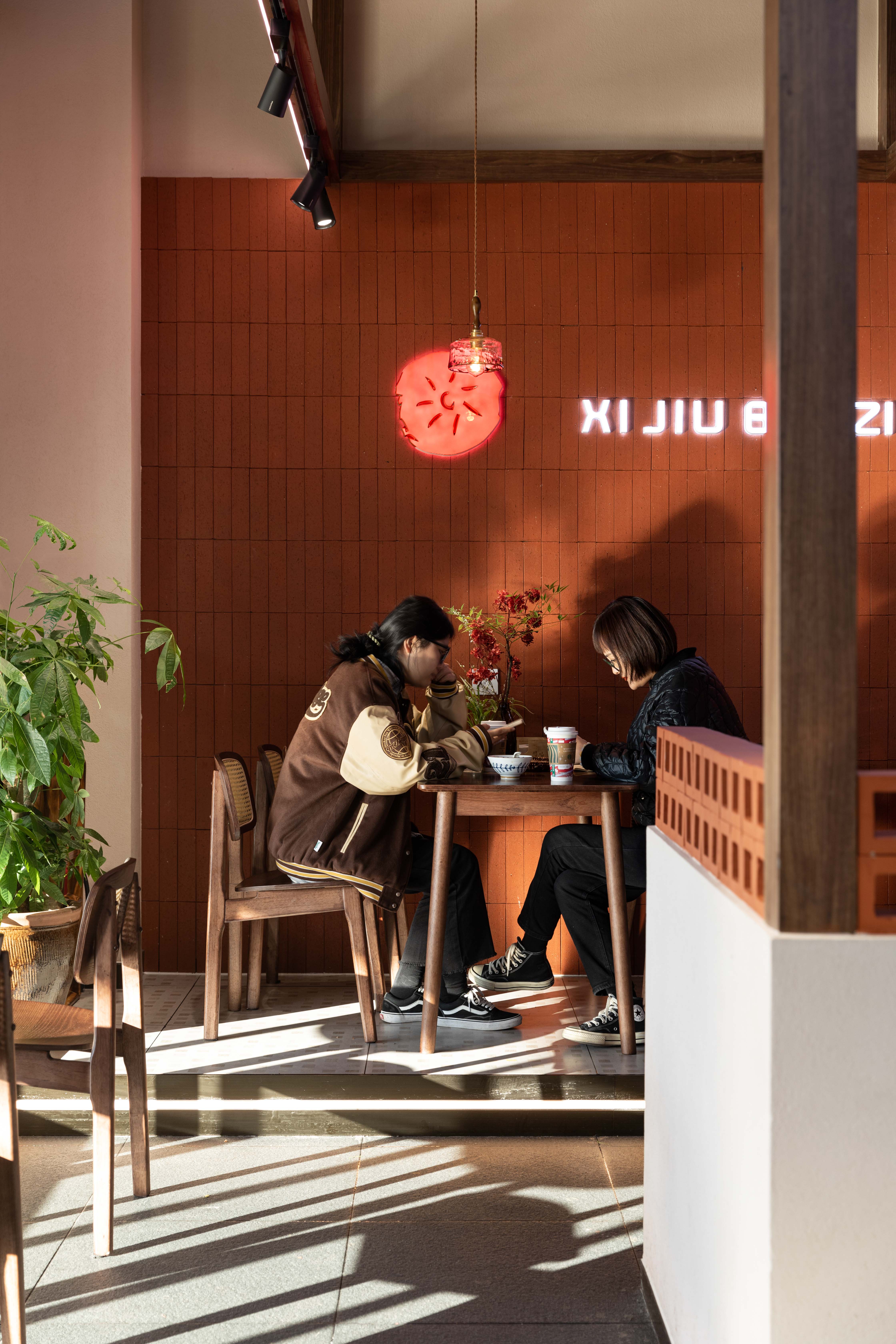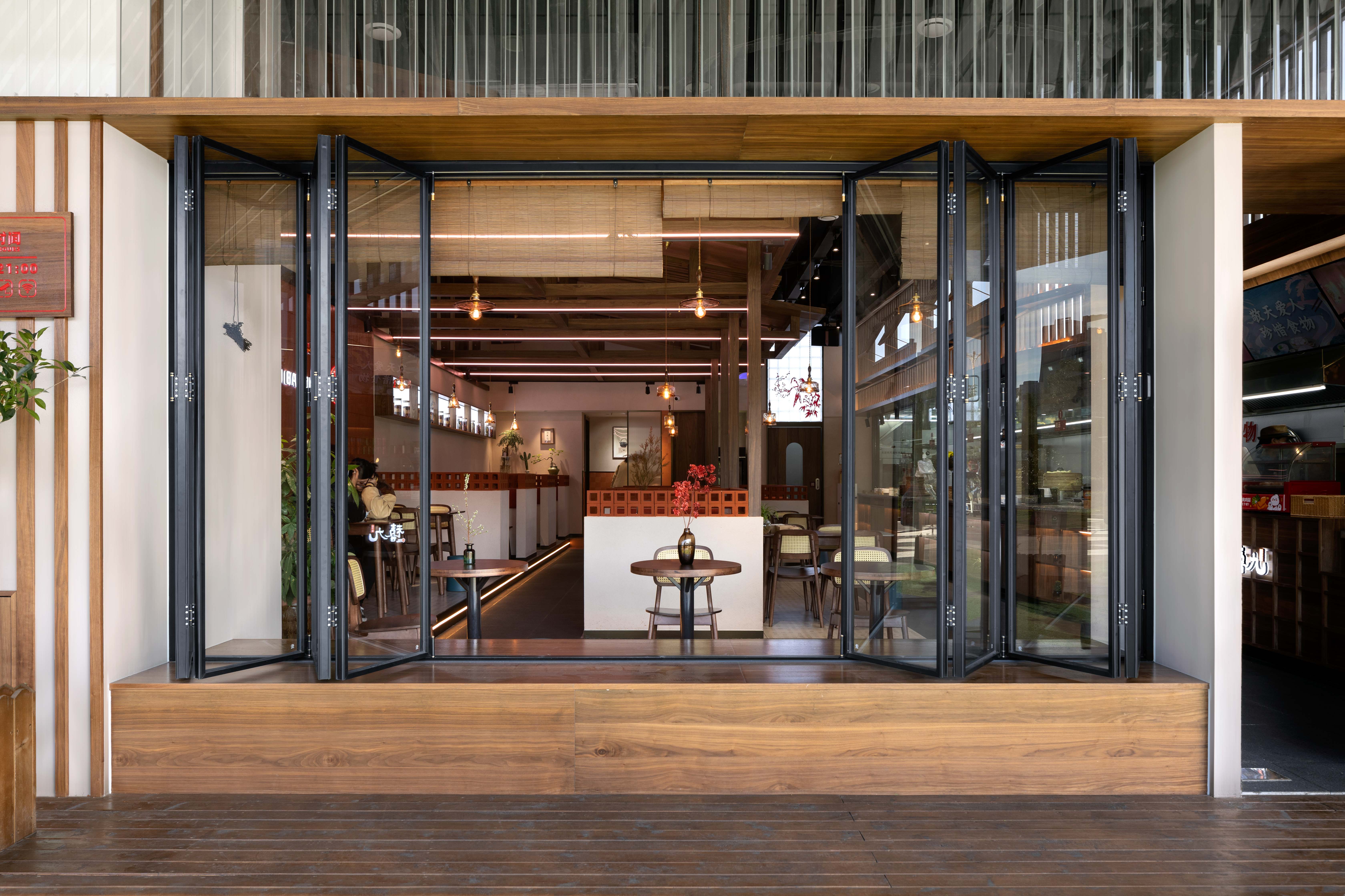 包子铺为社区店,优化环境,提升舒适度的同时更要提供更舒适的卫生间洗手台,让带孩子就餐的宝妈及老人们更方便、舒适、卫生。 同时加入可对外打开的地台空间,内外均可就餐,拉进内外的距离。让路人更通透的感受内外零遮挡的感受“温度”。白天餐饮营业,夜幕时分户外休闲区举行沙龙活动,兴趣相投的好友在此休息洽谈。宛如欧阳修在《醉翁亭记》表达的悠闲自适,人们的心灵沉浸到闲适、恬淡的情境里,获得了一种平衡、和谐的感受。
