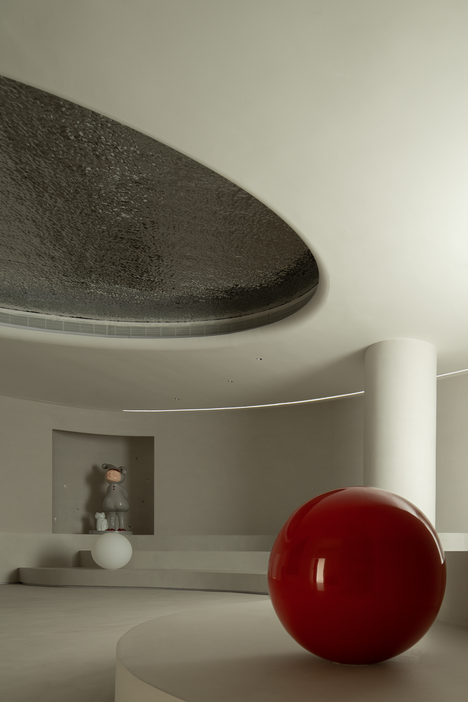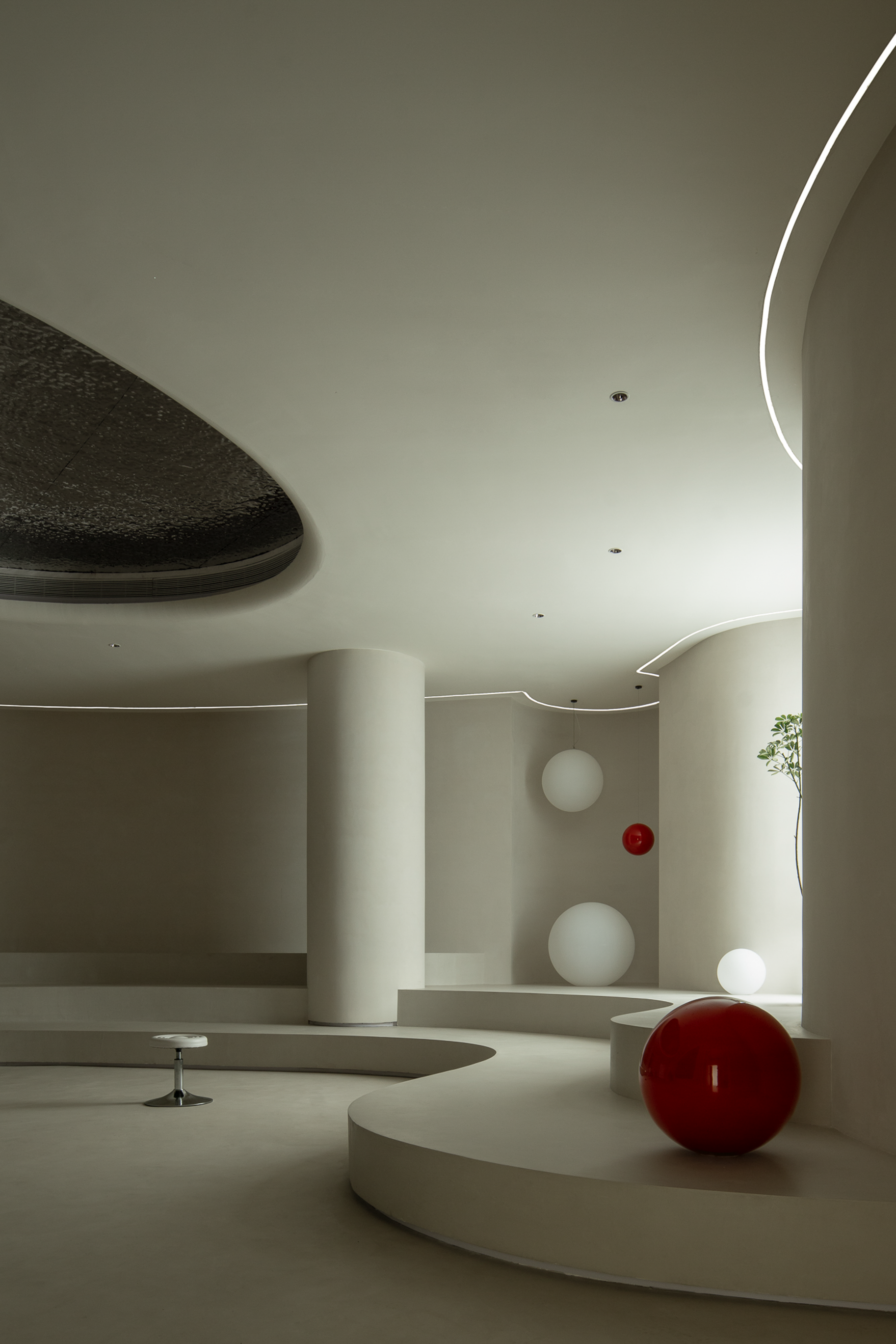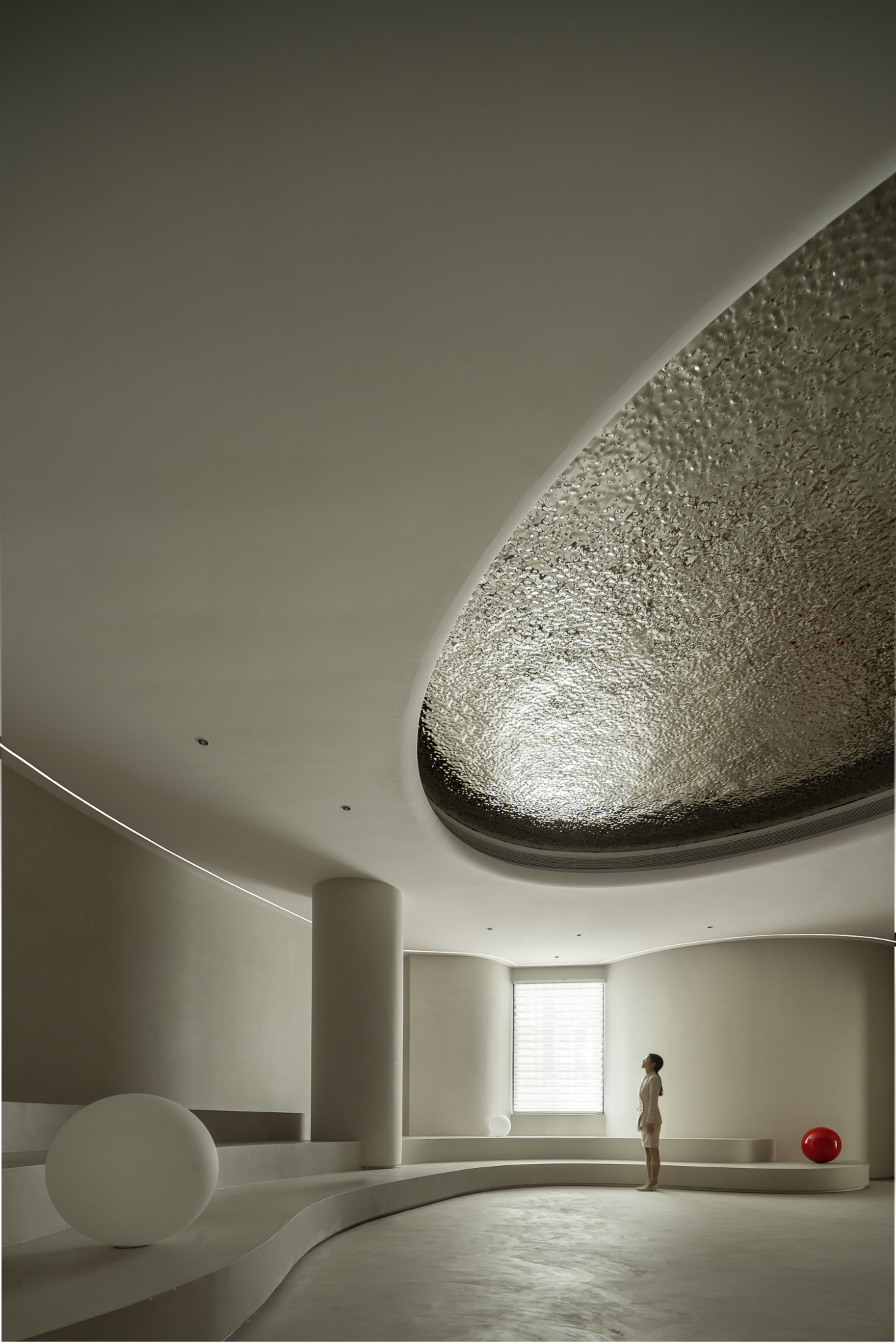 波浪、流水、水滴等自然意向的抽象提取,使空间不再呈现规矩平叙的样子,纯白色的空间以一种既含蓄又大胆的手法铺叙开来,顶面硕大的椭圆做二次造型,银色的波纹钢板嵌入其中,如涌动的水面波光粼粼,星星点点的反光成为空间第一视觉焦点;地台层层叠叠的曲线犹如小溪涓涓细流,放上一颗红色球体,空间的艺术张力焕发而出,柔美、流动、放松,是人与环境关系最好的调和。