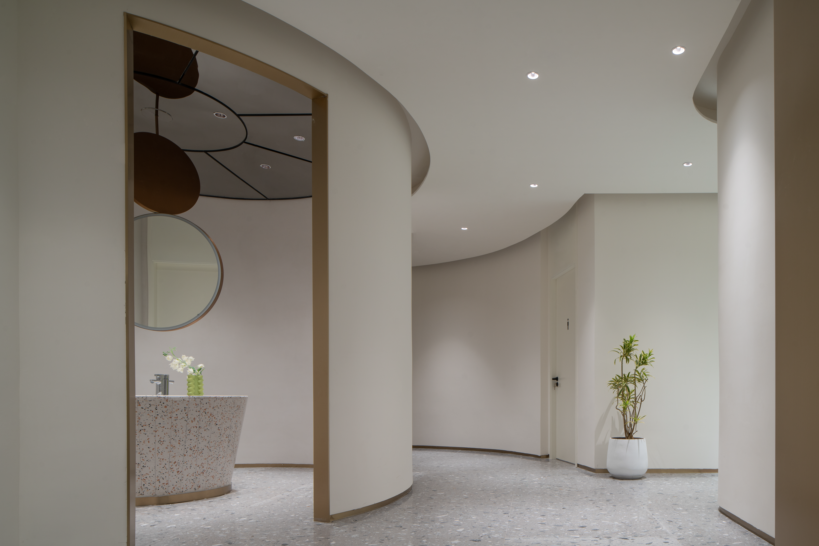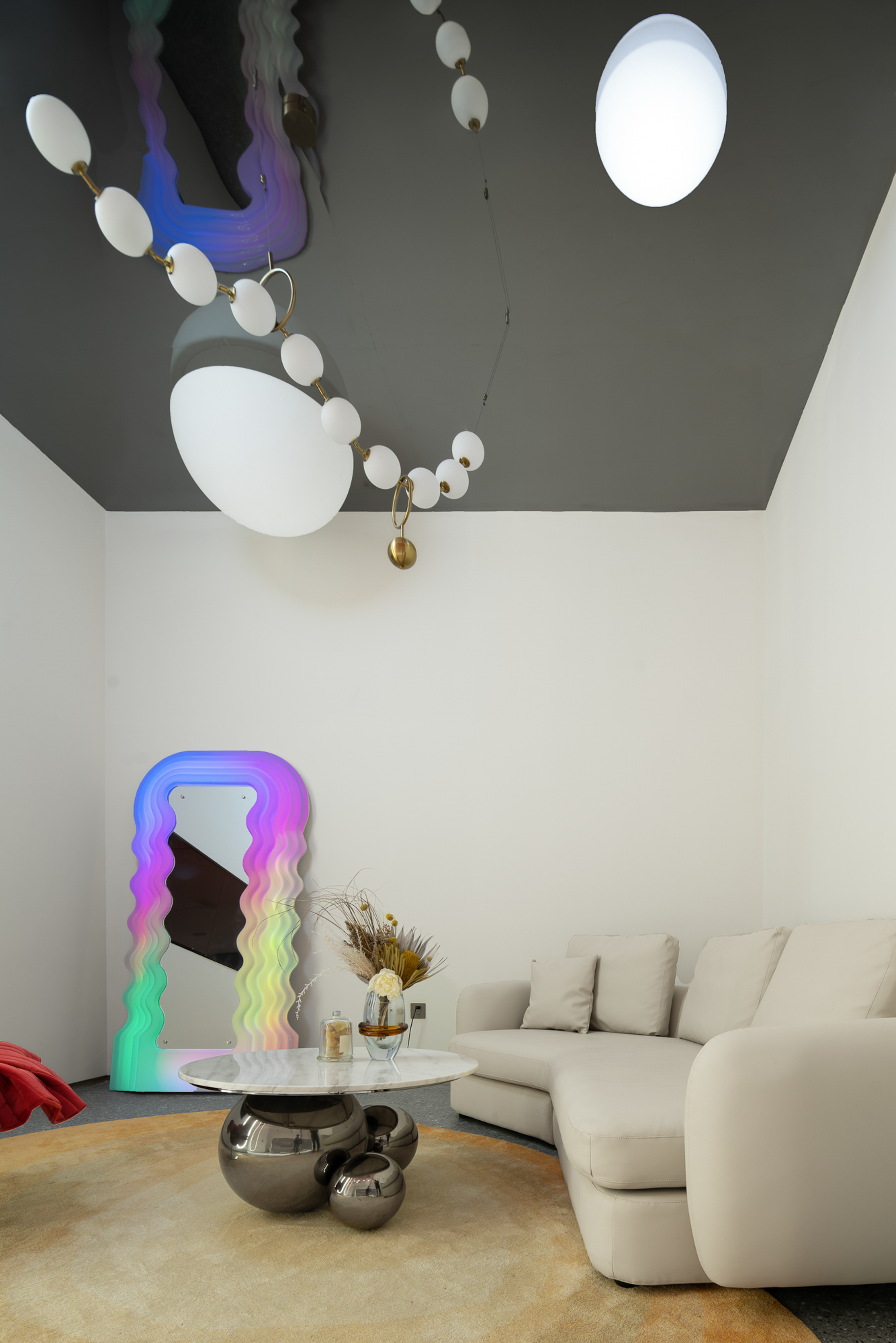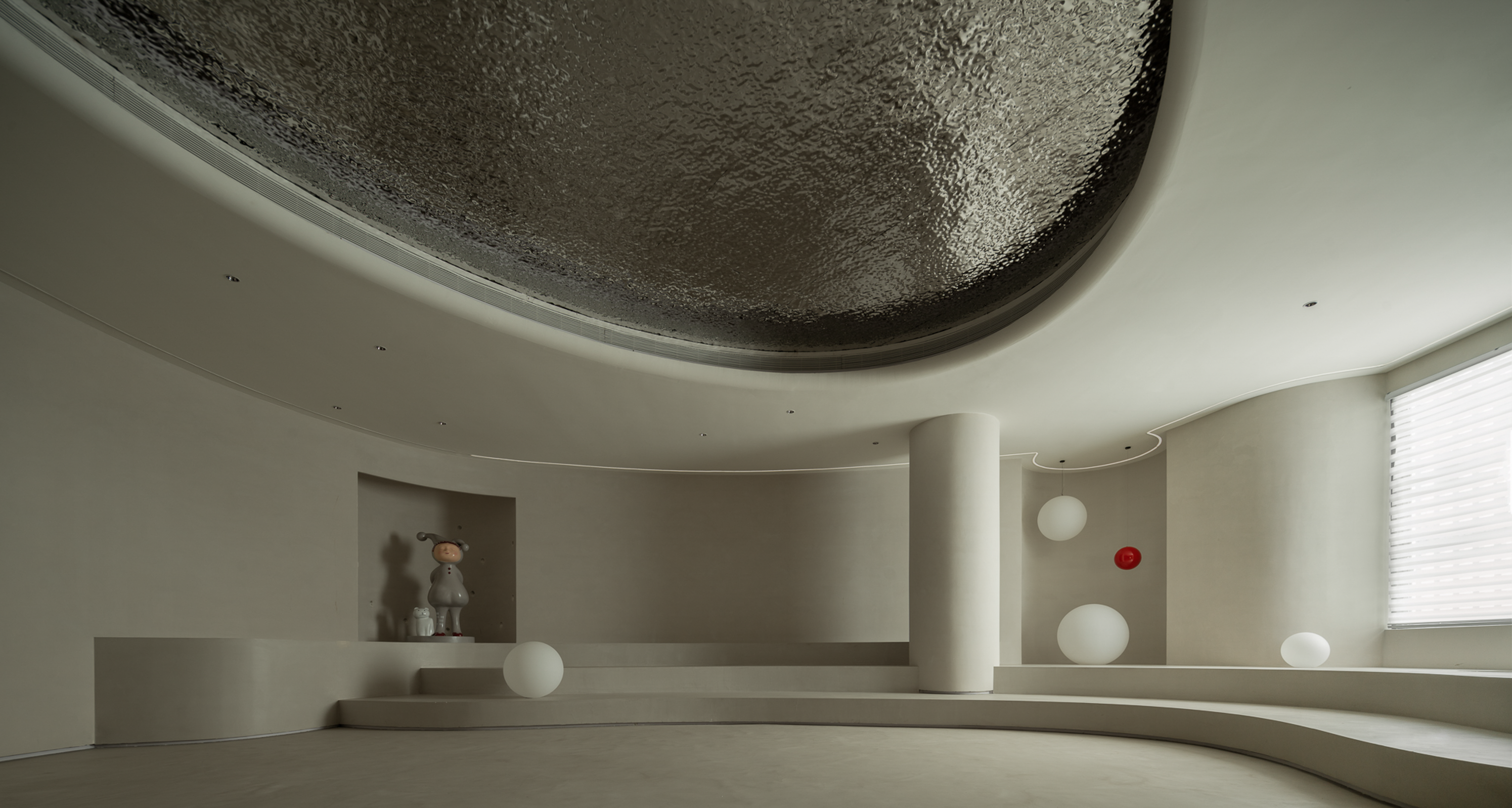 波浪、流水、水滴等自然意向的抽象提取,使空间不再呈现规矩平叙的样子,纯白色的空间以一种既含蓄又大胆的手法铺叙开来,顶面硕大的椭圆做二次造型,银色的波纹钢板嵌入其中,如涌动的水面波光粼粼,星星点点的反光成为空间第一视觉焦点;地台层层叠叠的曲线犹如小溪涓涓细流,放上一颗红色球体,空间的艺术张力焕发而出,柔美、流动、放松,是人与环境关系最好的调和。