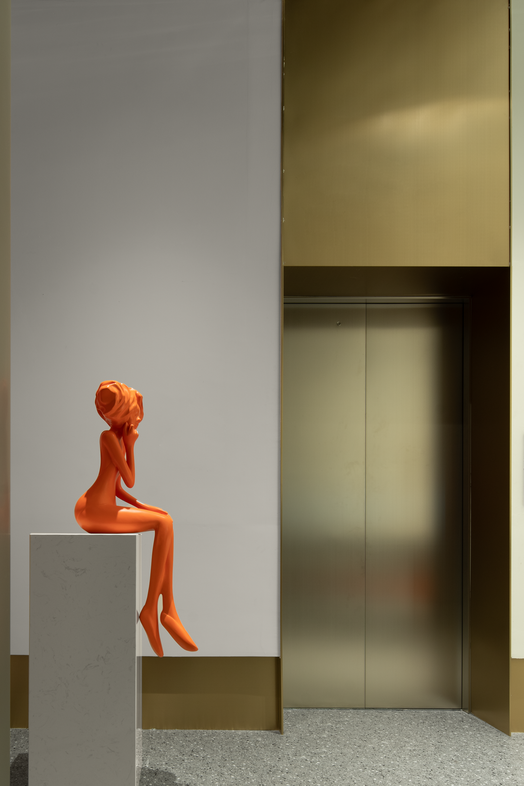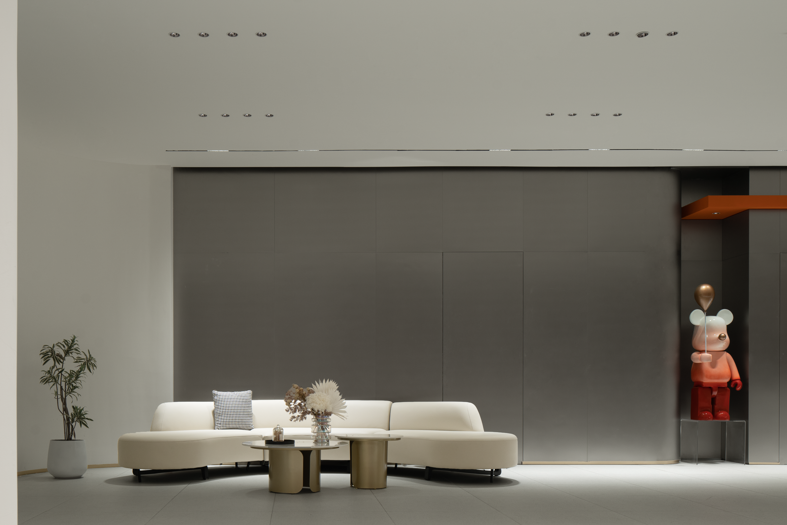 入户大厅营造出雅致、品味、含蓄的氛围,区别于传统的商业场所门面,这里有人与空间自然交流的磁场。不锈钢板、大理石、布艺等材料相互交织,深浅叠加的灰,刚硬理性中带有平静柔和,水的特性展现出艺术的矛盾,构成了一个高级静谧的商业空间。