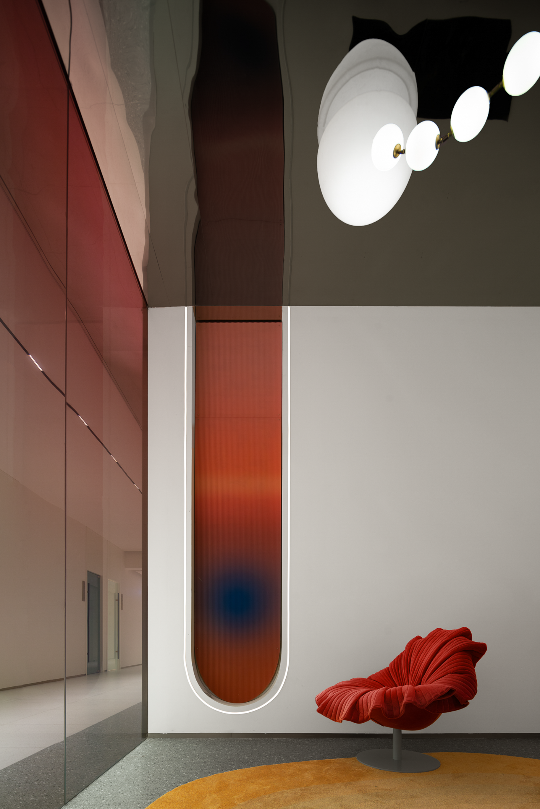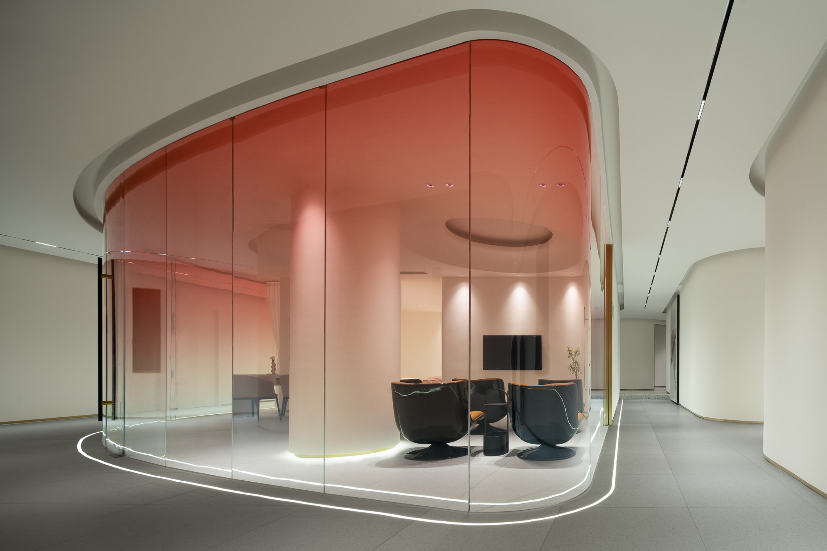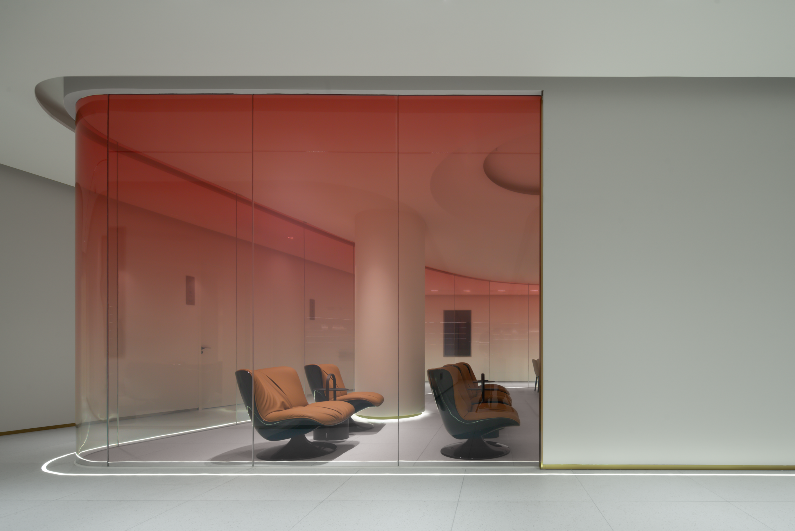 生活美容区像柔软的水被装进了一个异形玻璃容器,伫立在整个空间中心位置。从上至下透感渐变的红色幕墙,像是光的指引,折射出神奇的光影,以流畅、纯粹、柔和结合女性之美带来万变的形态。