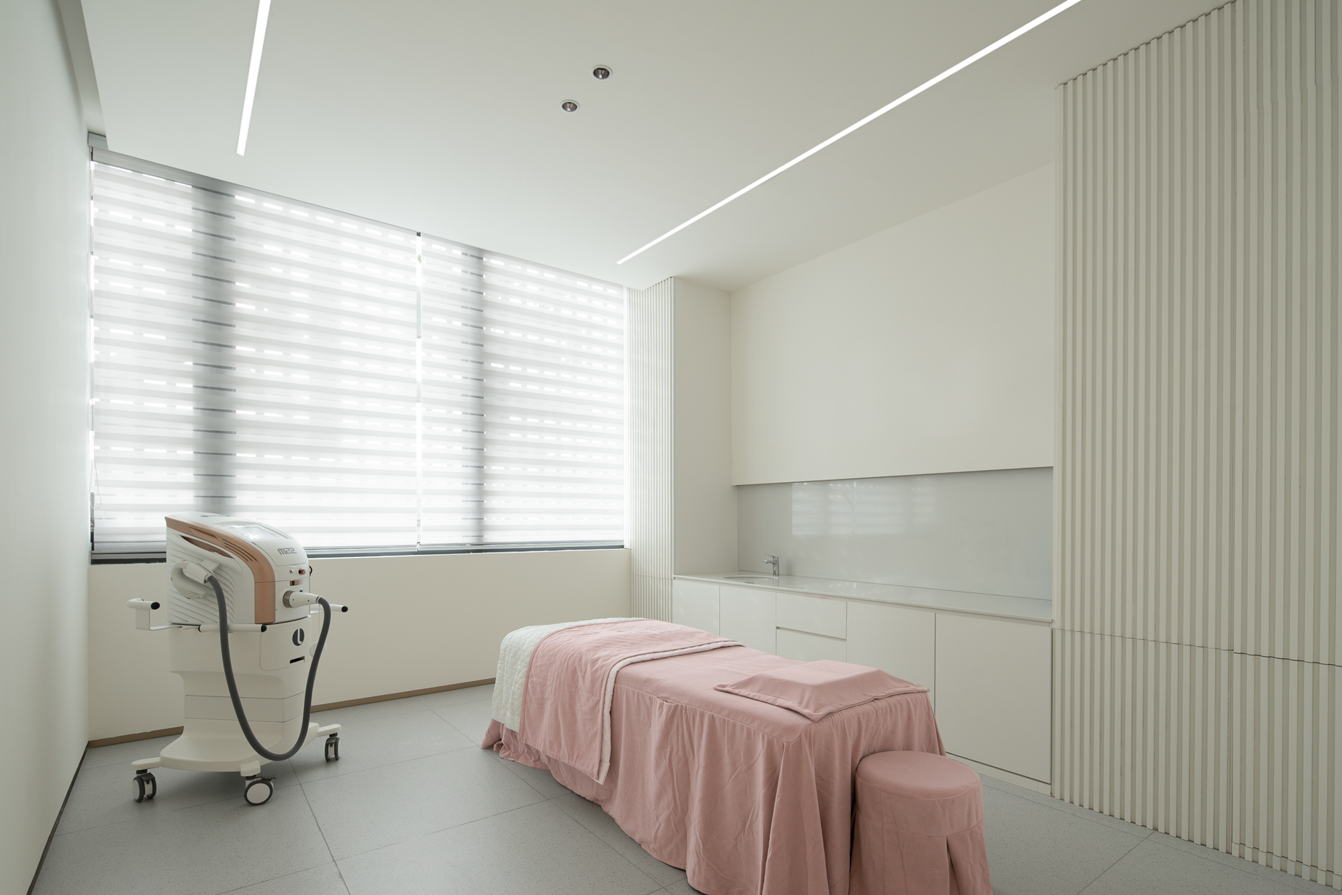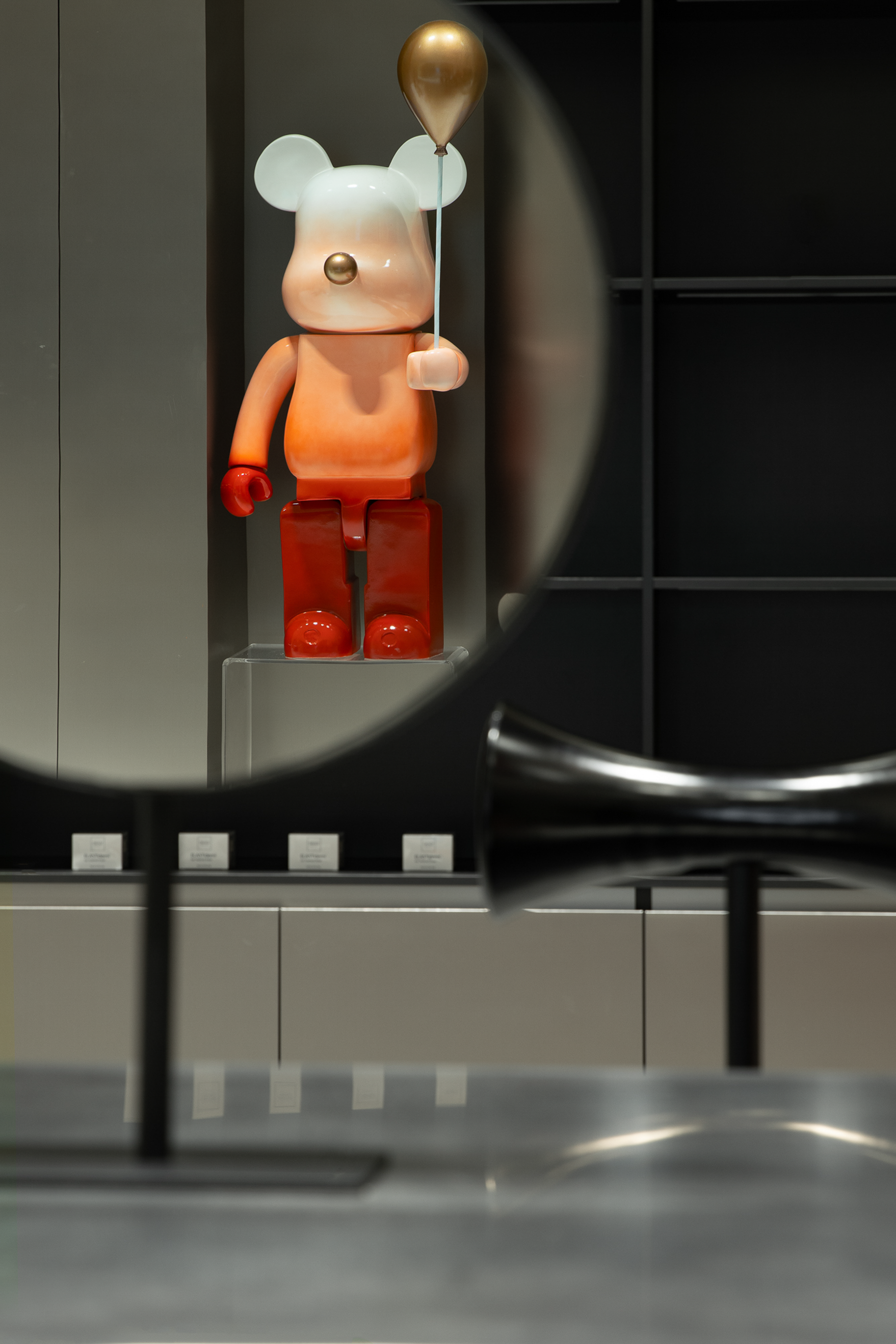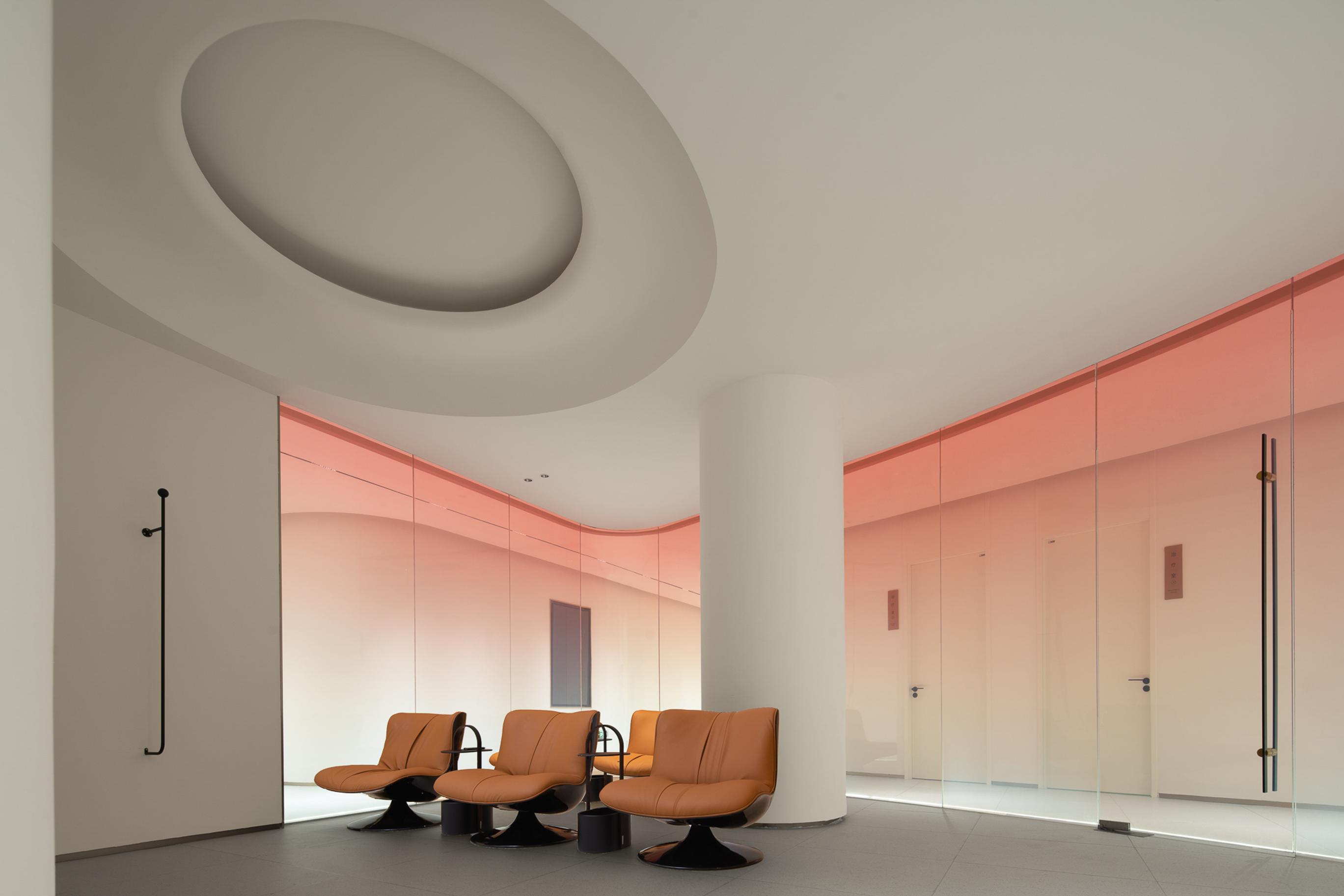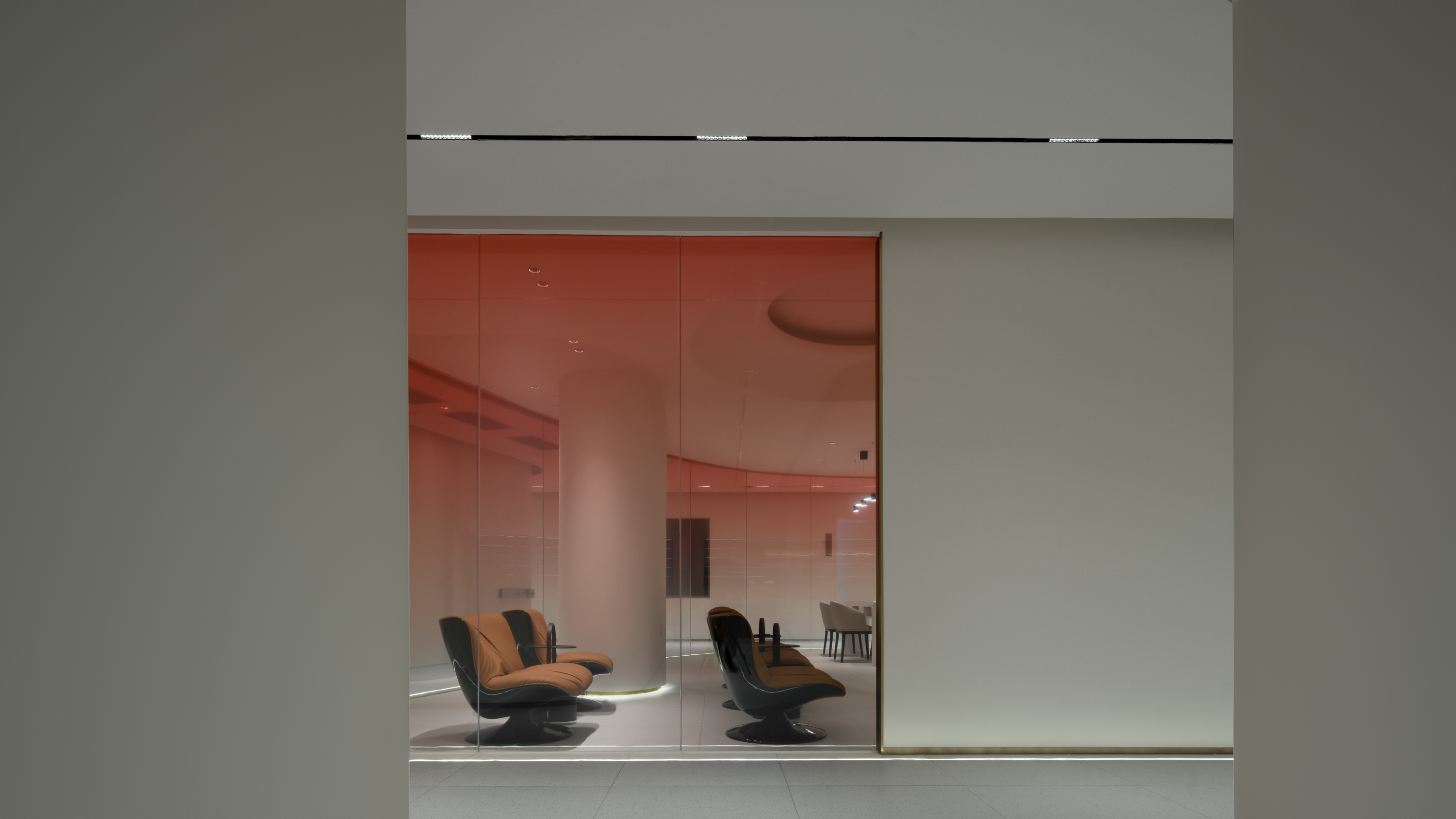 生活美容区像柔软的水被装进了一个异形玻璃容器,伫立在整个空间中心位置。从上至下透感渐变的红色幕墙,像是光的指引,折射出神奇的光影,以流畅、纯粹、柔和结合女性之美带来万变的形态。