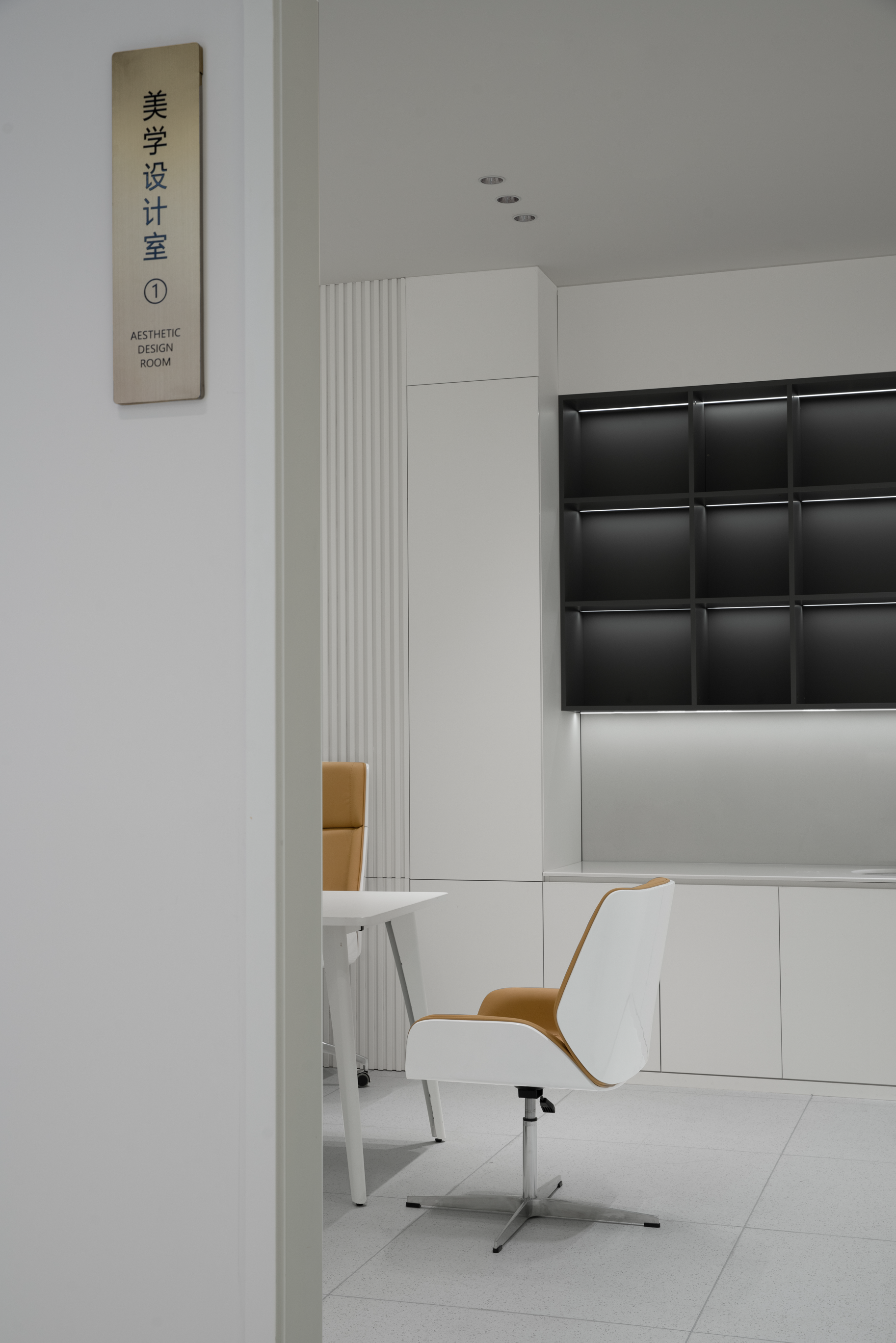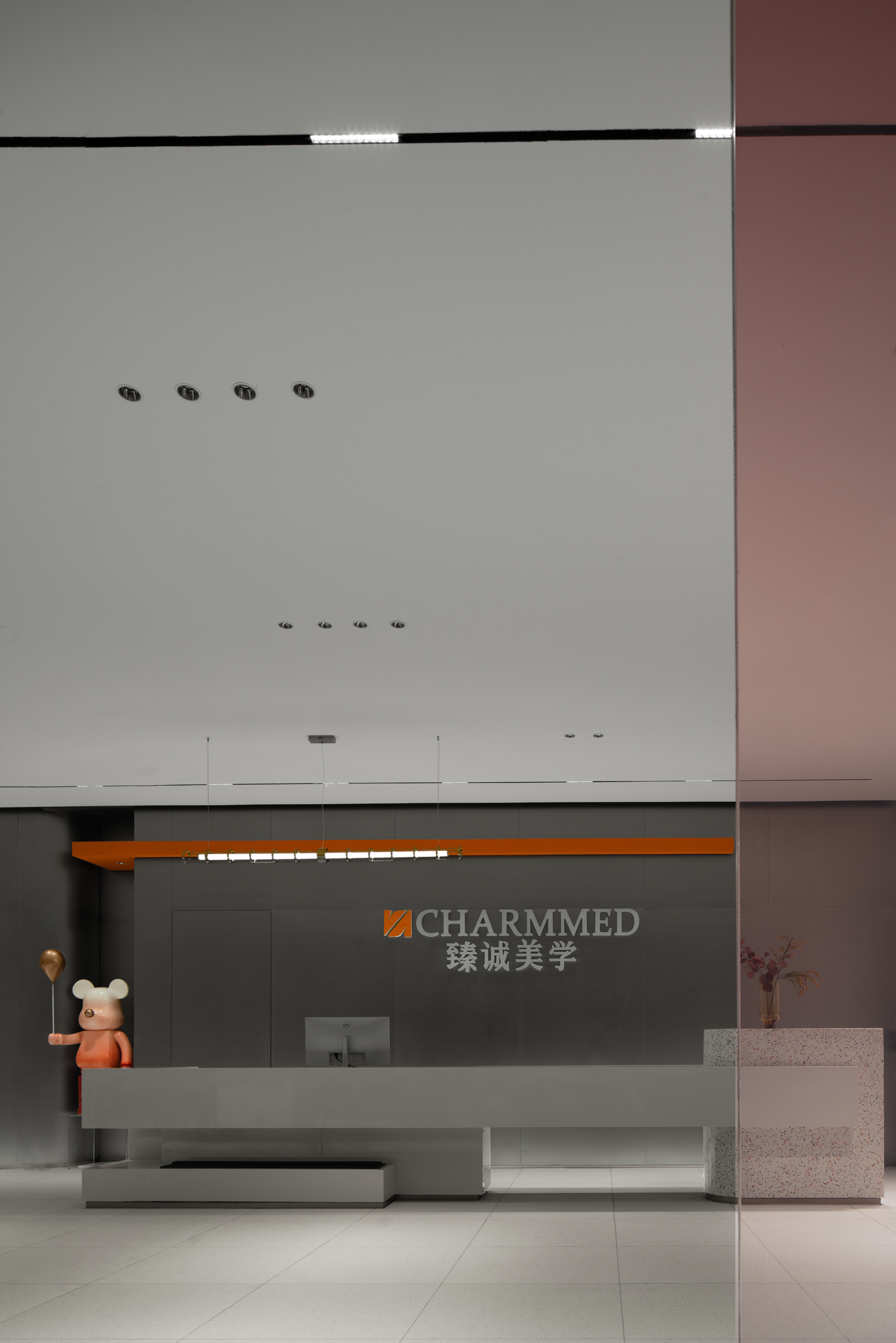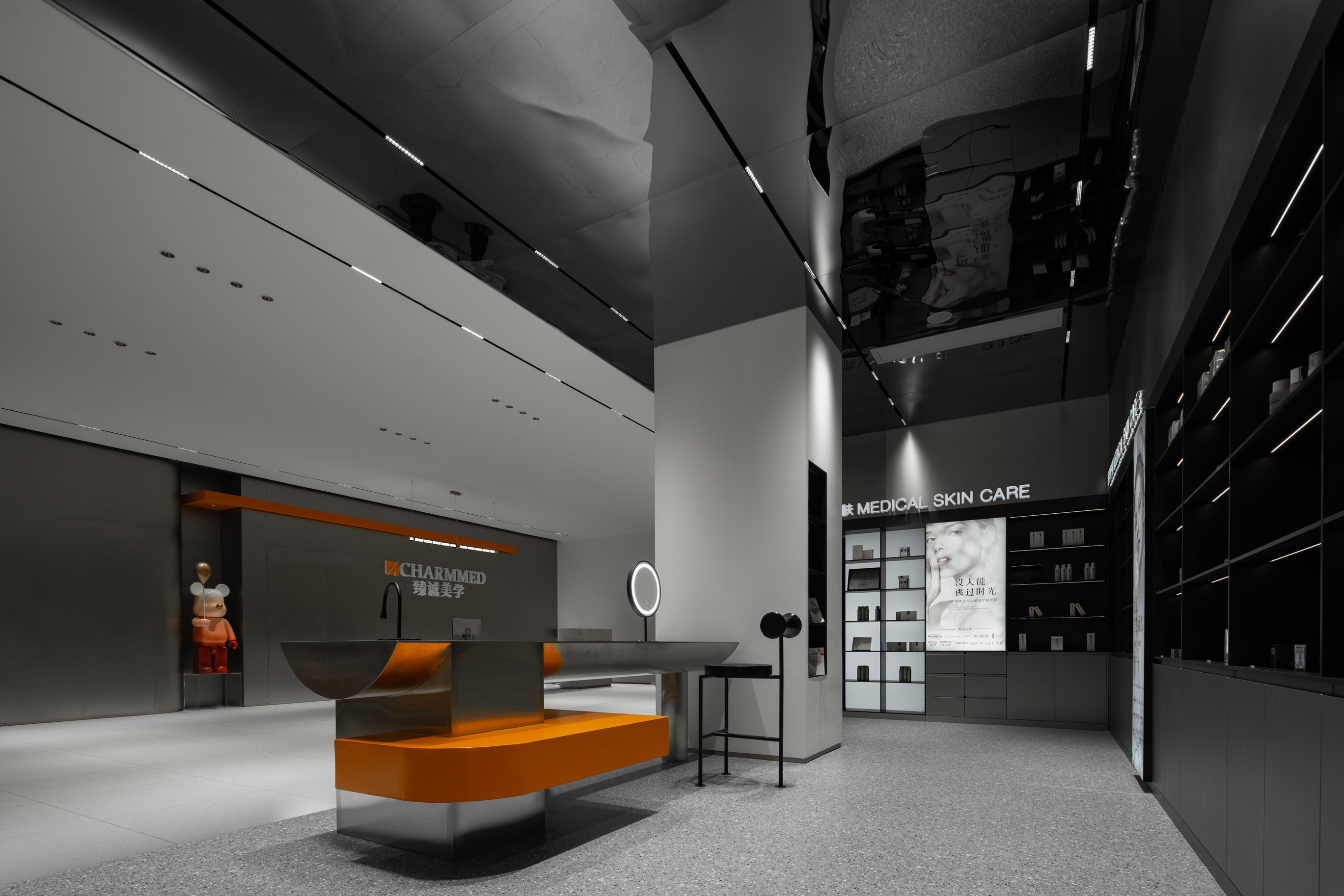 亮眼的橙在暗色背景下突出品牌logo,以干练、简洁、直达人心的表达方式展现出纯粹的美学,与医学馆“以诚造美,本质美学”的核心价值相契合。