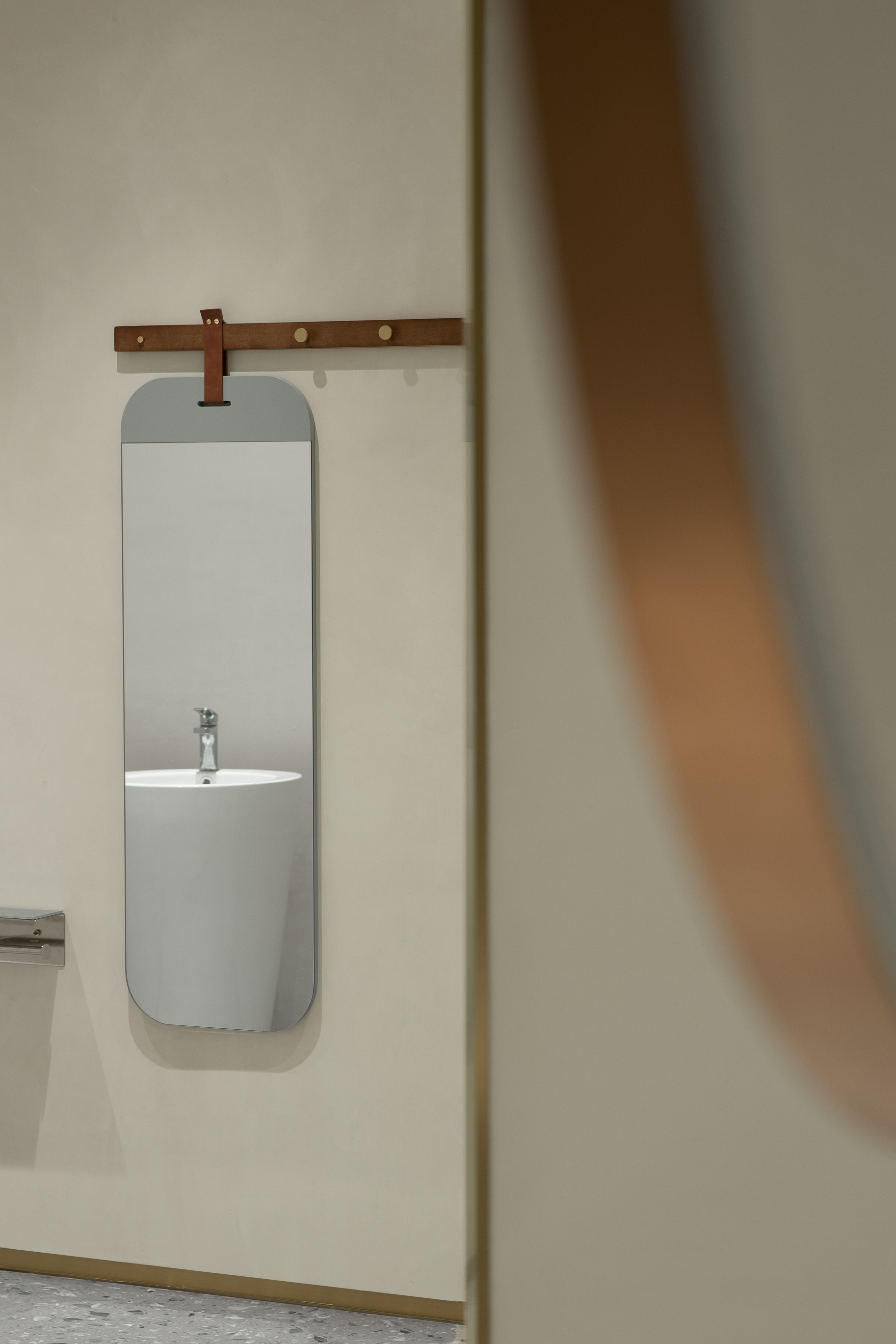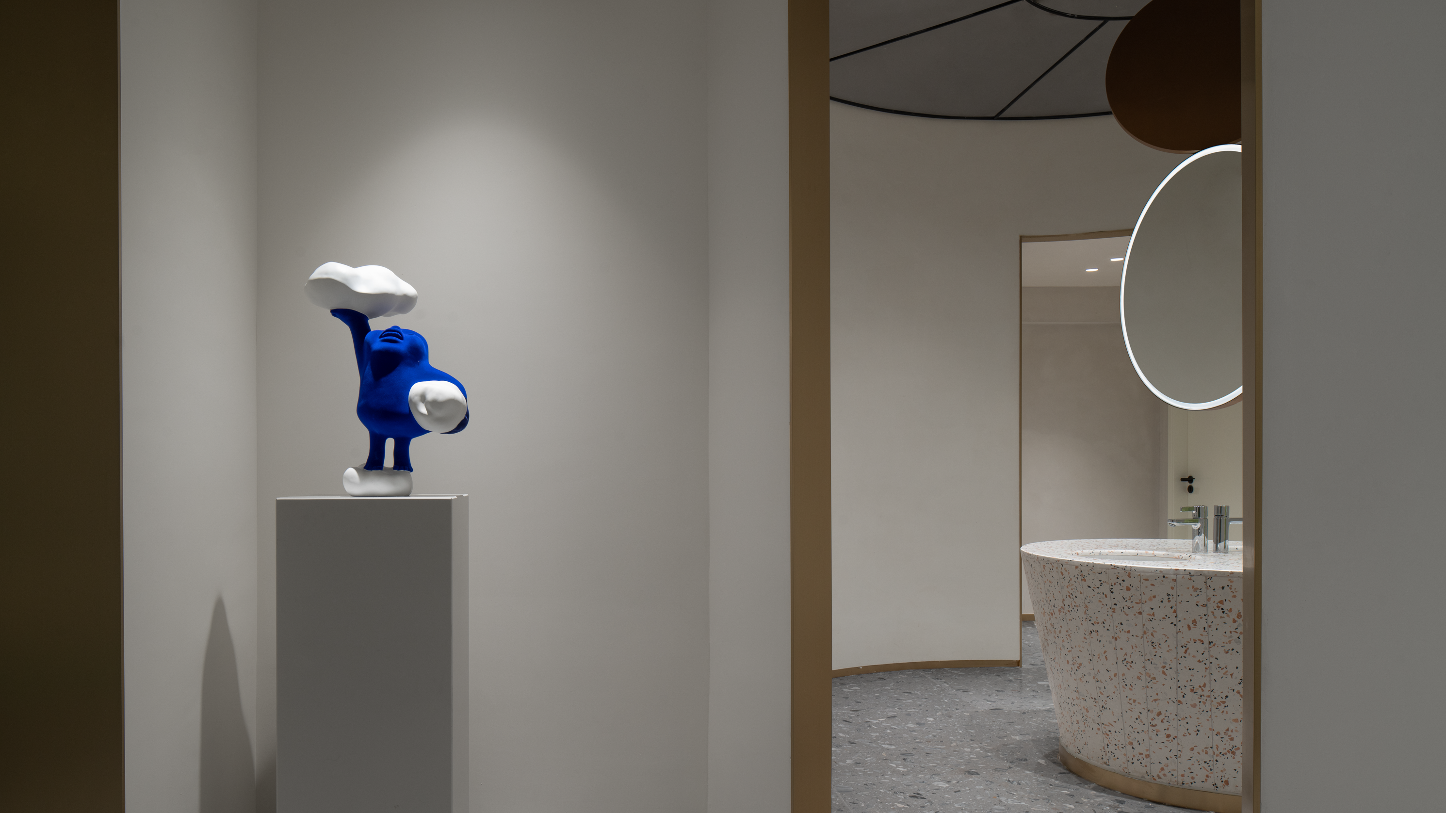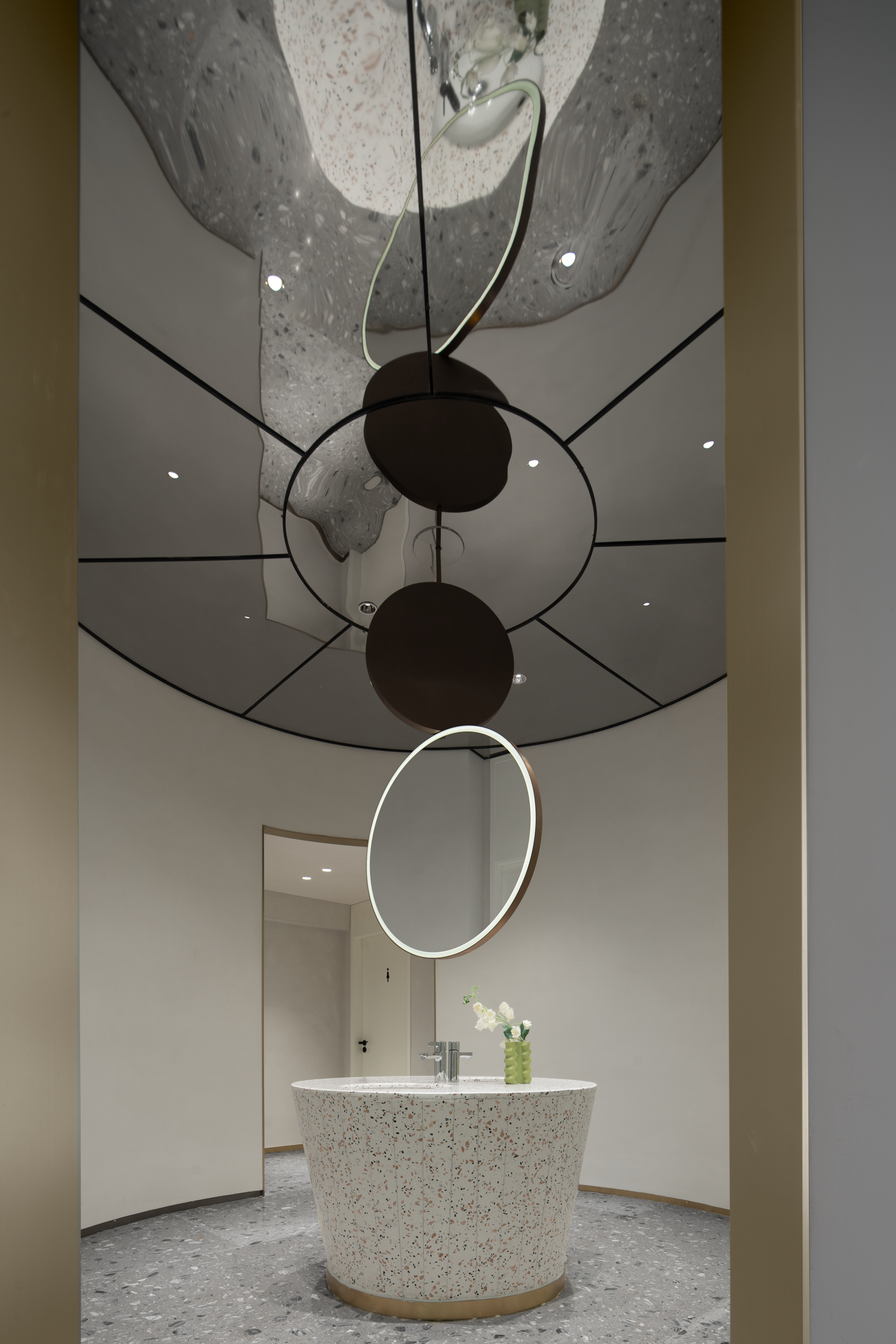 打破常规卫生间设计,它像艺术展馆一样隐藏在一个圆形空间里,以造型唯美的洗手台作为中心,在空间载体上做分布,圆弧、几何的呼应,无声地划分了功能区域,将穿衣区、整理区融入其中,给足女性安全感与便利性。