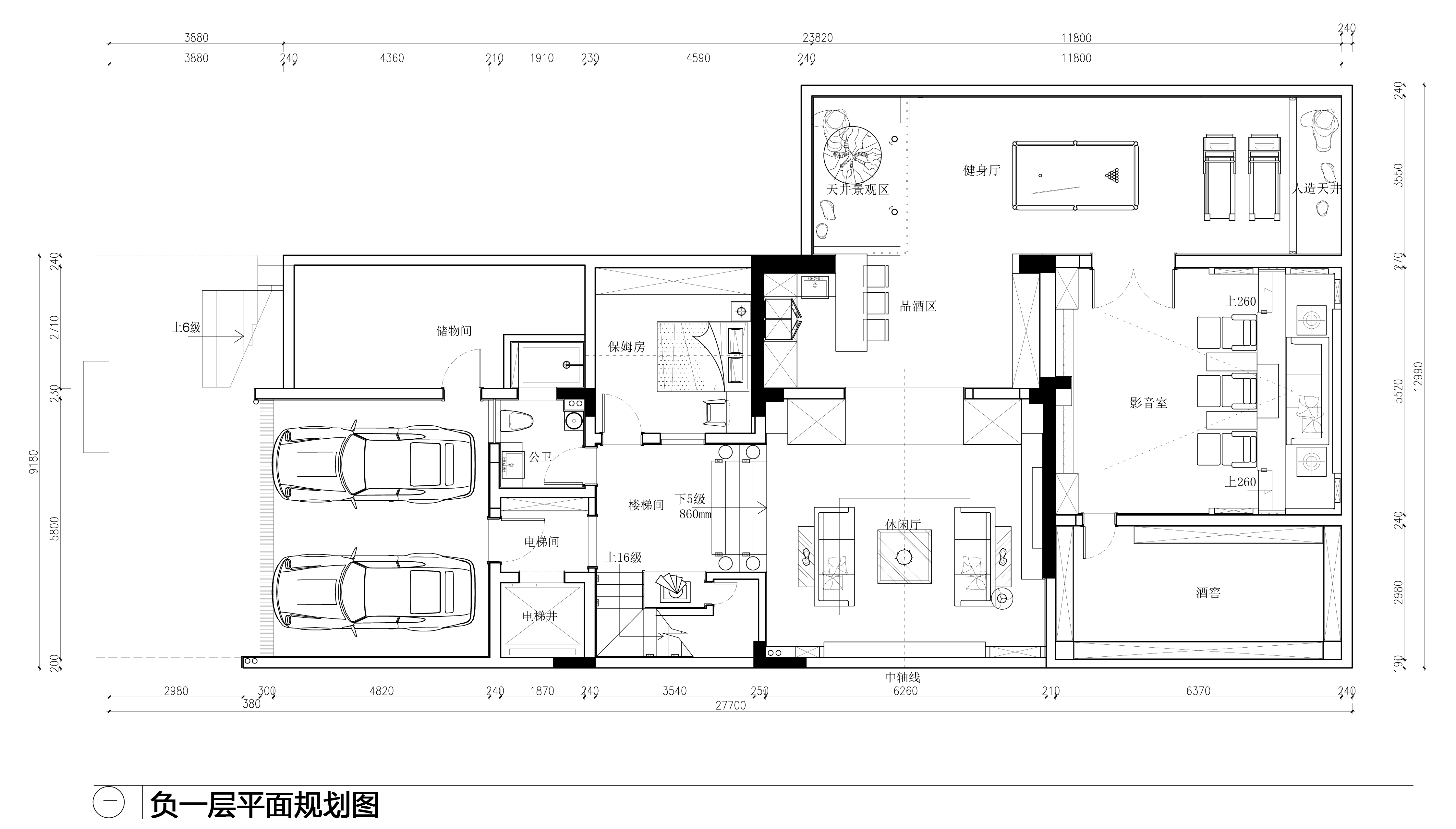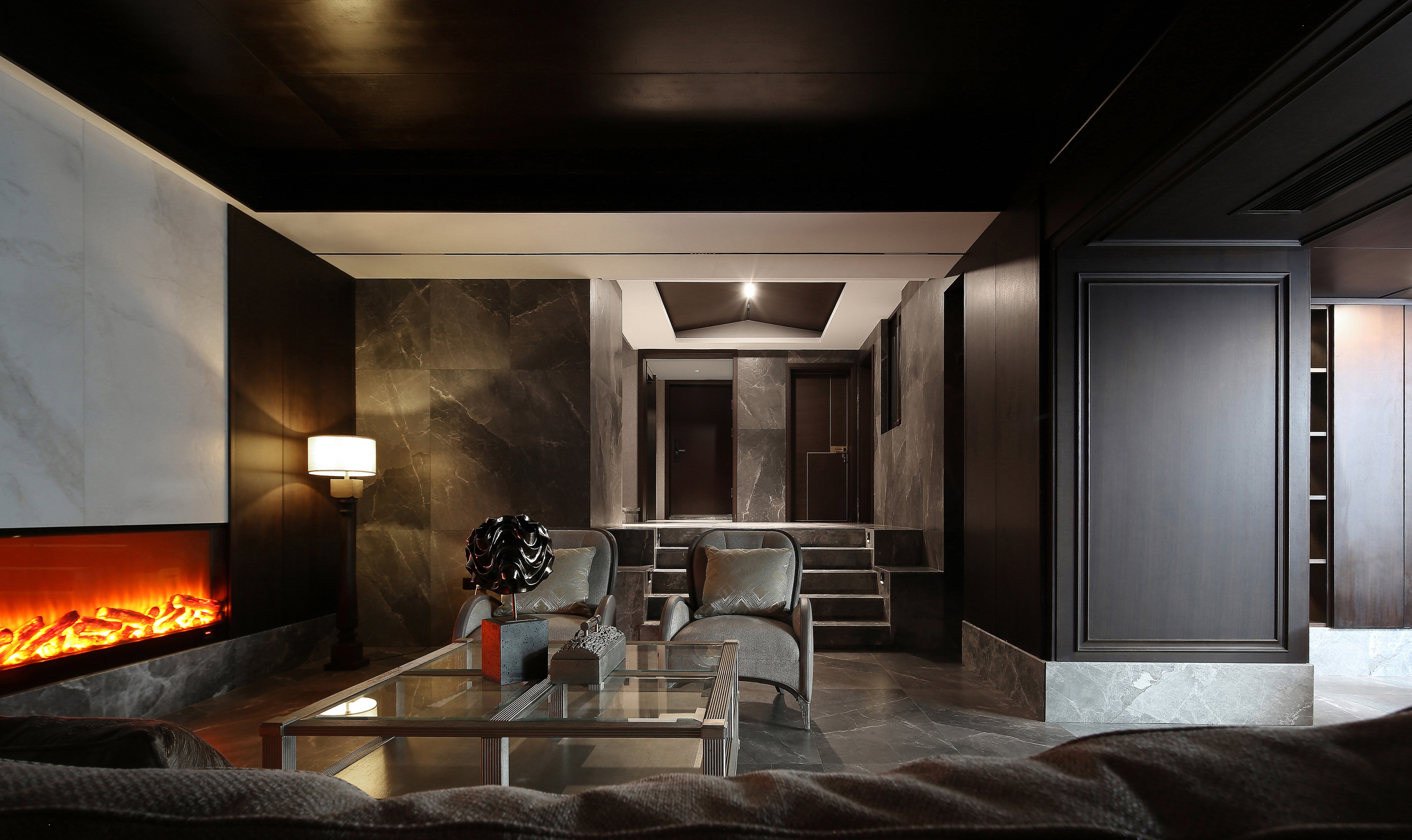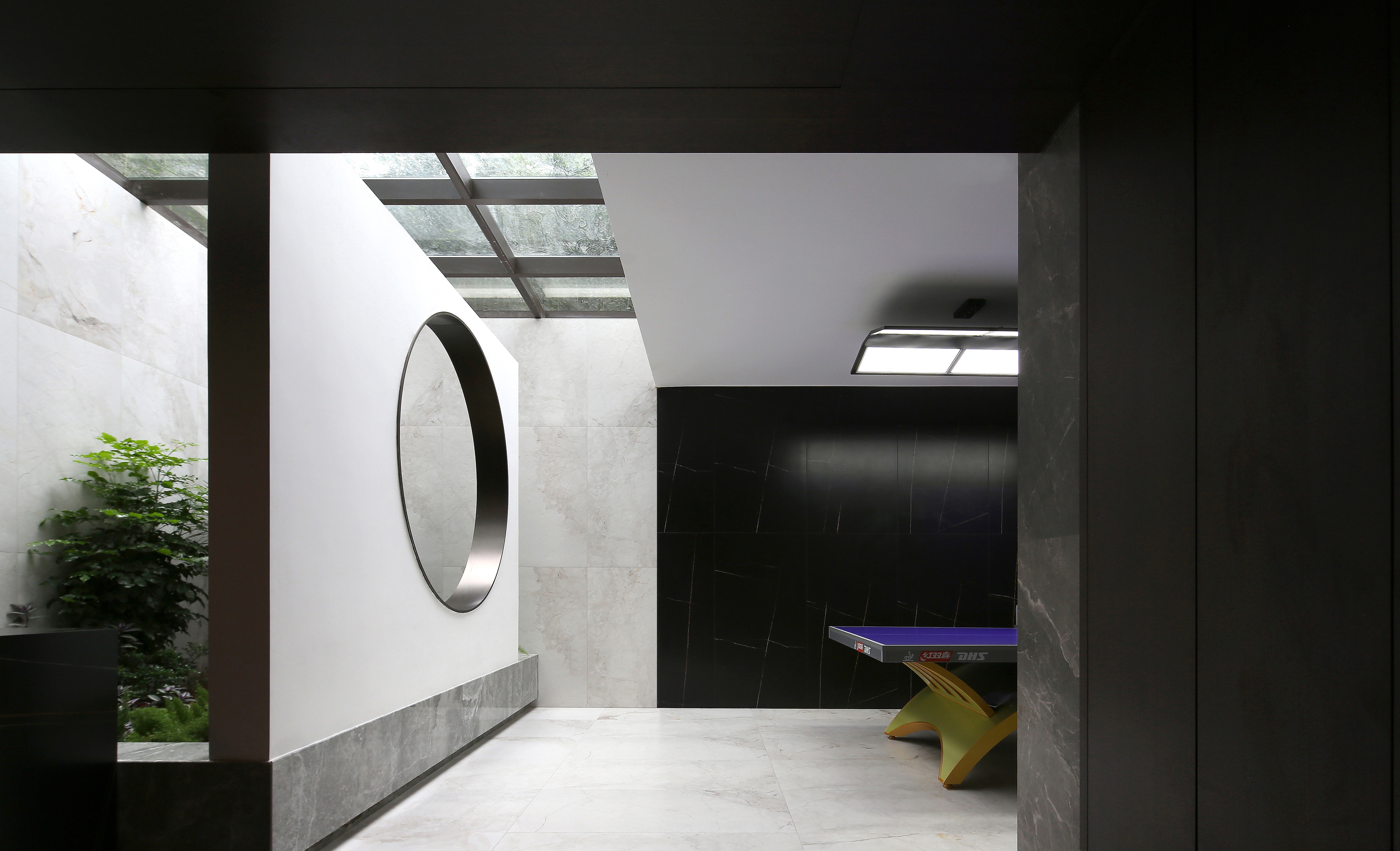 空间布局:中轴对称的设计手法,使空间格局的庄重,并富有仪式感。地下室主要作为男主人呼朋唤友的接待空间,与楼上居住空间动静分开。