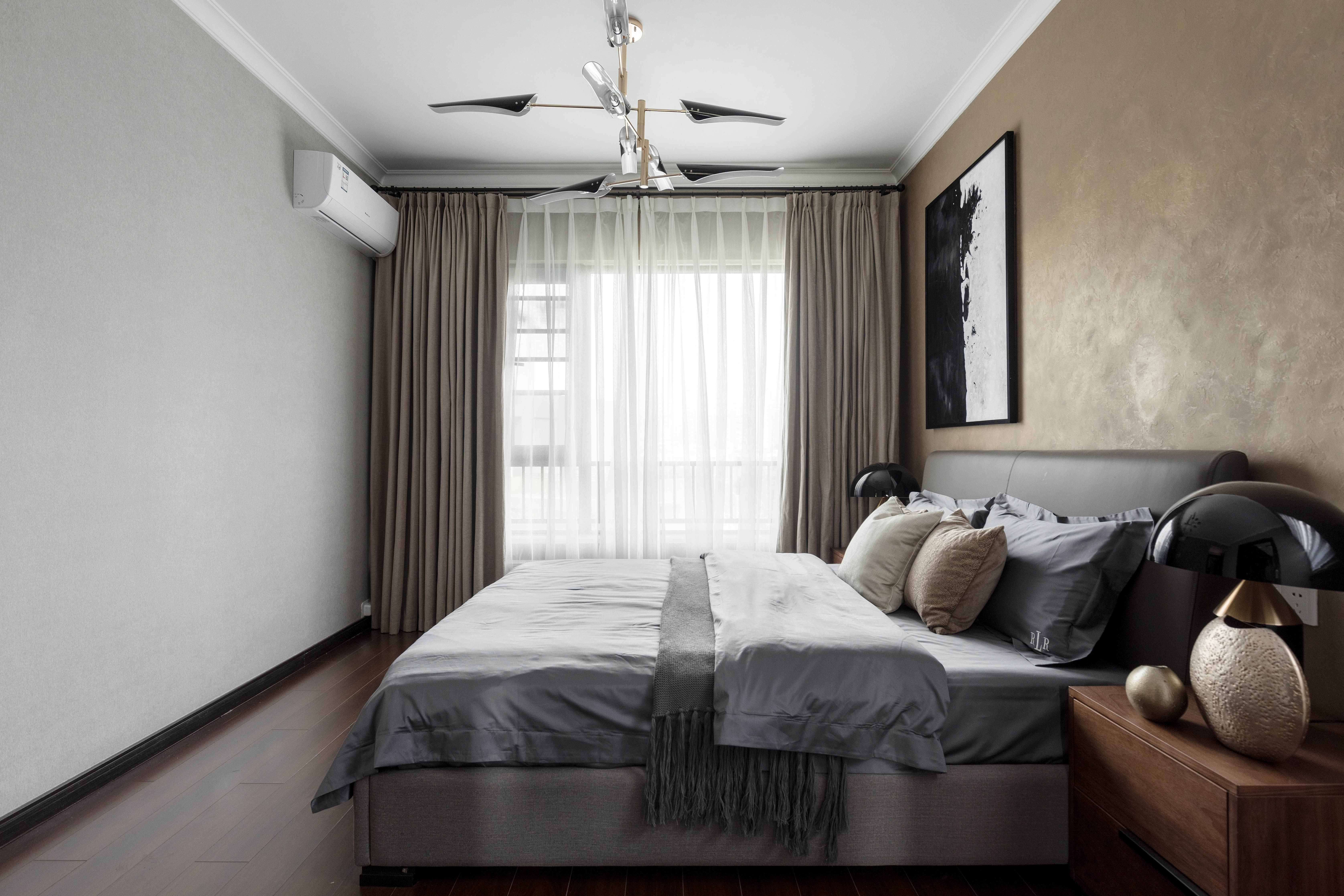 硬装基调便是黑橡木色+白色墙漆+红棕木色地板。在后续墙面的改造中我们选用了带着一点金属质感的艺术涂料进行协调和融合。