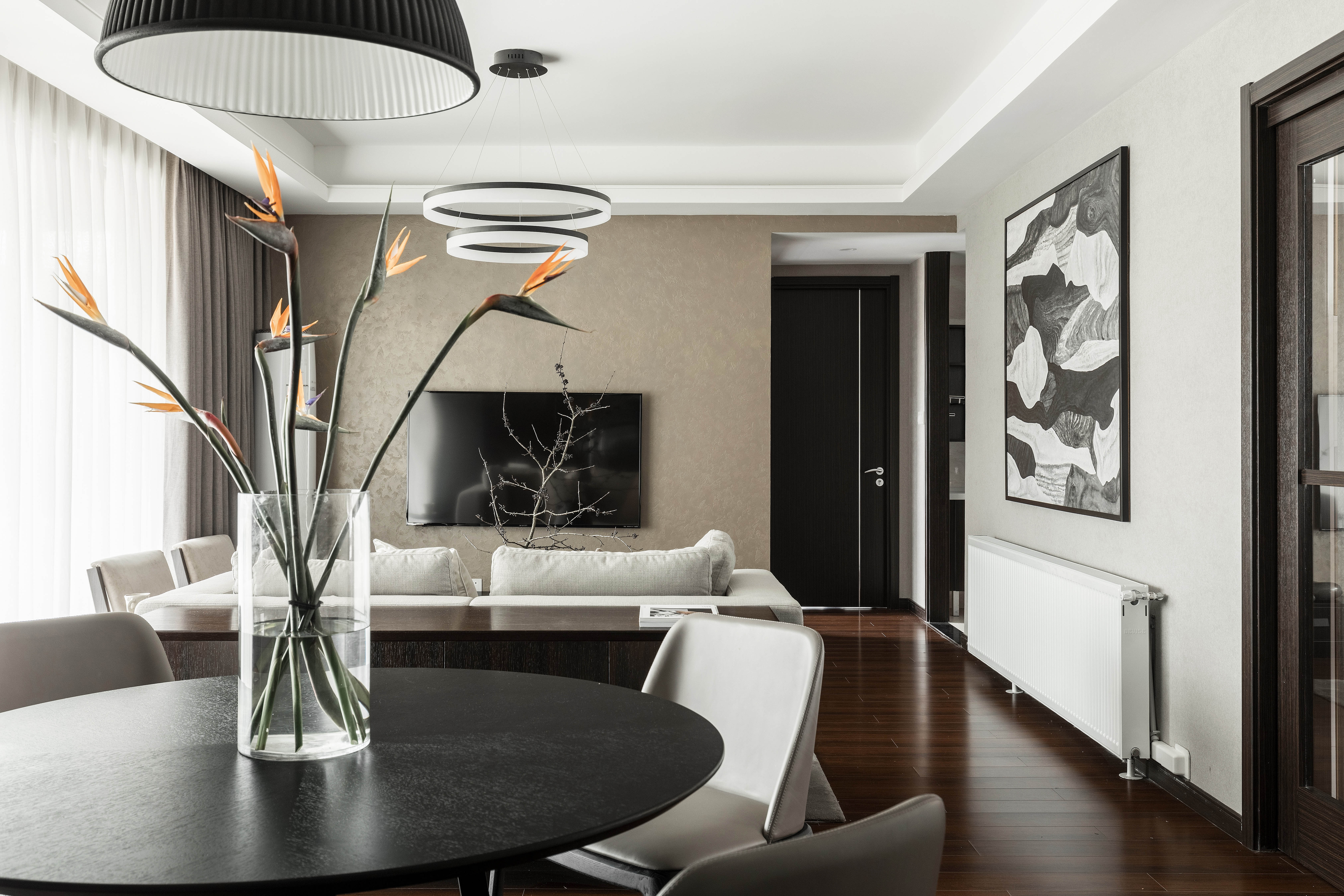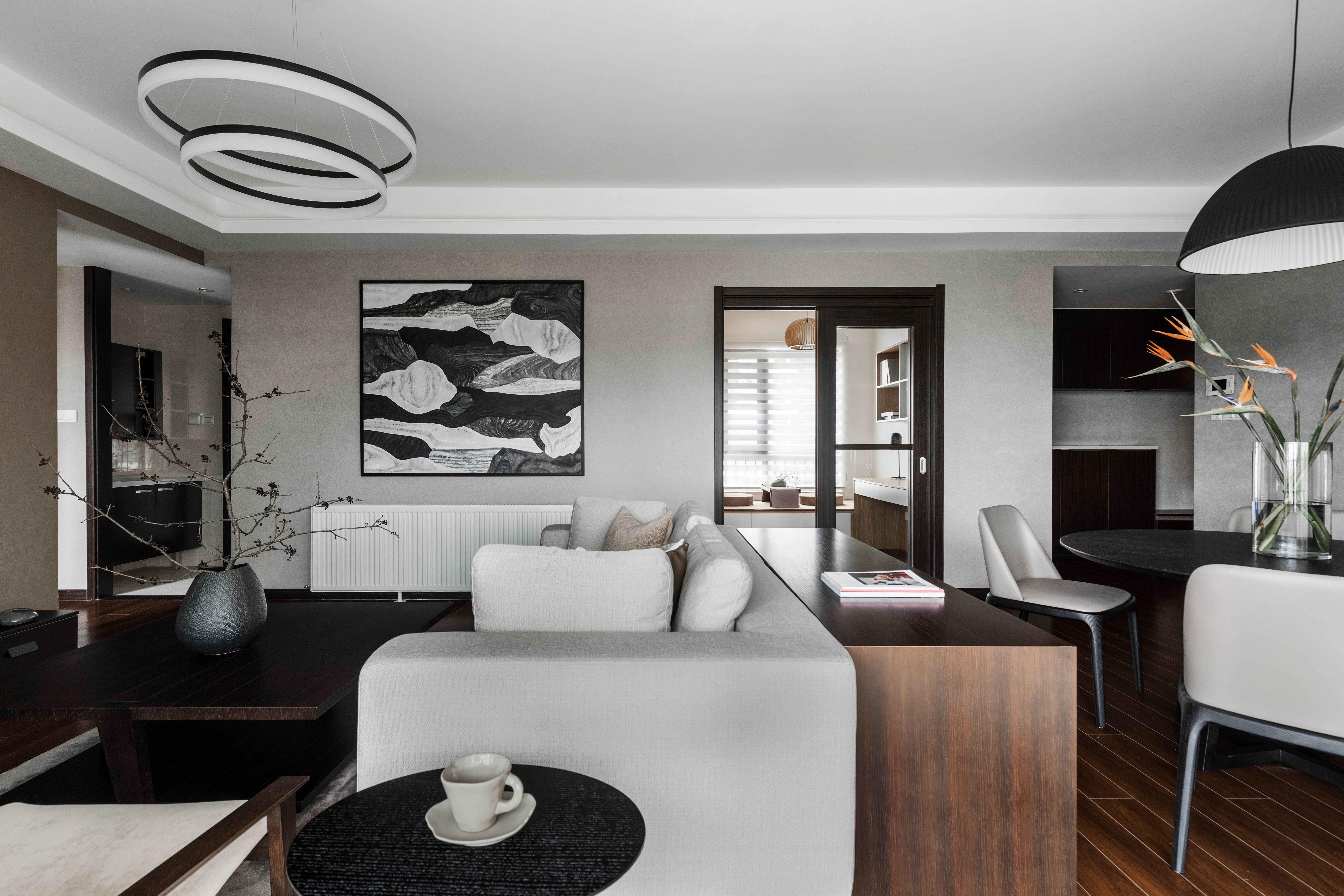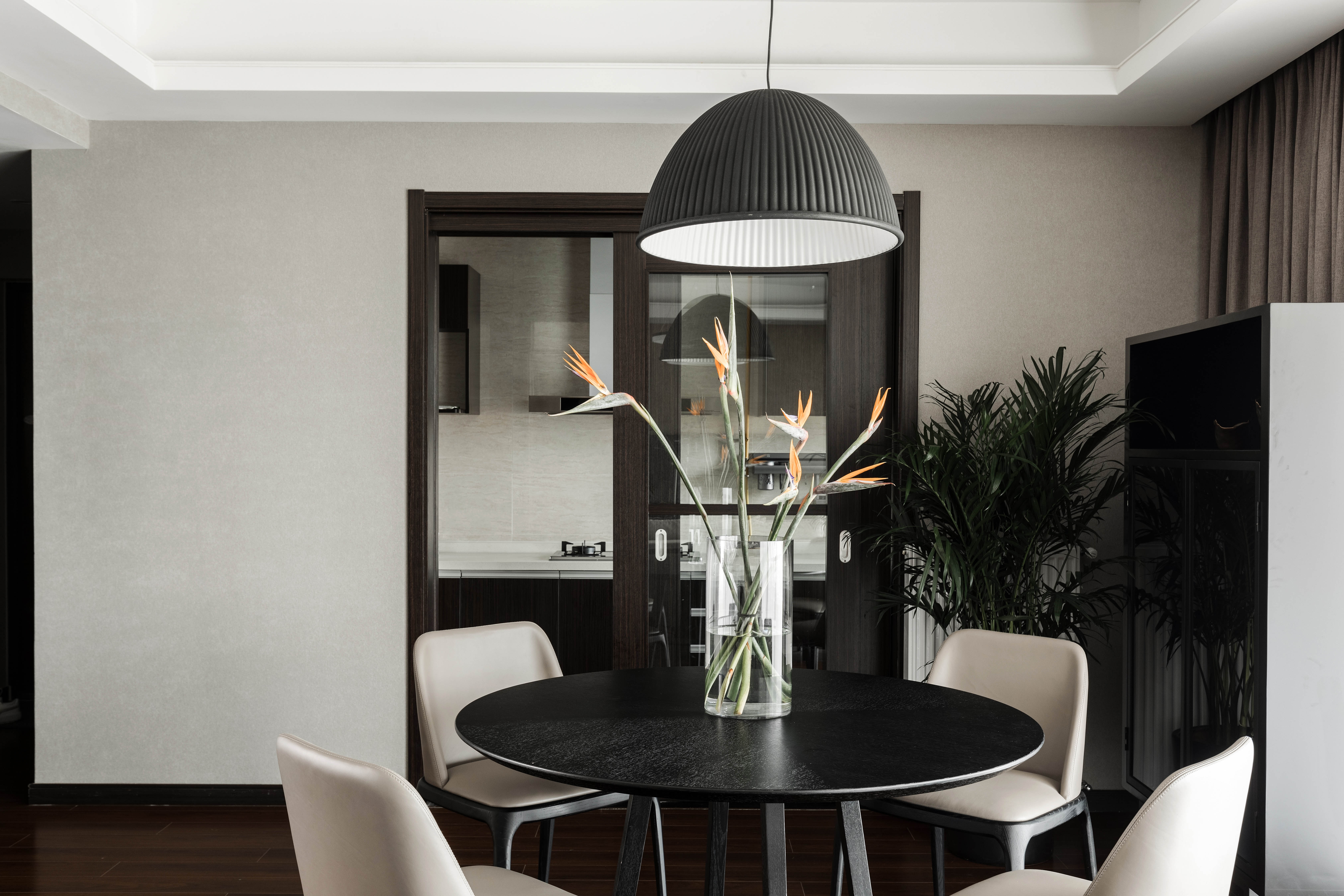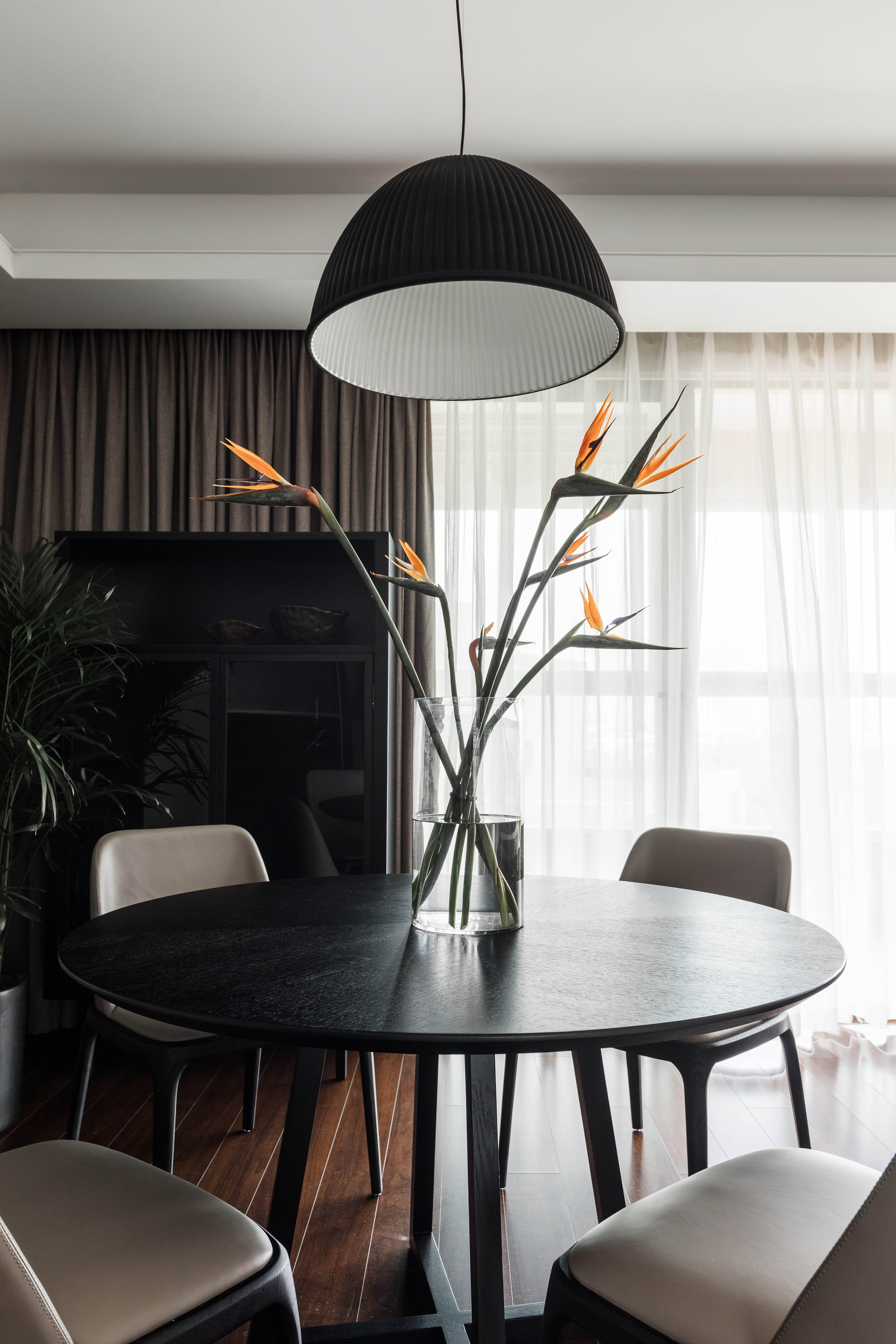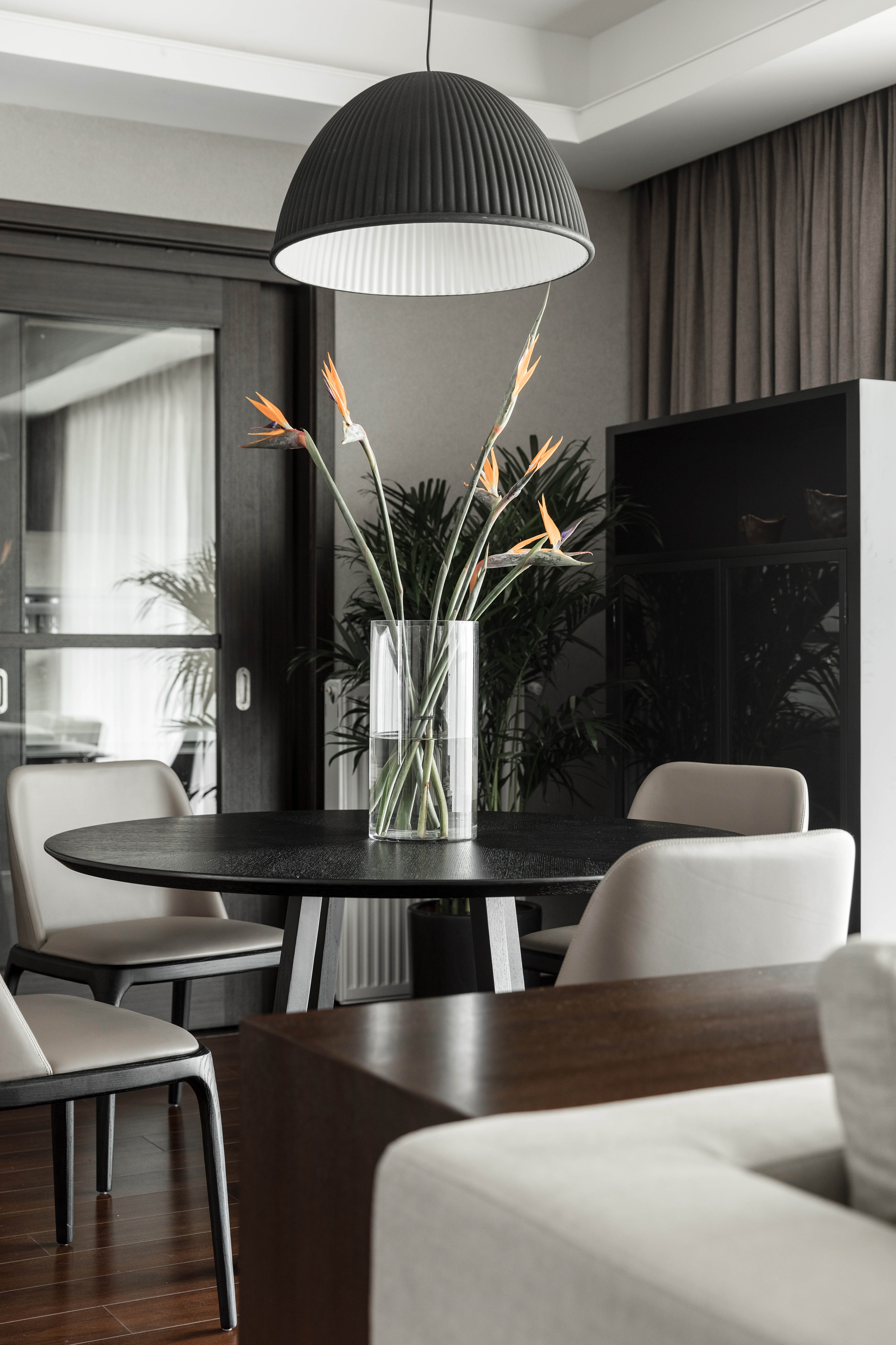 圆形的黑橡木实木餐桌,沙发背后的定制的矮餐边柜既让人在主沙发上的状态有着客户想要的安全感,又满足了储物功能和美化空间的层次感。