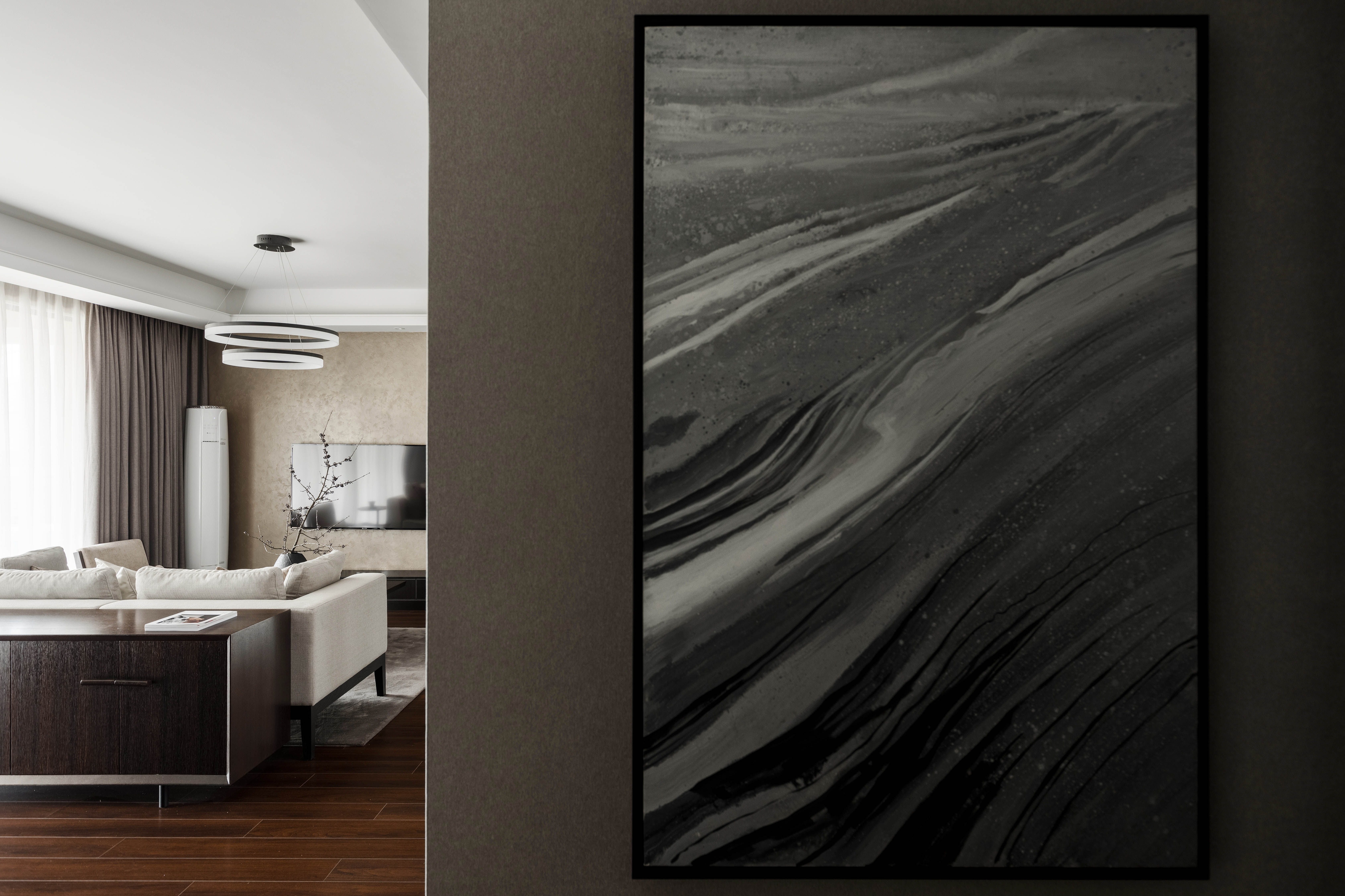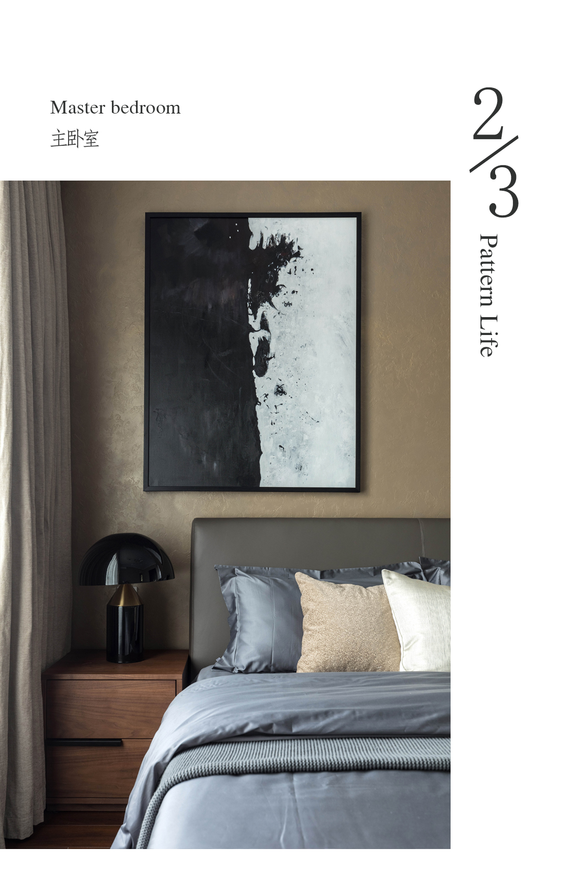 软装基料浅色棉麻布料+胡桃木色+浅色皮革+白色烤漆+深灰色细腻棉麻布+为项目特别定制的油画,用材料颜色线条营造出空间很重要的层次感。这也呼应梳理出设计主题:令人开阔身心的梯田。用梯田的几何元素进行提取,运用在我们的空间中。