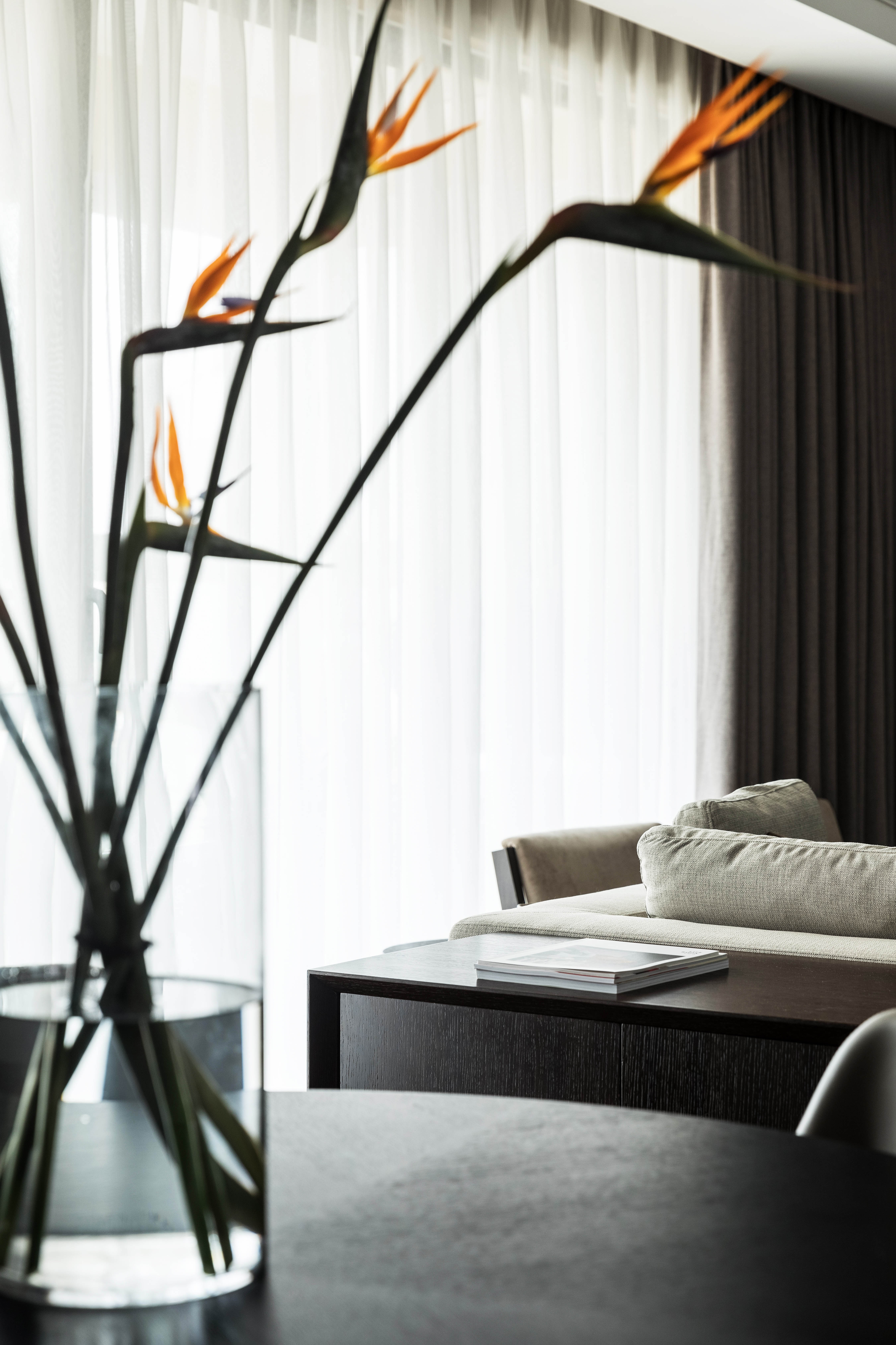 对于推拉窗旁边的区域,在空间尺度合理的情况下,我们也是增加了材质通透但形态庄重简单的餐边柜。