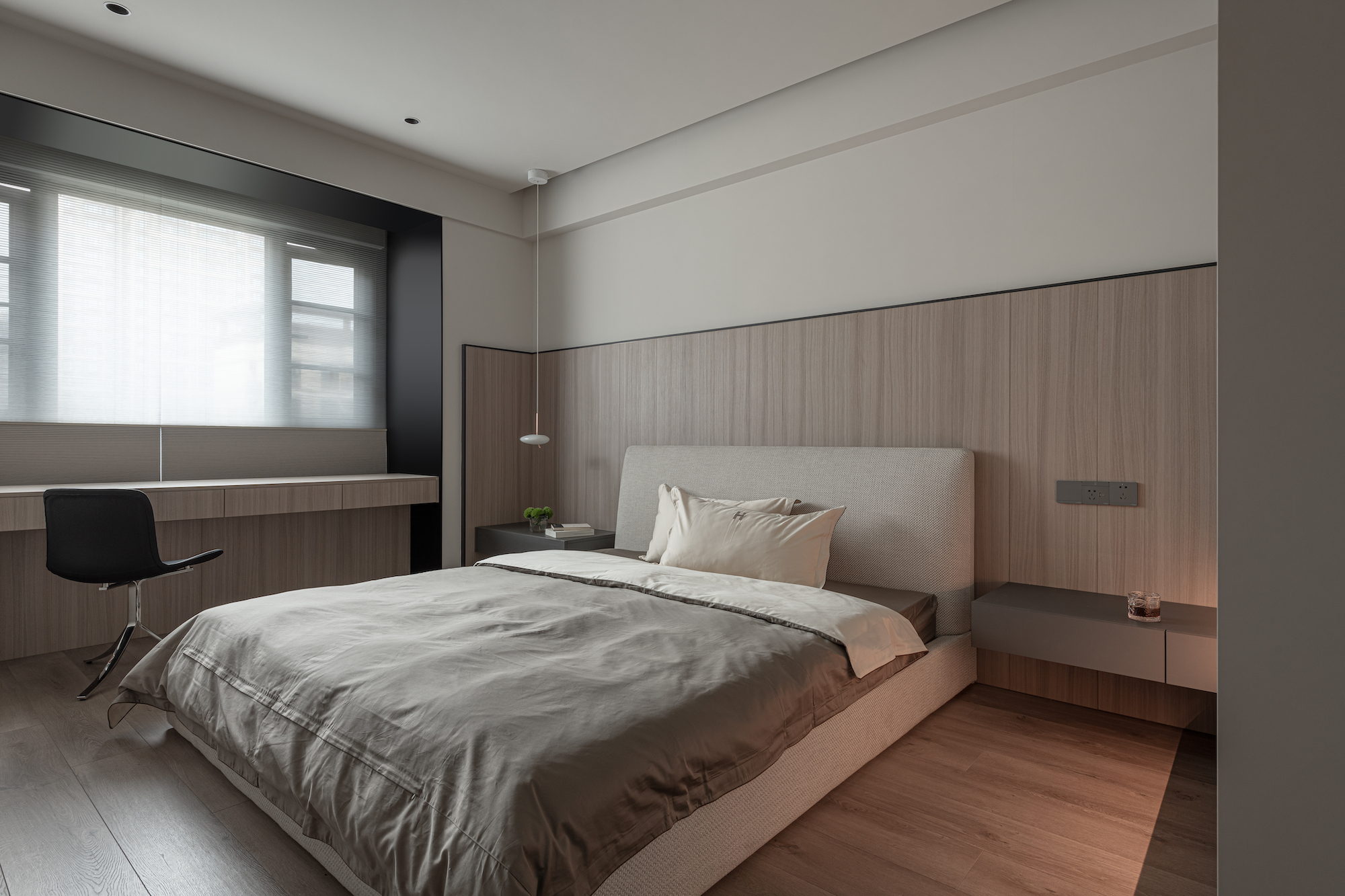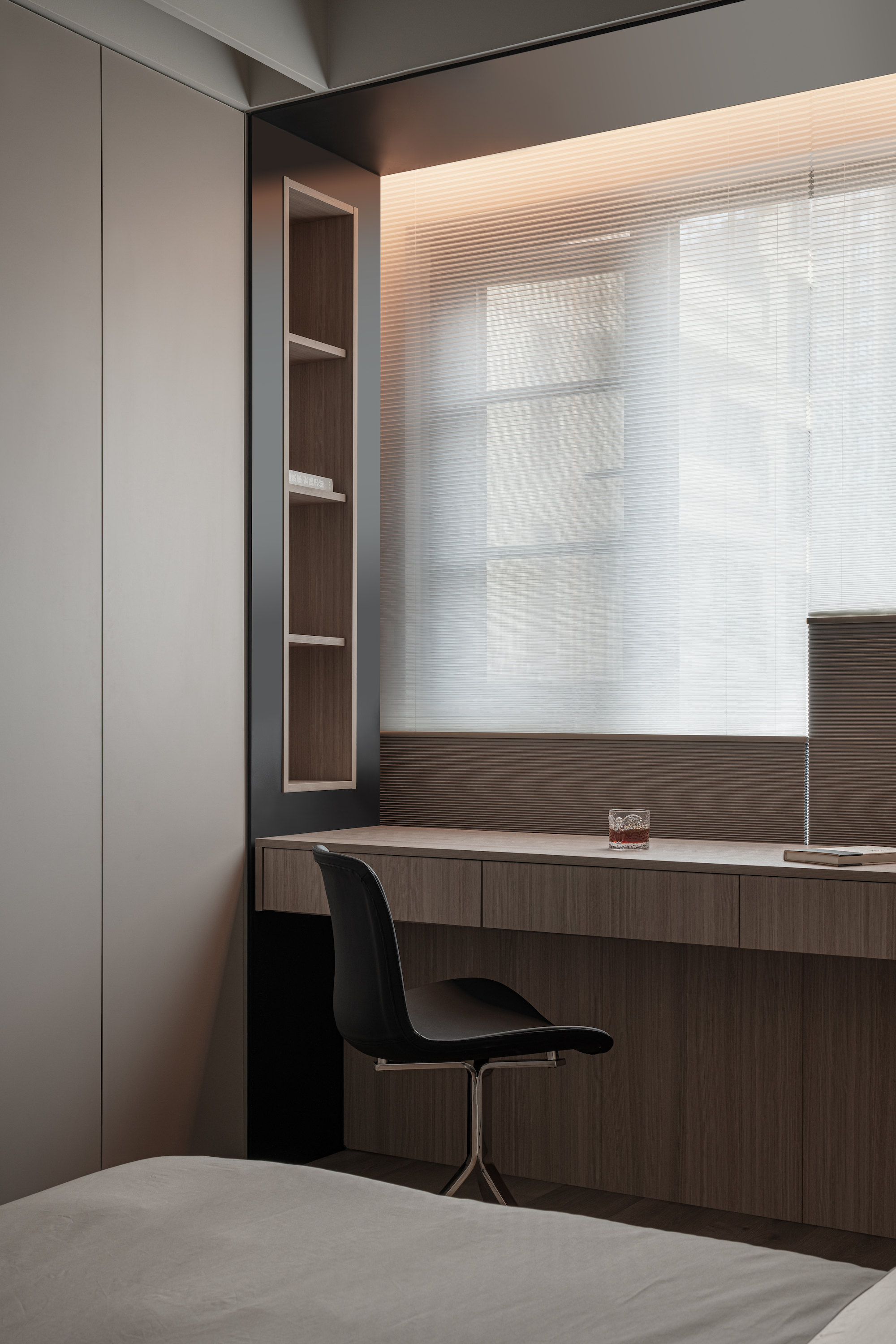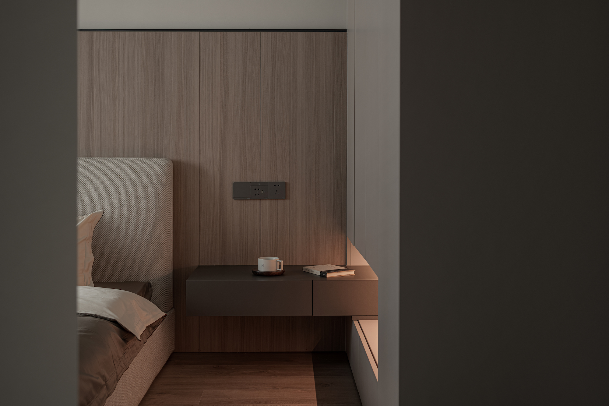 延续外部木头材质铺贴地板及包裹床头墙体,加入立体层次。悬浮床头柜嵌入衣柜设计一体化体块,呈现更轻盈灵活的陈设方式。丰富空间整体内容,塑造自然、舒适的素雅气质,提升睡眠幸福感。
