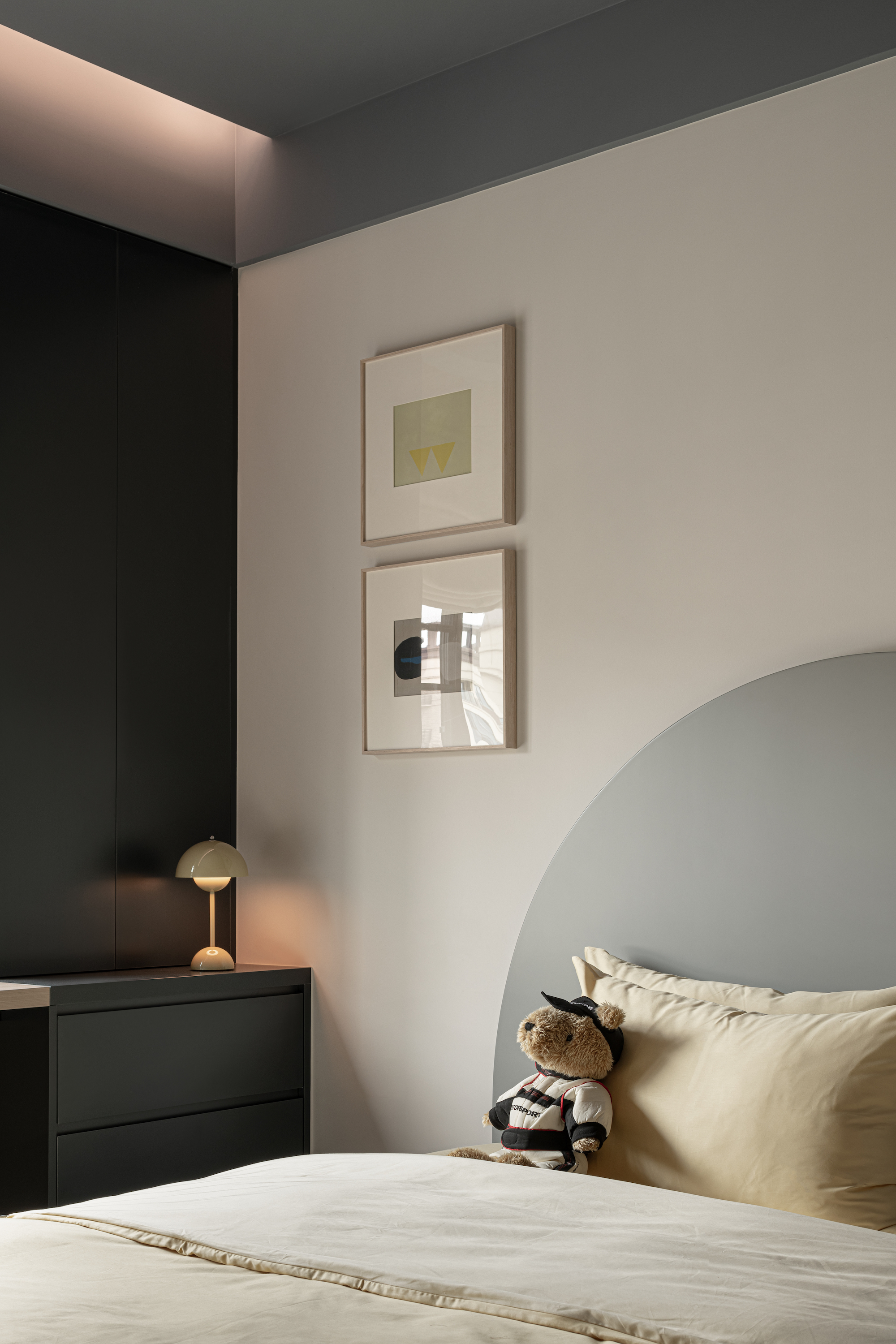 原本主卧的门洞改造为与墙面一体的隐形门,提升空间的整体效果,也让孩子在此空间玩耍时增添乐趣。
