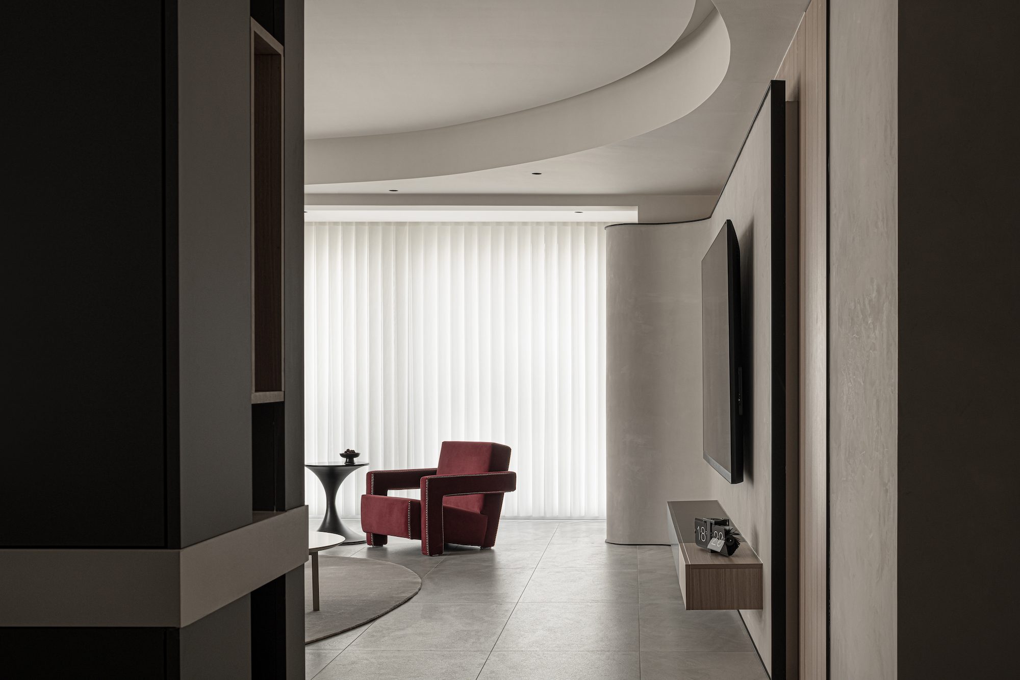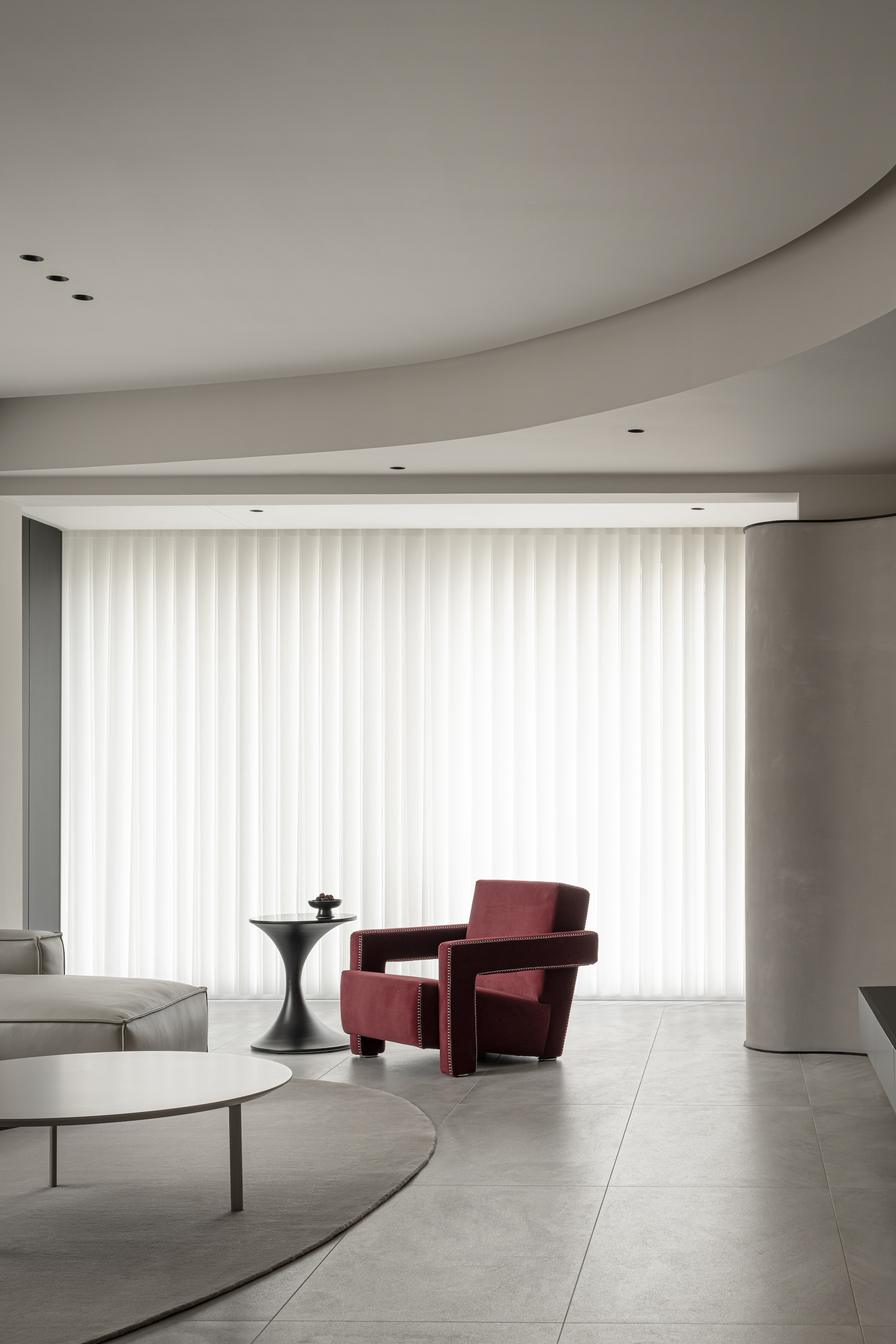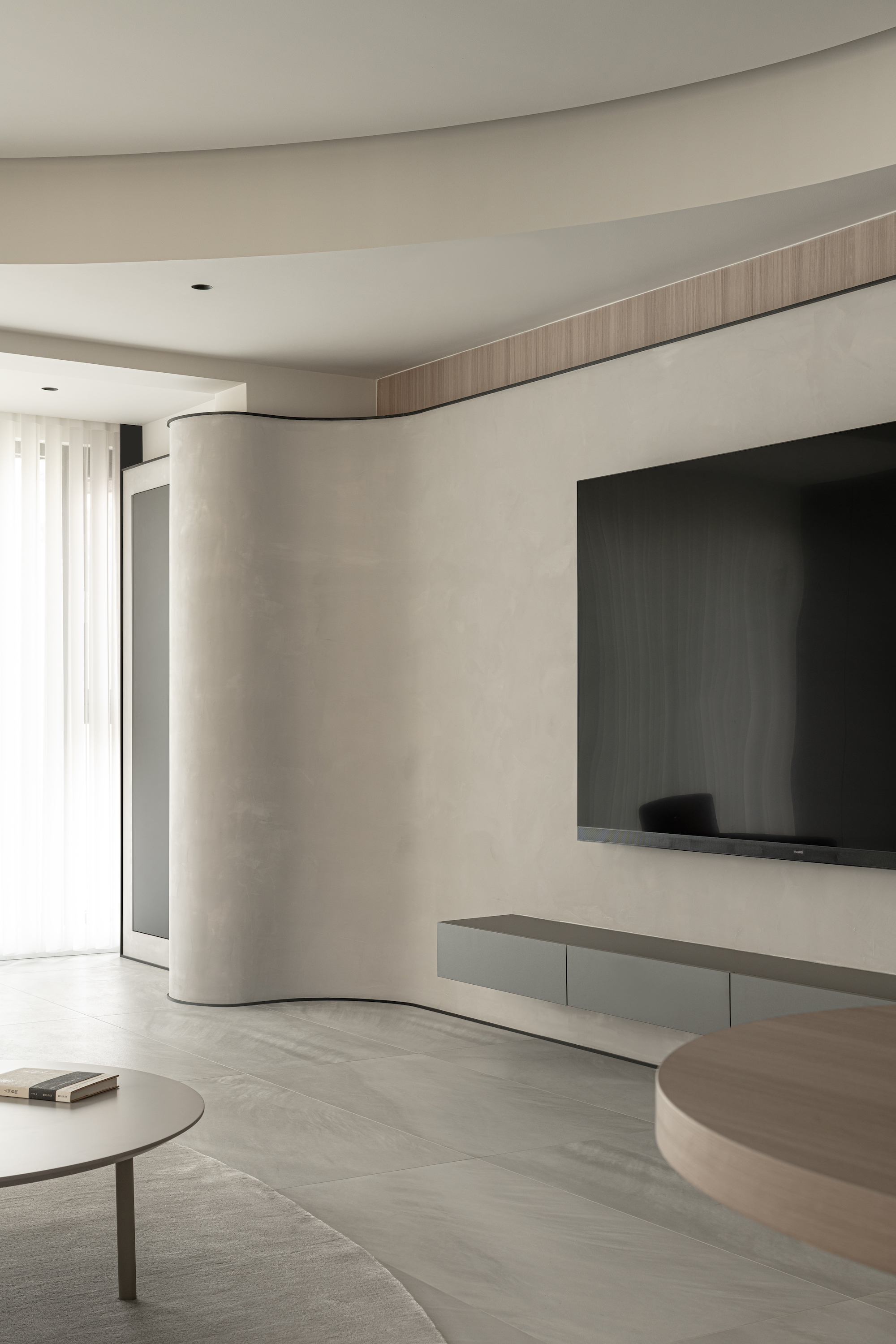 大面积落地窗户,引入更多的自然光线,以艺术漆、木材强化肌理。横、竖曲线蔓延,塑造空间的立体视觉,在静态与动态之间连续性不断增强。