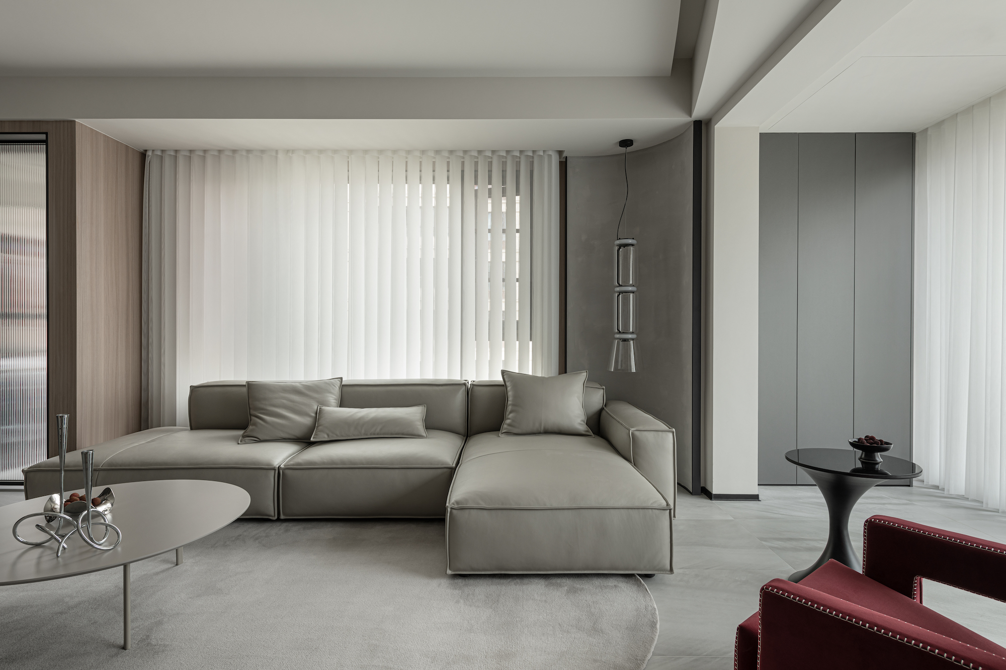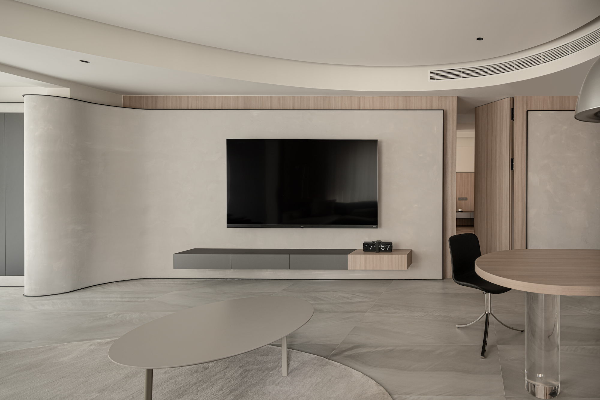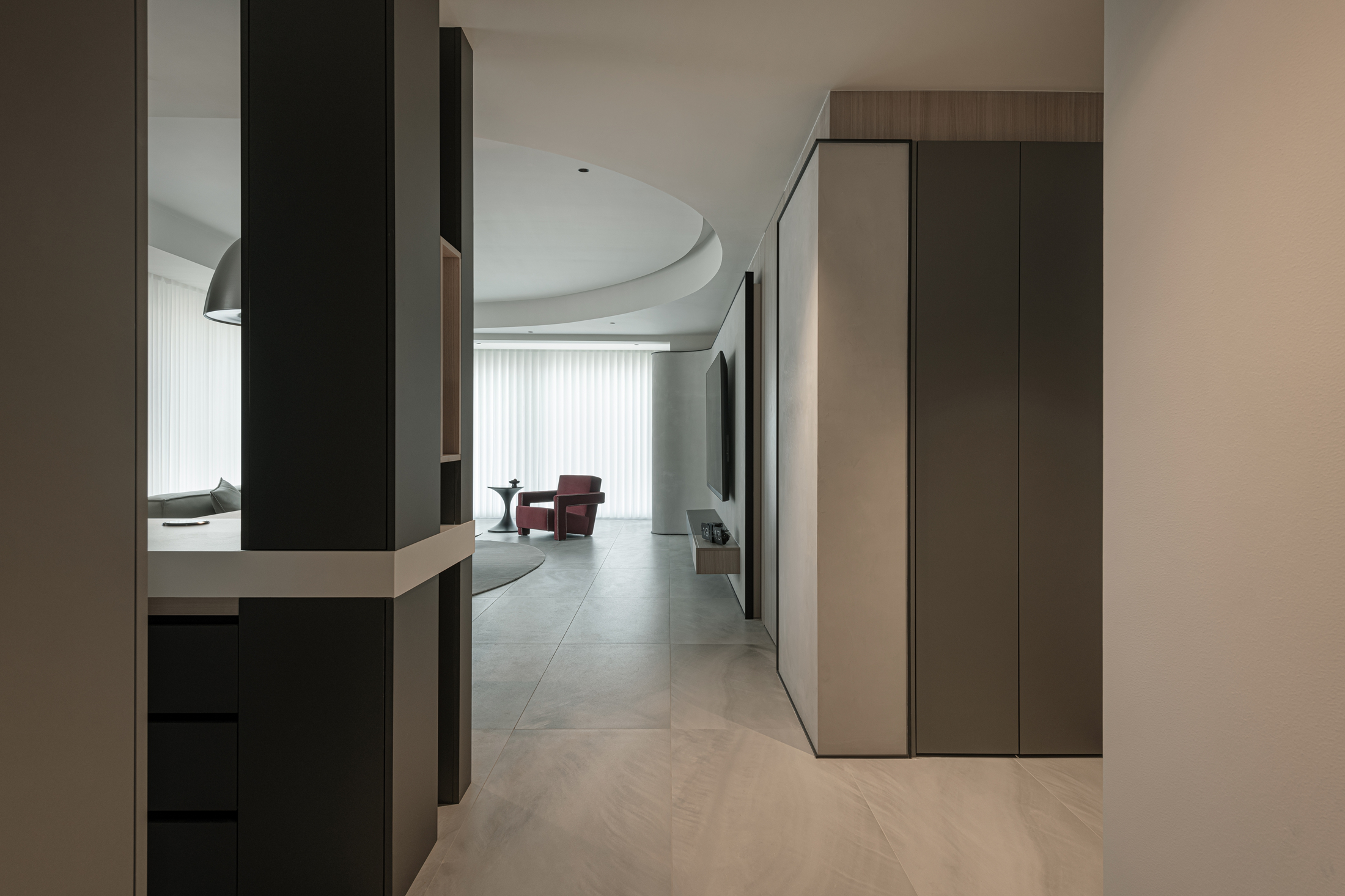 大面积落地窗户,引入更多的自然光线,以艺术漆、木材强化肌理。横、竖曲线蔓延,塑造空间的立体视觉,在静态与动态之间连续性不断增强。