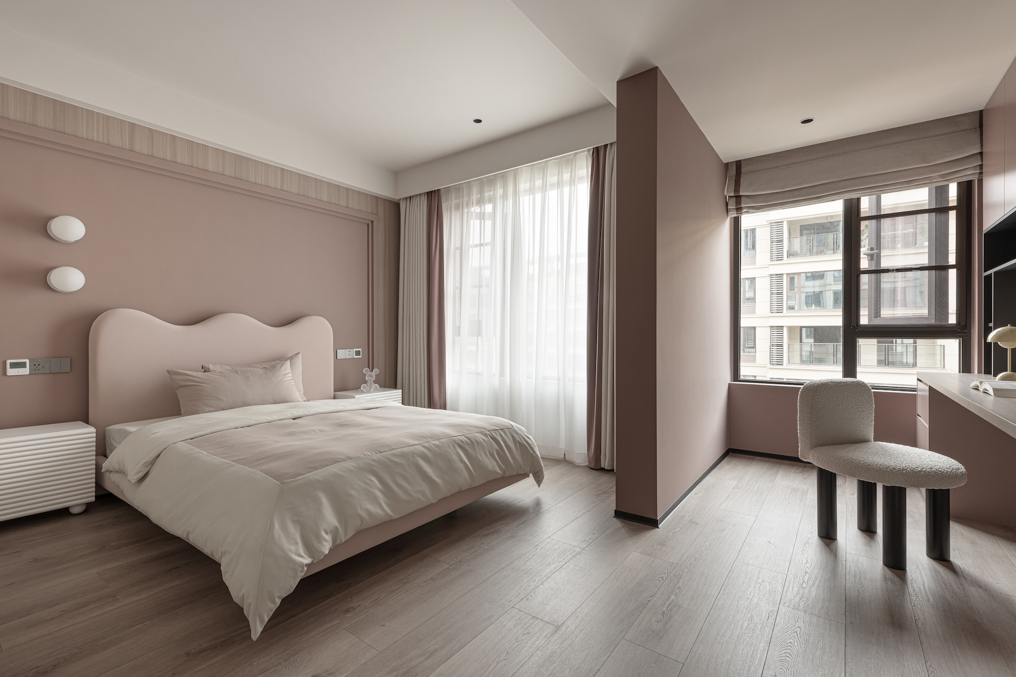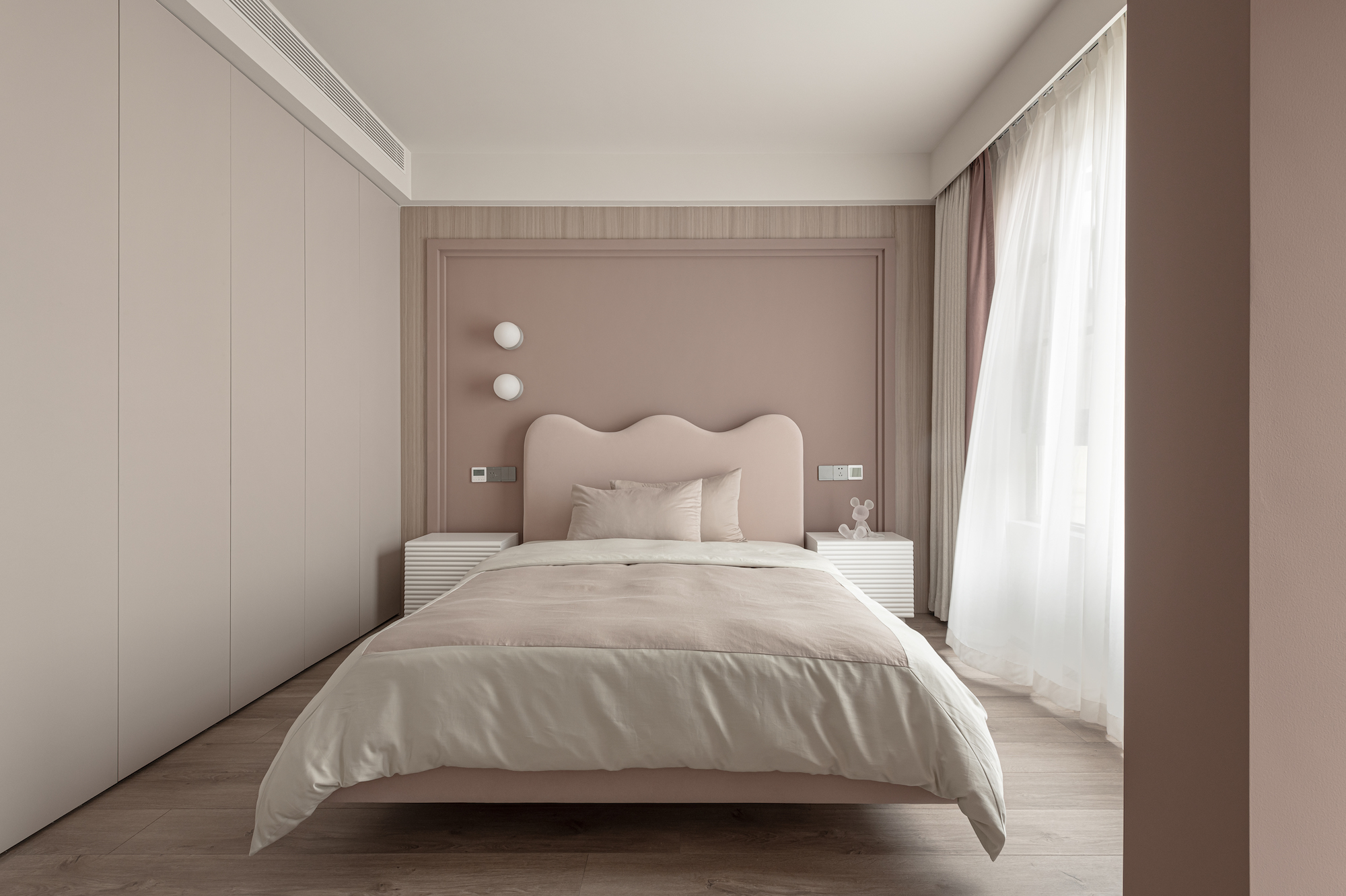 儿童房A:运用同系列不同色度的粉色串联融合,并搭配几何构图来强调整体视觉。床头背景墙,利用与叠构关系达成与外部空间的呼应和统一,将平面转化为立面。最后点睛为其加入两颗小圆壁灯,为6岁的女儿烘托出精致梦幻的少女时代宣言。