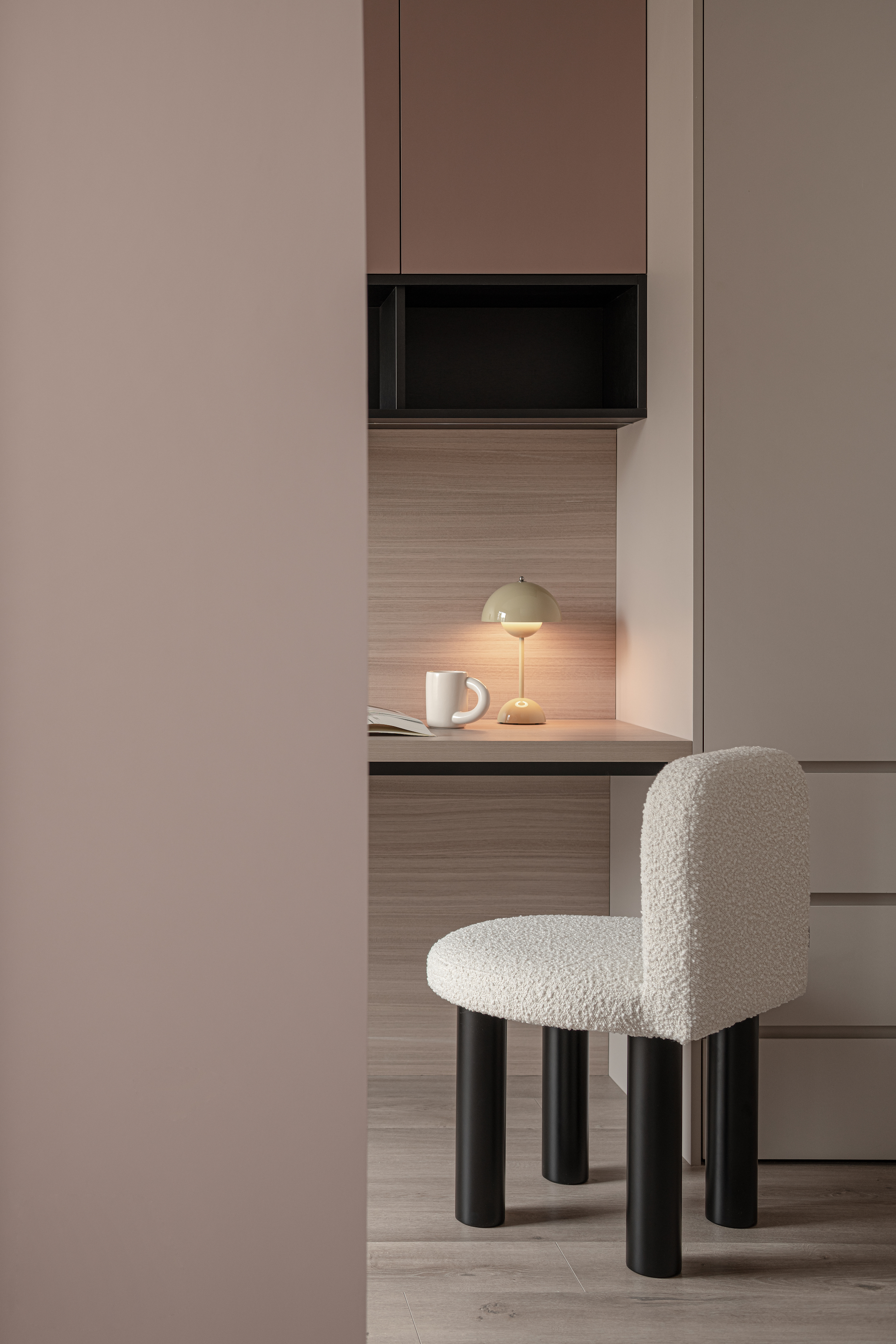 扩大空间使用后的女儿房,配有独立的功能书房。因即将开启小学生活,之后的学习任务也会逐渐增强,利用光影、色彩、肌理之间产生的互动关系,为其营造柔和专注的学习氛围。