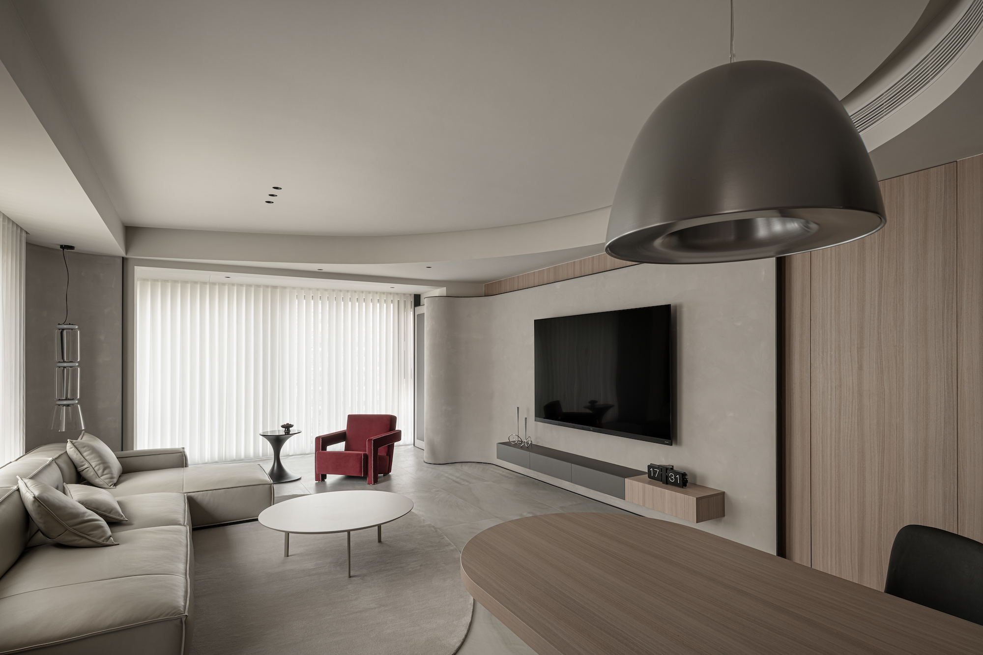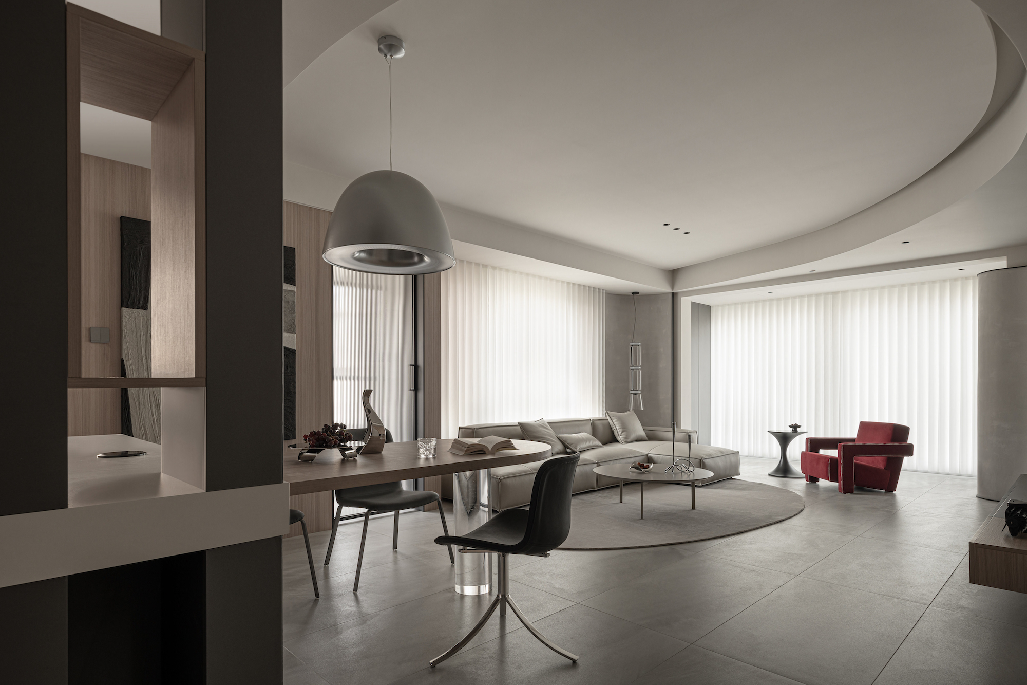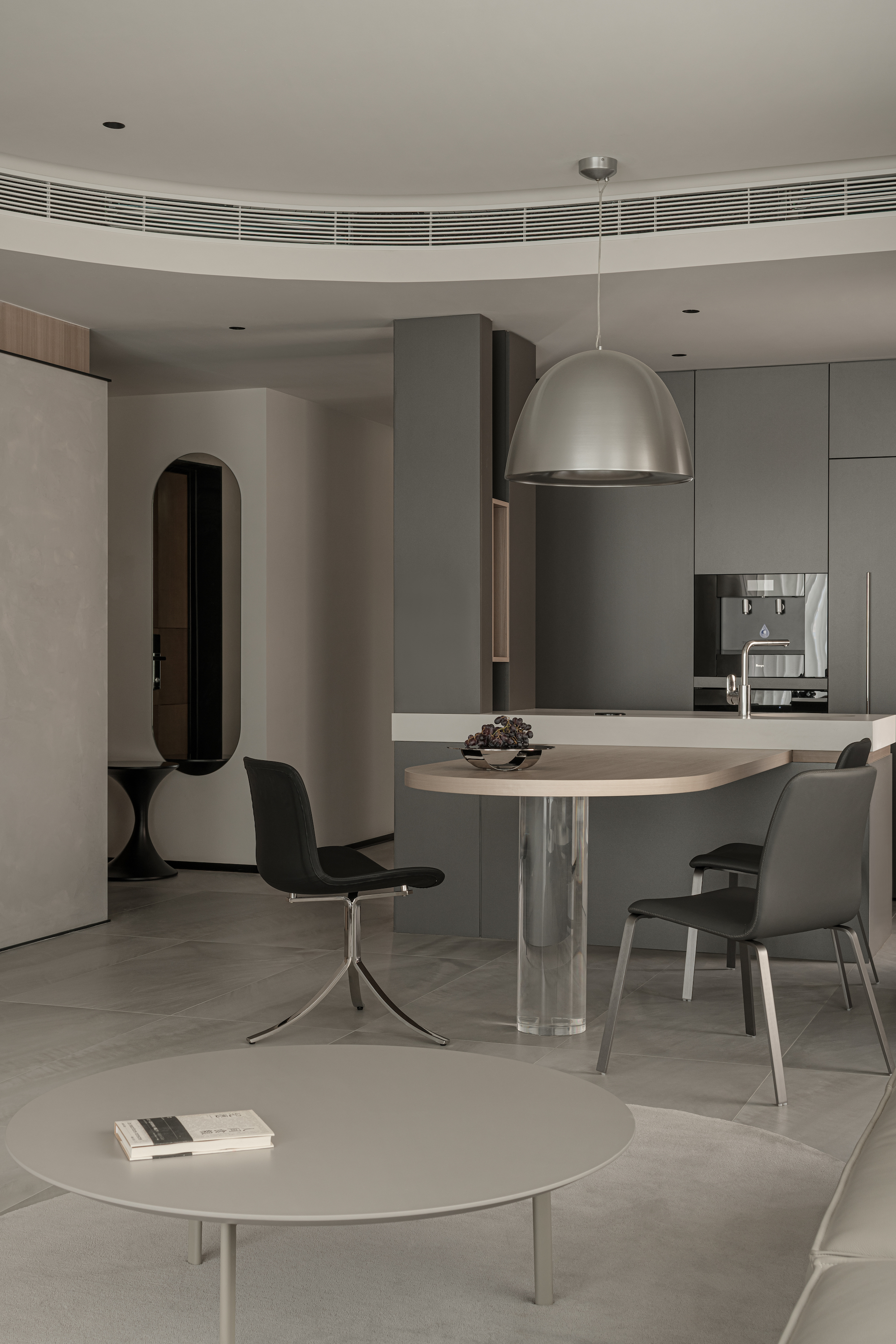 从阴角处开始,曲线环绕整个客餐厅顶面,形成无限扩展的自然穹顶。消除界限,停驻于有形亦无形的空间内,以感知对话,为它注入意义和感觉,引导家人更好地享受生活。