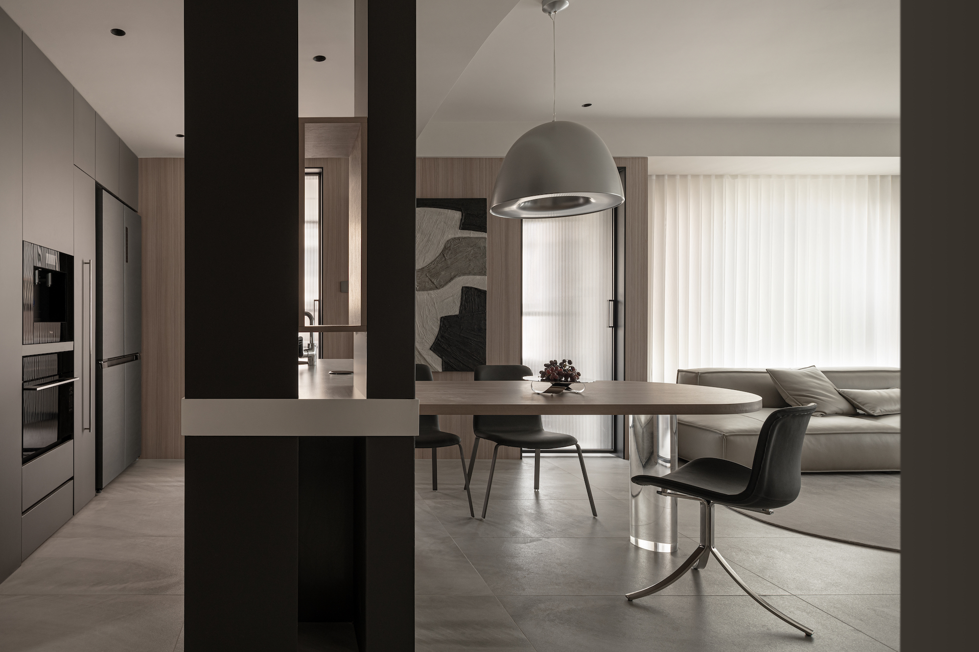 由外至内,利用解构手法将原本阻挡视线的厚重墙体,改变为具有视觉穿透力的结构框架。以功能造景,既是玄关、也是西厨。 通过对近、中、远关系之间的层层递进,将入门之人的内心迅速牵入其中,使其视线能够在空间中穿行、游走,并早以为其规划好不同的功能区域合理的、便捷的行动路径。