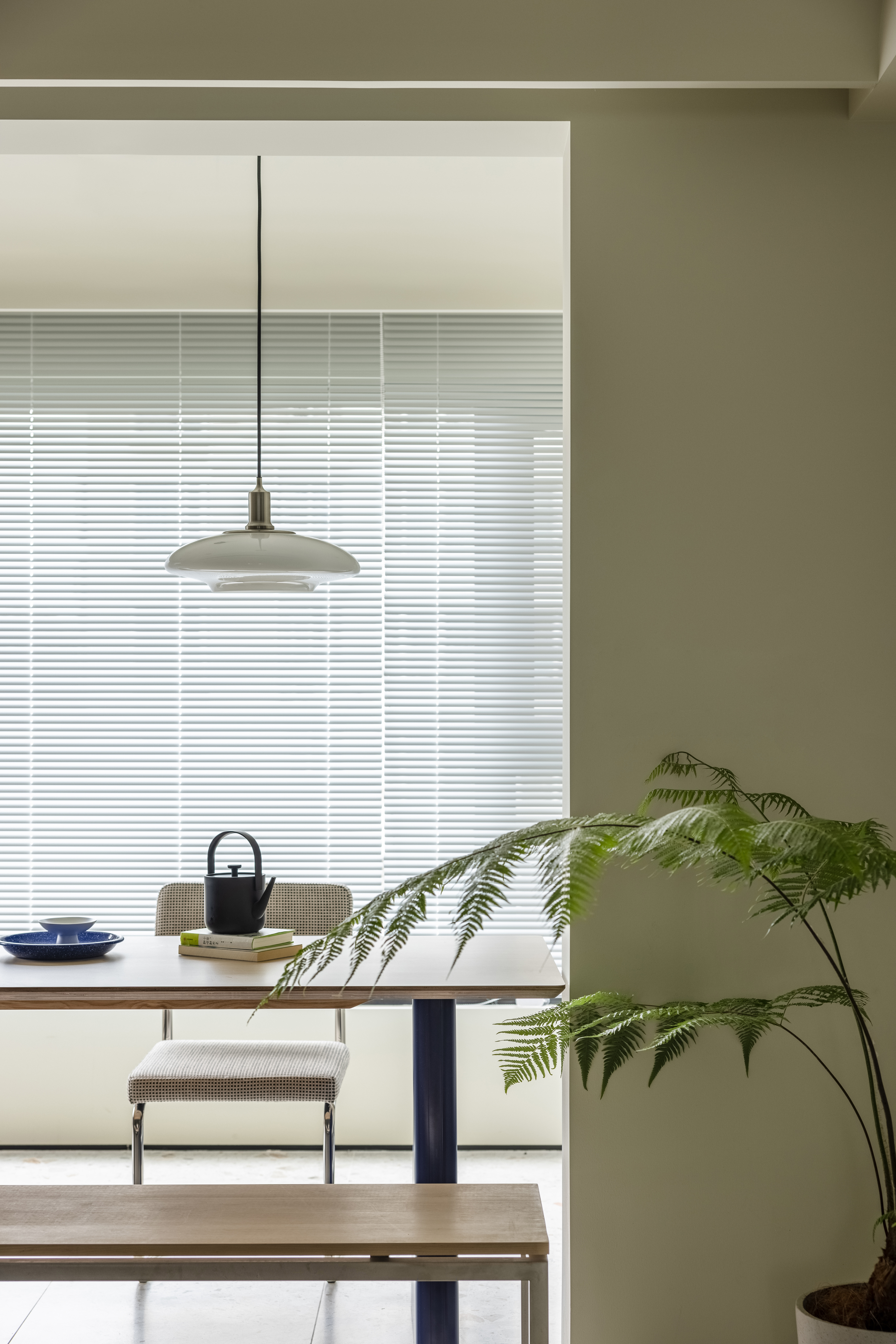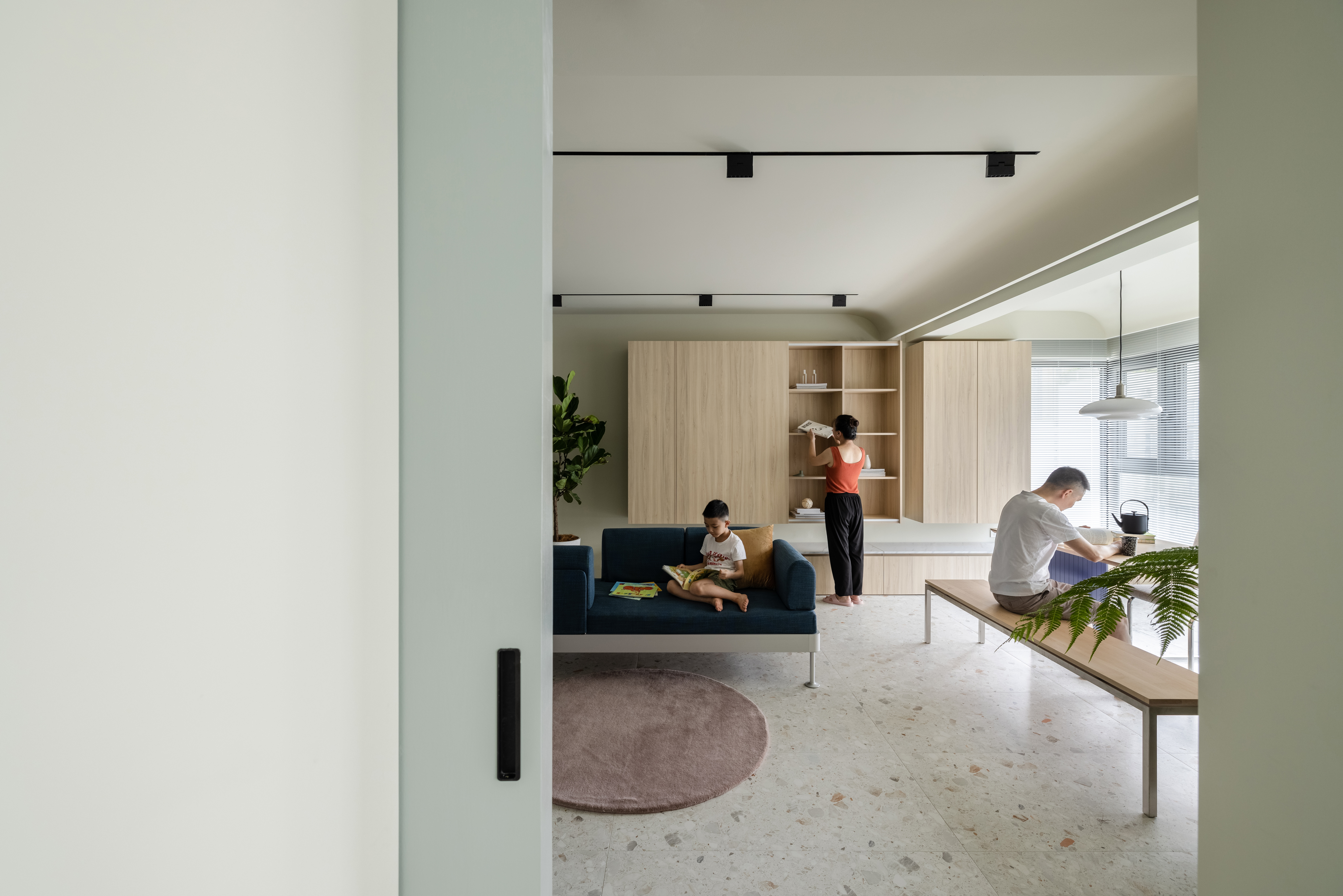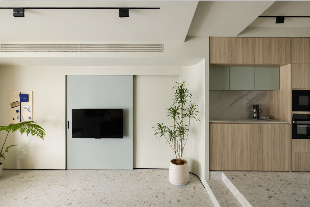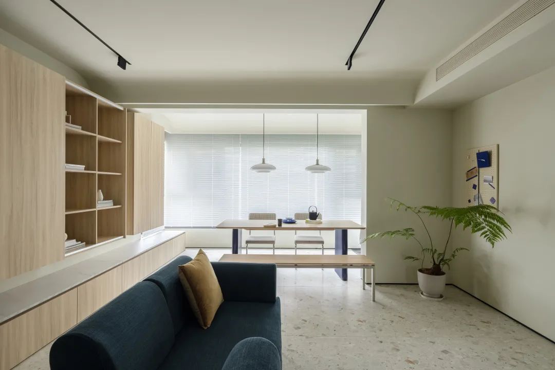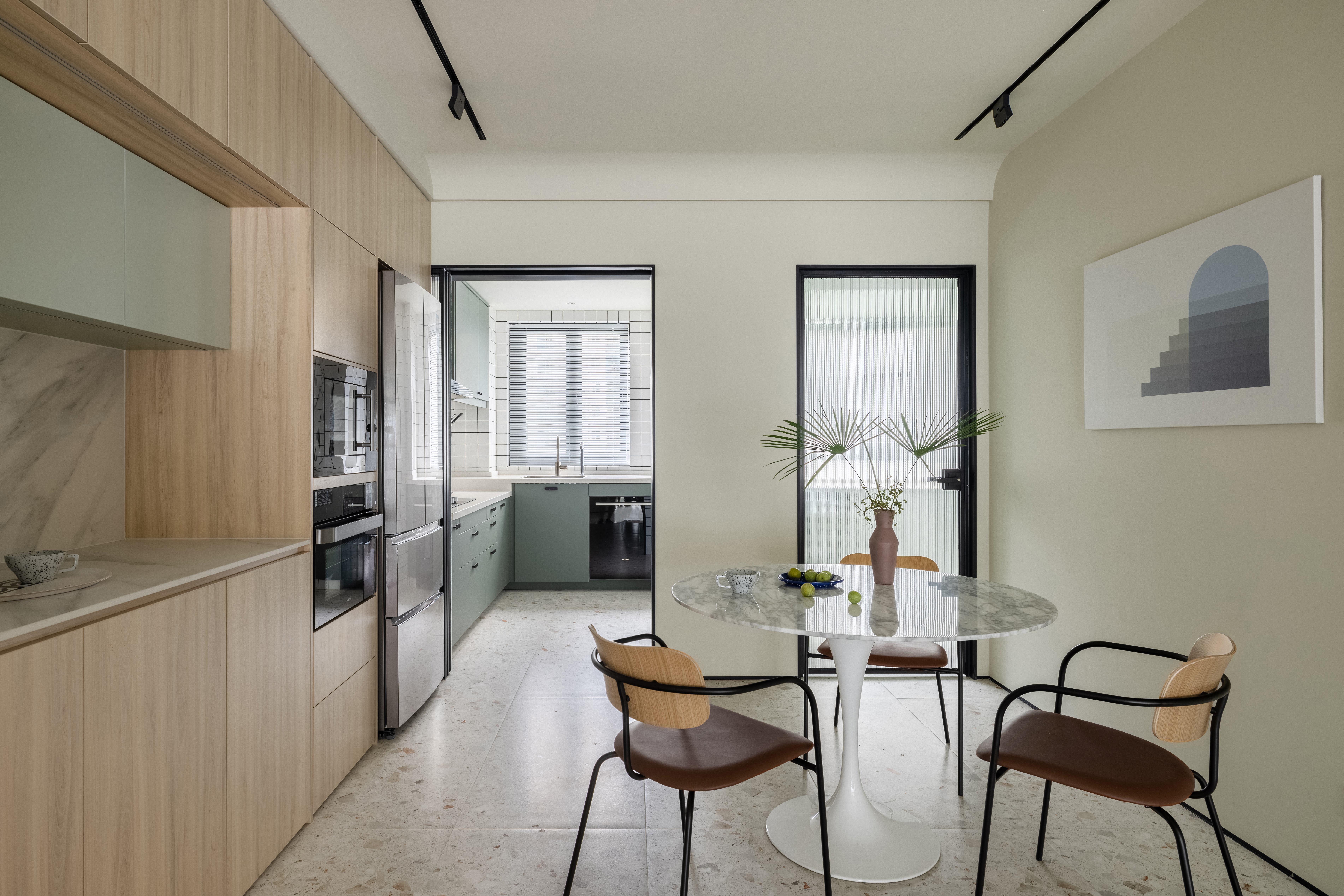 客厅、餐厅、厨房相连,考虑到外婆每天都会为家人做饭,为避免油烟在室内四散,厨房特地做了口袋移门,平时收起移门即是开放厨房,必要时拉出移门就能阻隔油烟。