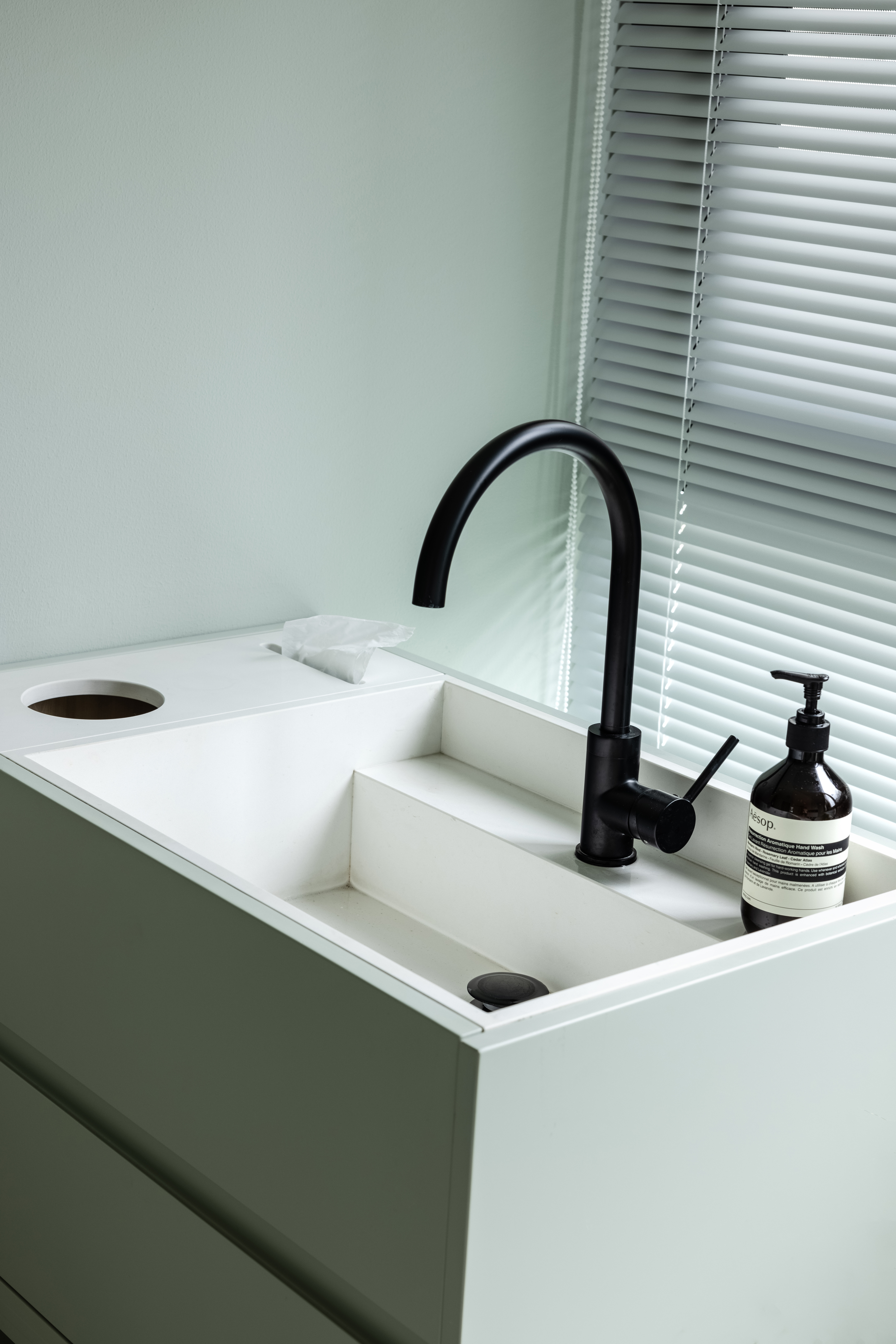 换鞋+衣帽挂放后,玄关最后一个动作就是洗手消毒,洗手盆是定制的杜邦一体盆,把水槽+擦手纸巾+纸巾篓三个功能整合到一个台面,易于打理快捷方便。
