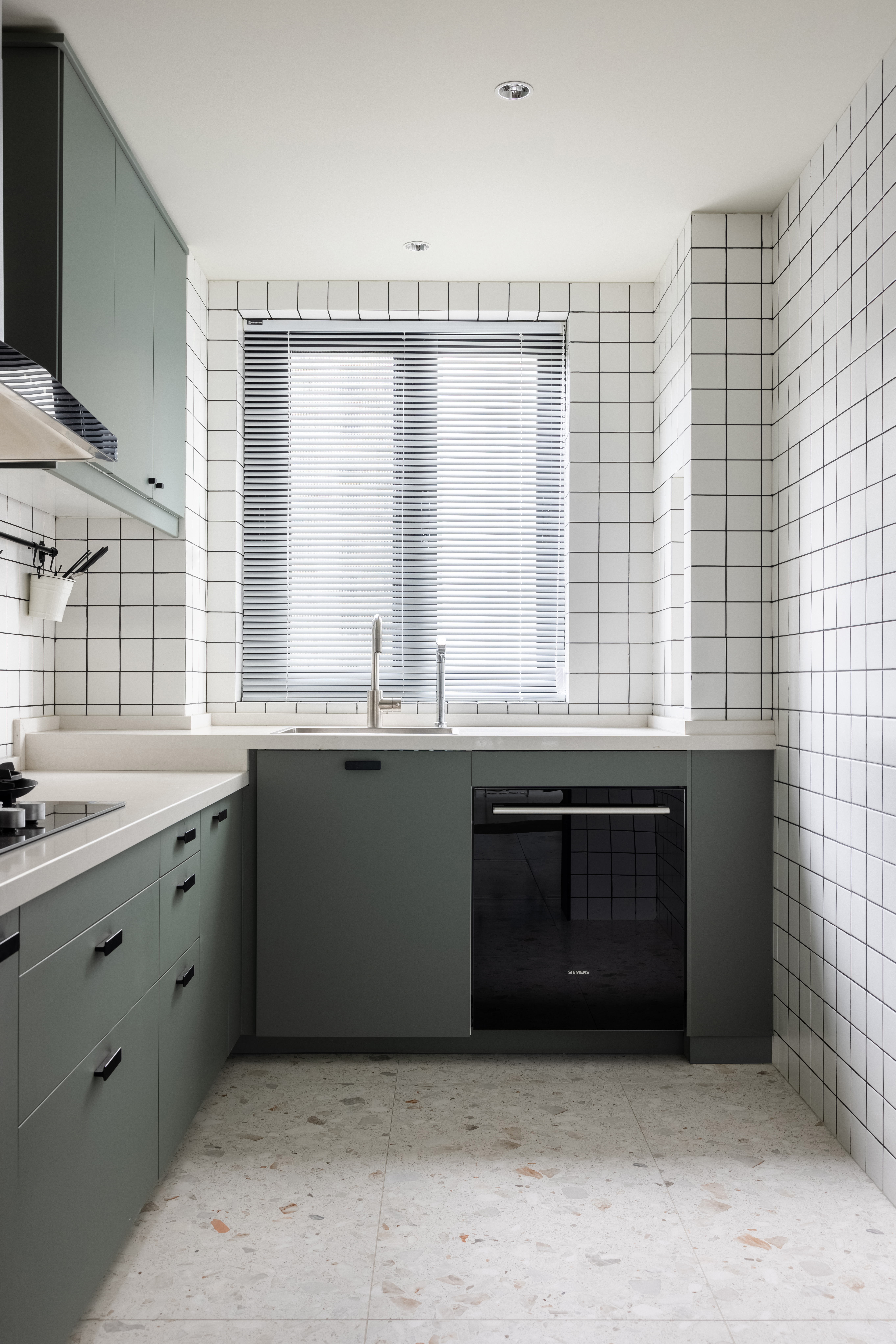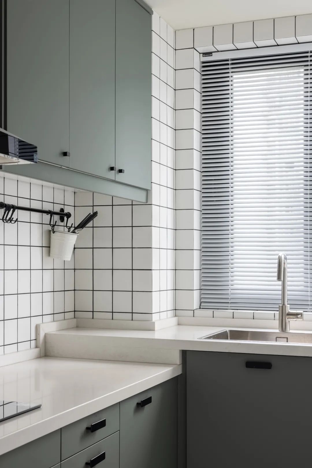 橱柜是宜家米多系统,橱柜高度是根据屋主身高来定制的,操作起来更加轻松应手,灰绿色门板搭配白色小方砖堆砌出视觉层次,空间敞亮整洁。