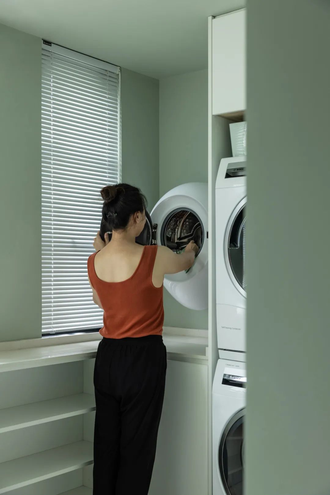 与厨房一墙之隔是家政间,有娃家庭增加一台挂壁洗衣机能节省不少的清洗衣物时间,同时搭配洗烘工作站家政工作也变得轻松便捷。