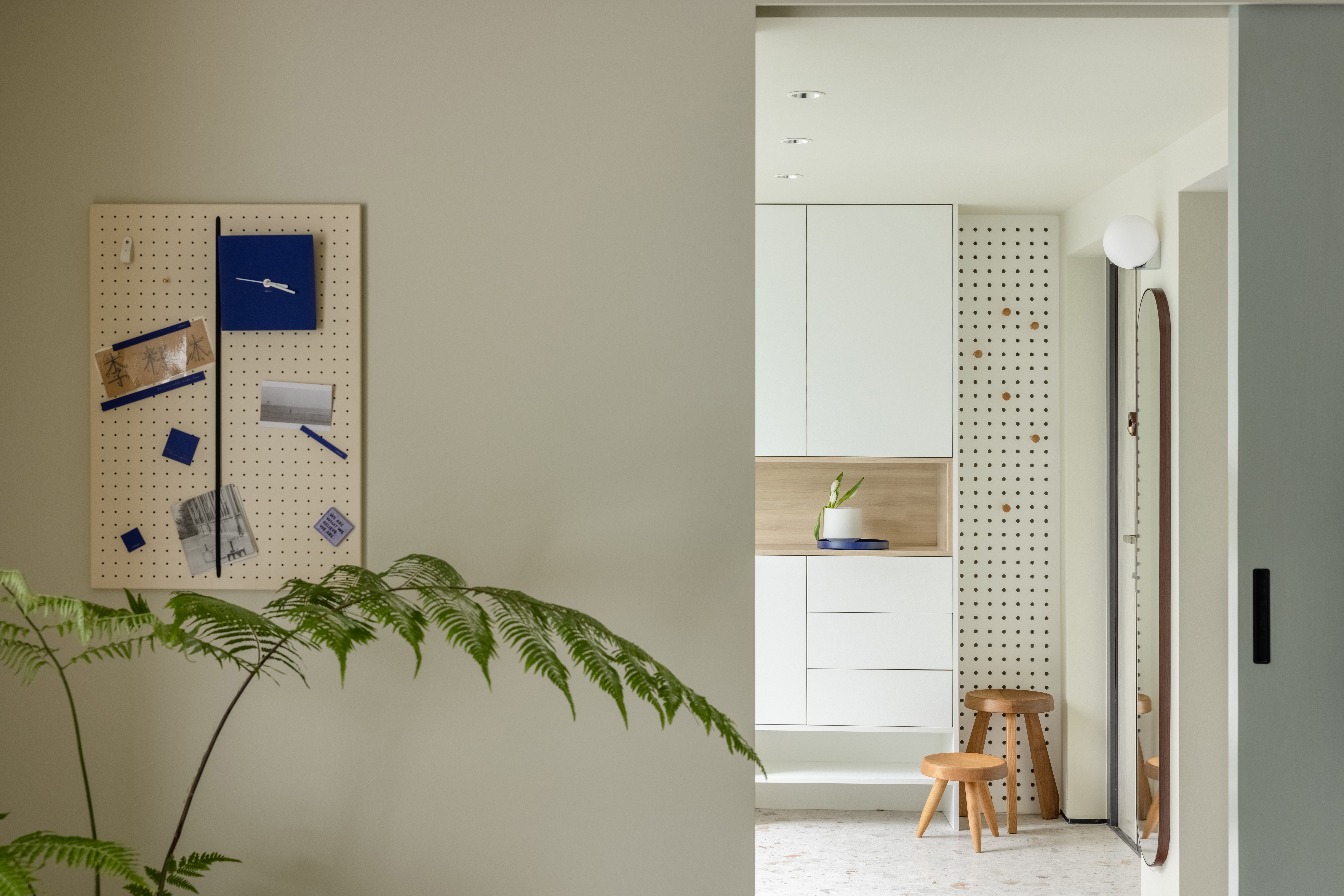 鞋柜上我们也做了细分,中间开架的台面可以做为包裹临时拿放收纳区域,同时也可以放置香氛或者花瓶进行点缀,轻松打造回家仪式感,鞋柜底部做了临时放鞋的区域,简单实用,临近入户门一侧设置了洞洞板便于弹性设置简易挂放功能。