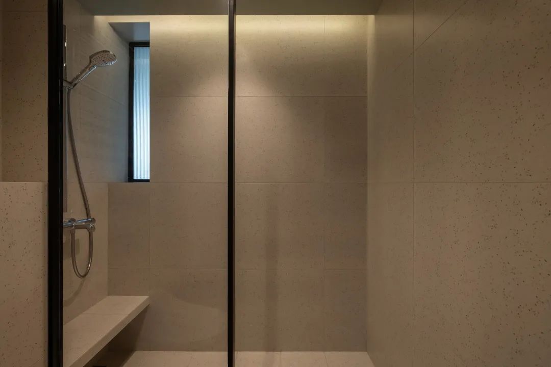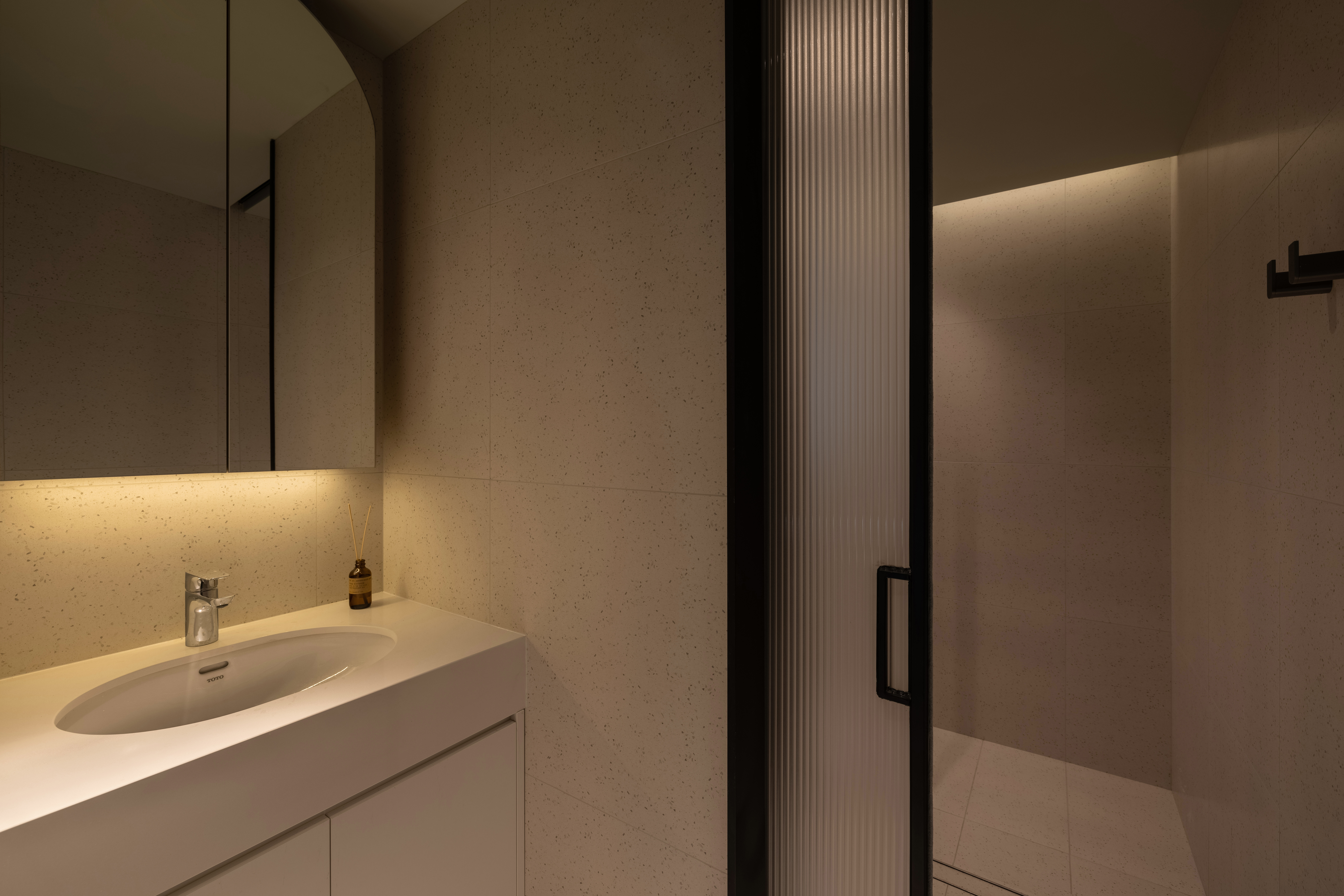 客卫空间采用了浅米色的水磨石砖墙地通铺,模糊墙地交界,倍化空间视觉。洗漱台单独隔离出来,便于有娃家庭早晚高峰的使用,淋浴房+马桶间区域和洗漱台区域用单面磨砂的长虹玻璃口袋门弹性隔断,保证空间感同时又保证了隐私。