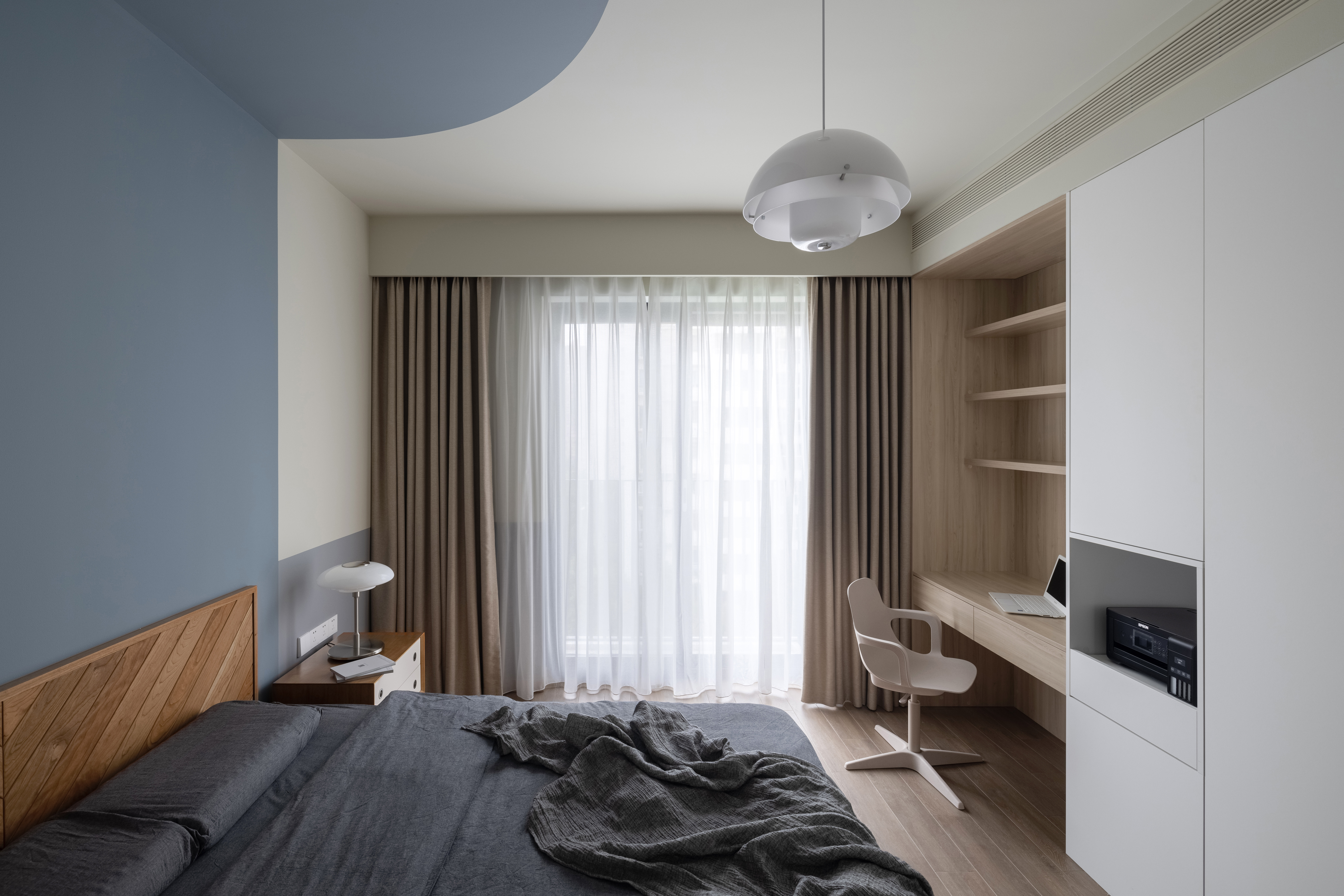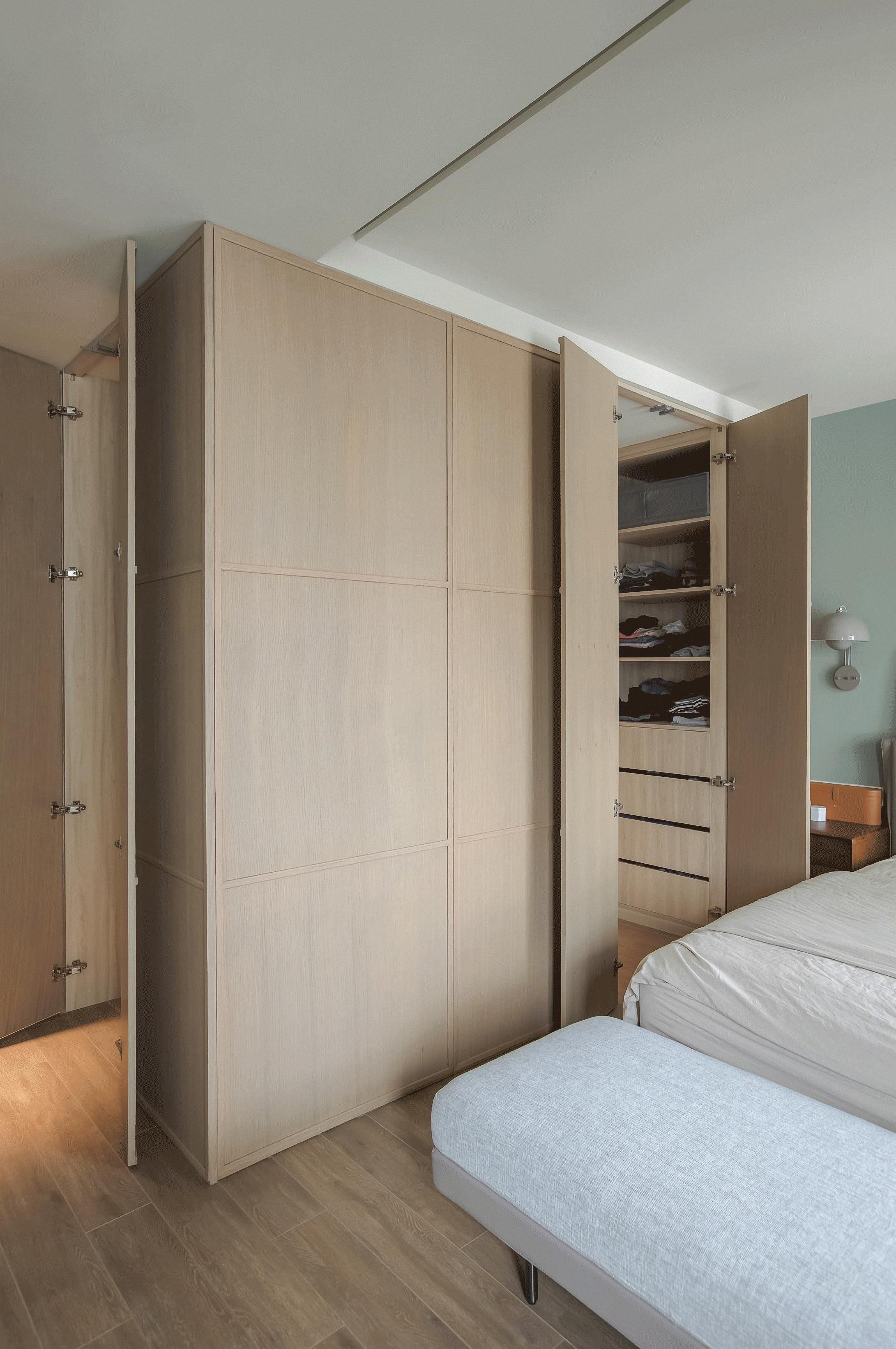 主卧采光上佳,室内延续了女主人偏爱的雾绿色,搭配灰木调的柜体,空间氛围自由放松,并未多做繁琐设计。