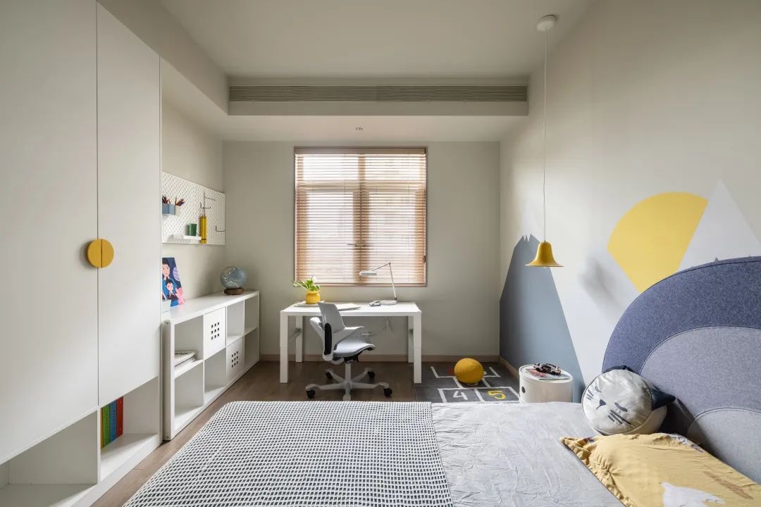 利用儿童房的好采光,使用孩子喜好的色彩用乳胶漆做一面简单墙画,凸显个性同时,较高彩度的几何图案让空间充满趣味。