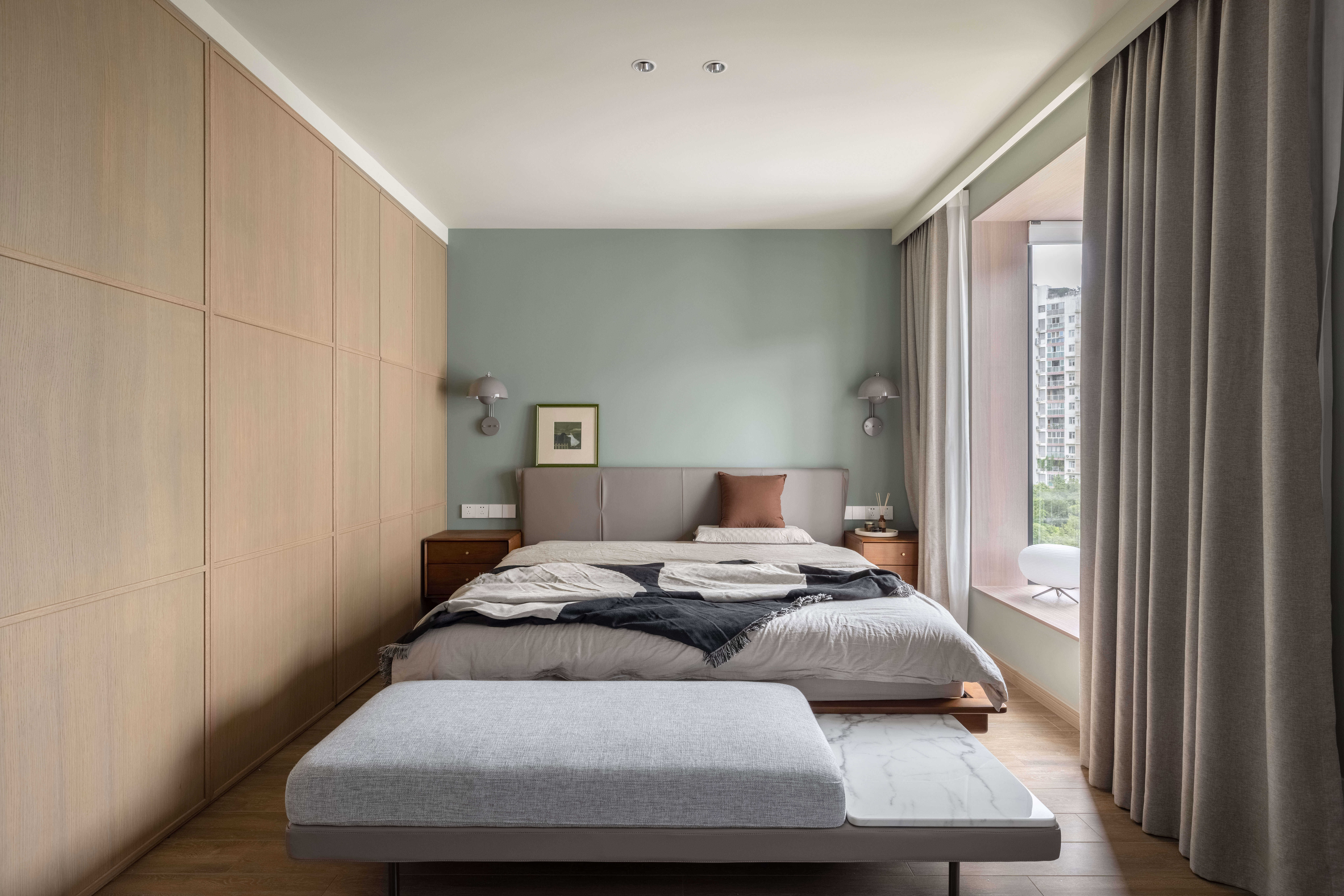 5.主卧采光上佳,室内延续了女主人偏爱的雾绿色,搭配灰木调的柜体,空间氛围自由放松,并未多做繁琐设计。