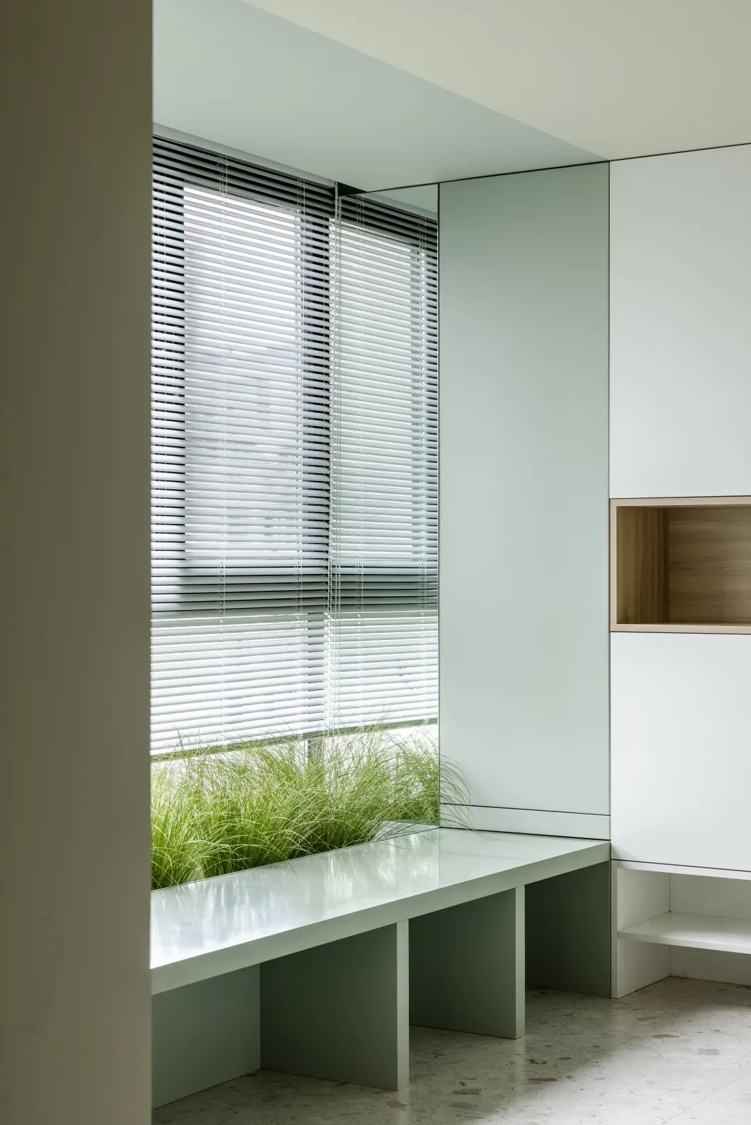 玄关设计了屋主入户需求一体化解决方案,鞋柜到顶能收纳80双鞋左右,在落地窗一侧设计了换鞋卡座+植物槽,靠窗的柜体用镜面做了封板,遮蔽管体同时又延伸窗景,种植槽的植物是盆装,可以随季节或心情换上不同的植物,就能轻松制造出入门的好感觉,功能颜值两不误。