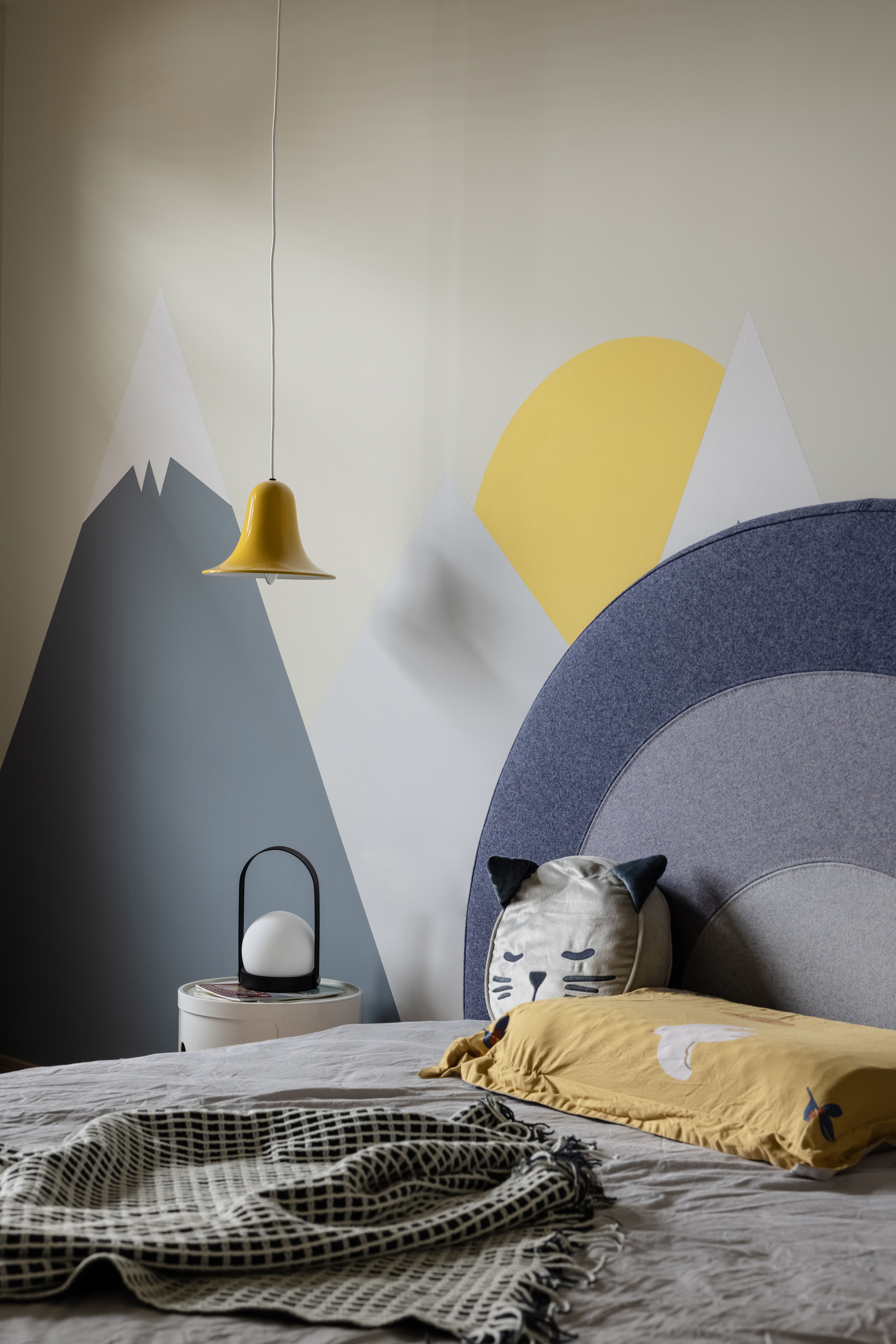 3.利用儿童房的好采光,使用孩子喜好的色彩用乳胶漆做一面简单墙画,凸显个性同时,较高彩度的几何图案让空间充满趣味。