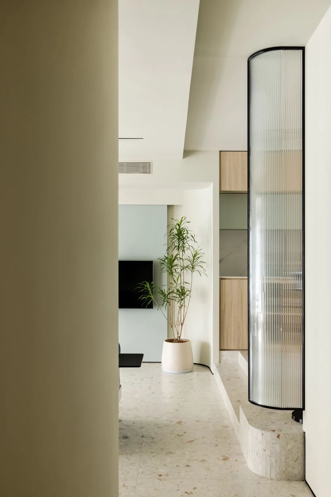 通过加入弧形线条拓宽错层台阶搭配顶面叠级的处理弱化客餐厅错层带来的生硬感,阳光充足的的住宅特别合适在室内摆些大型的植物,为色调温润的居家空间增加绿意和生气。