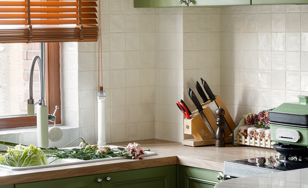 独立的中厨空间能够有效阻隔油烟,浅灰色橱柜与地砖统一调性,保持厨房的整洁干爽,L型台面最大化利用空间面积,动线合理,烹饪操作更加顺手
