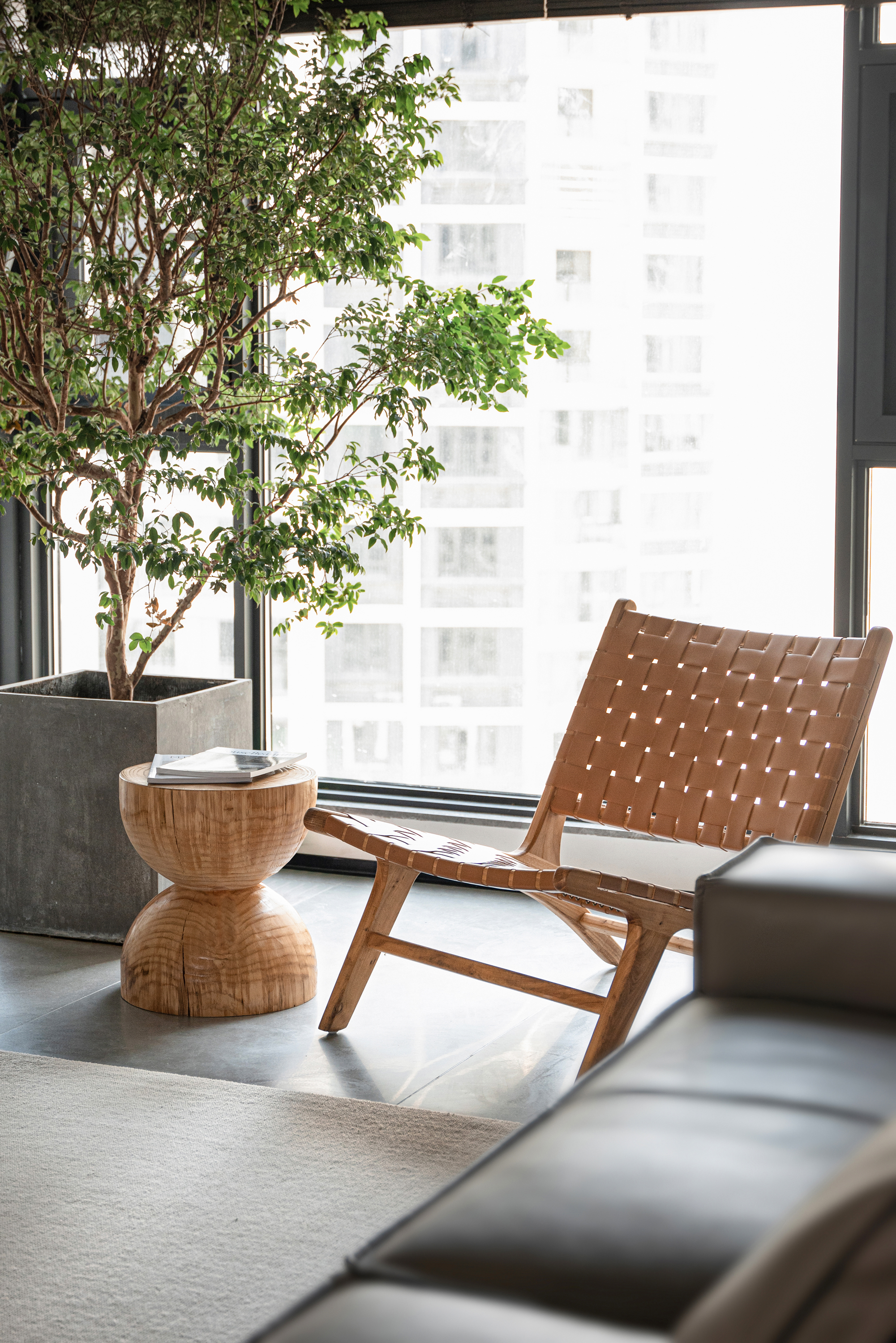 设计选材:选材上以原木、藤椅、木百叶窗帘、羊毛地毯和麻布抱枕,让空间更加环保、低碳。