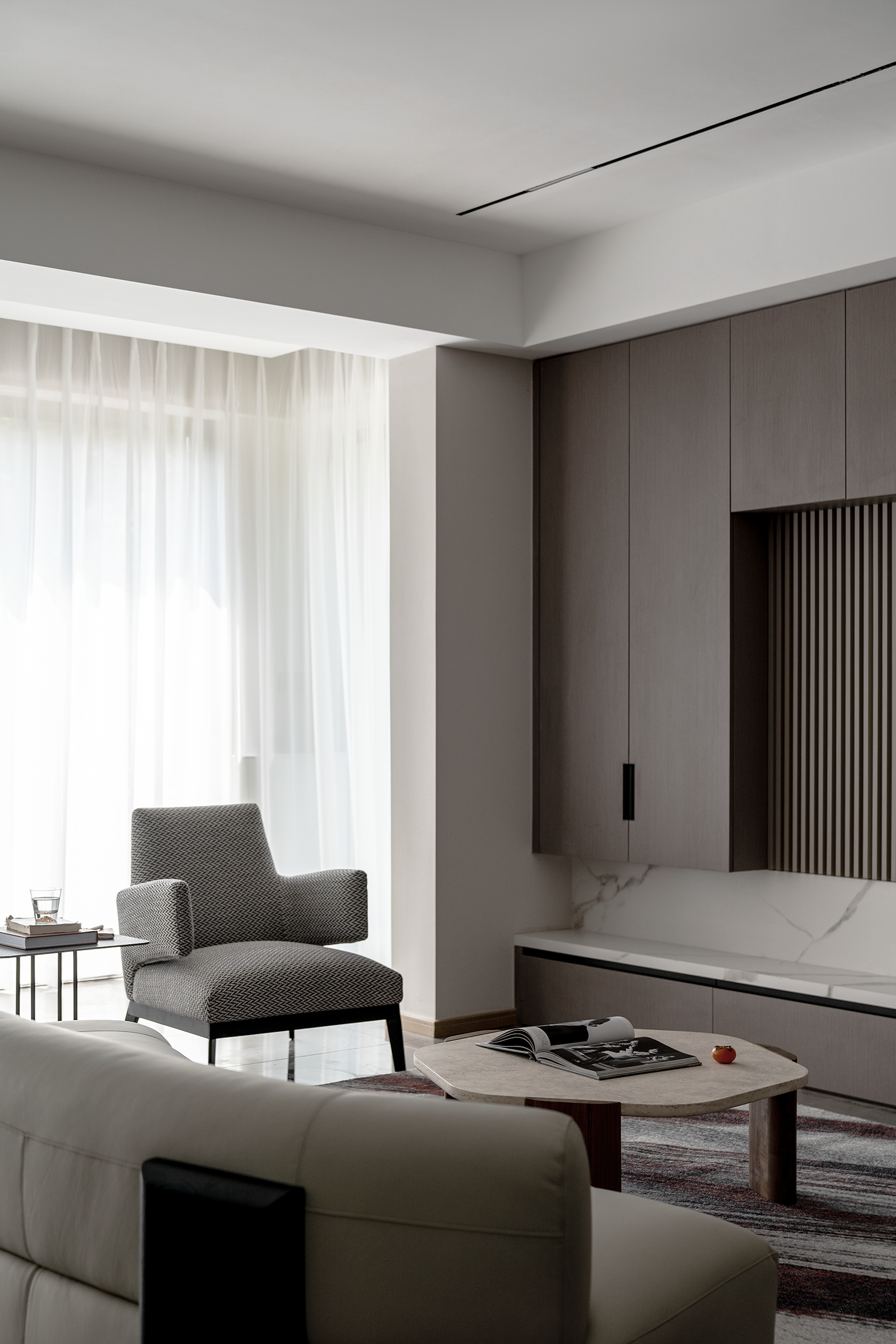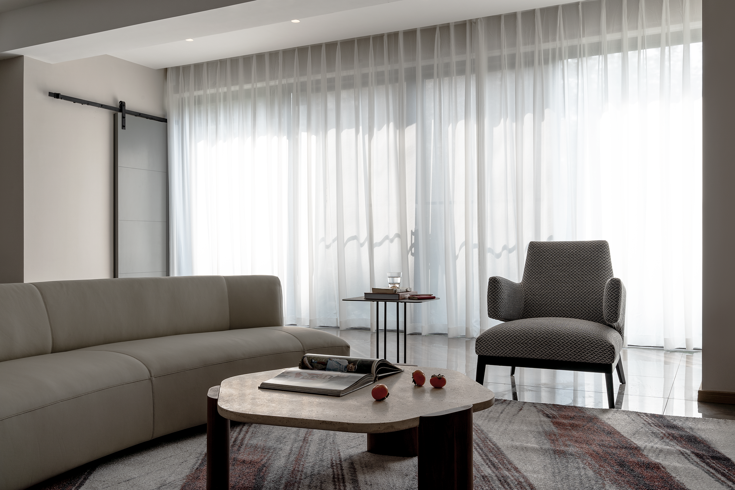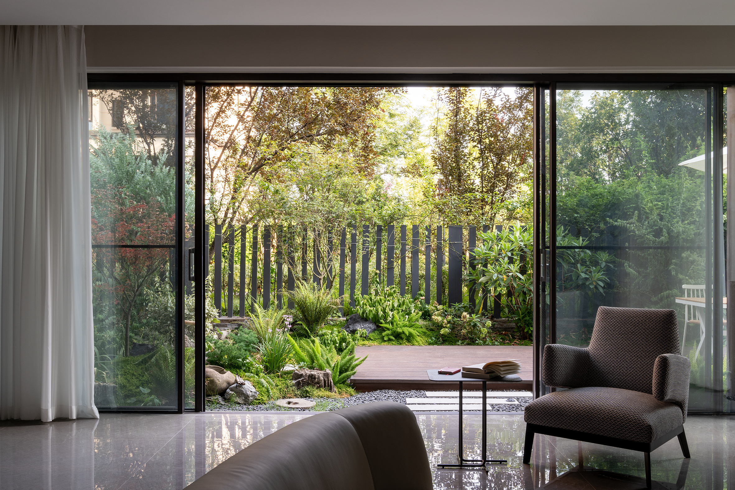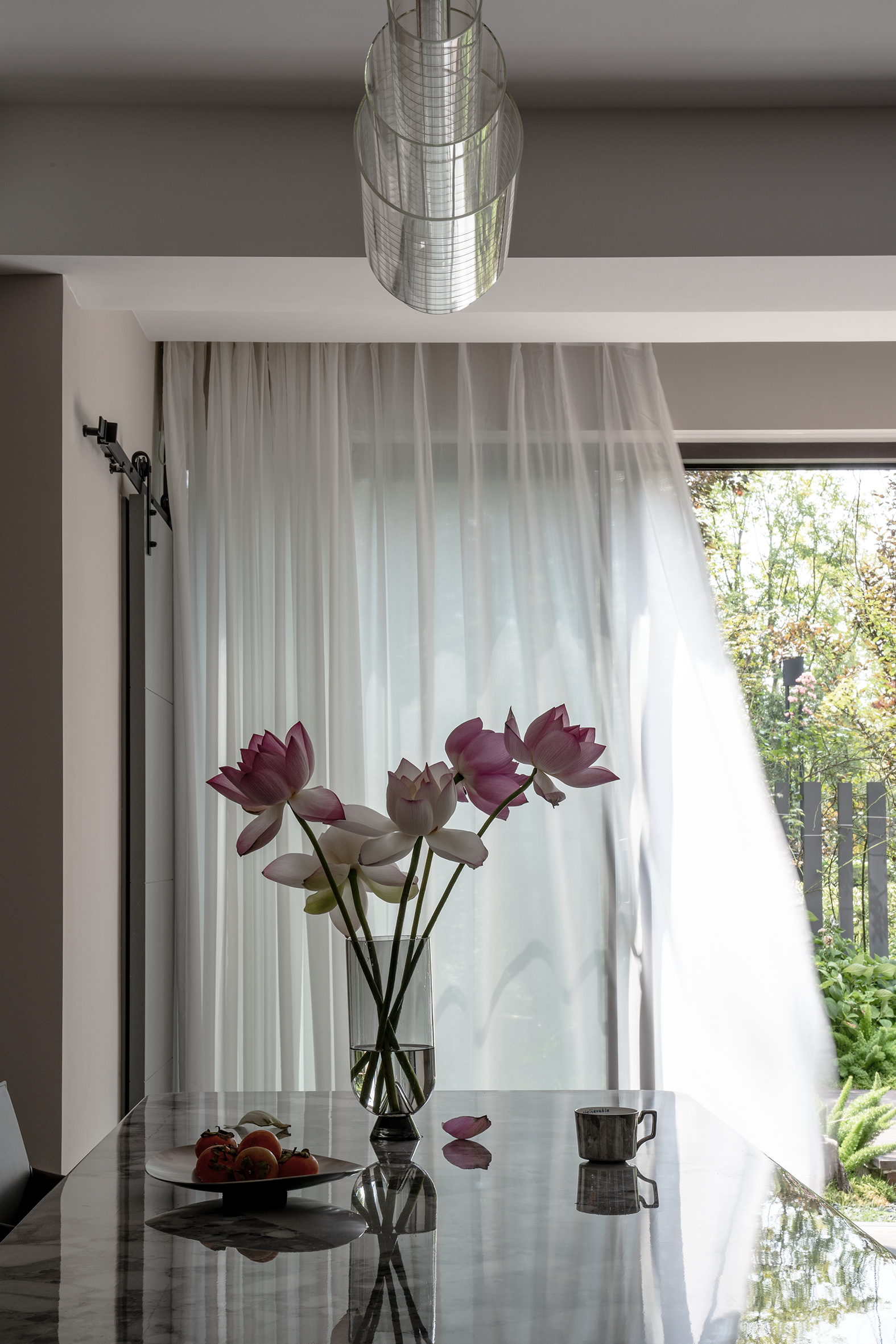 客厅室内室外的交互体验是这个家独有的,一大片落地窗也就是我们客厅最美的画幅,风动树影摇曳,光影的变换,季节的更替,我们透过窗户感受光的照耀,我们透过窗户感受自然的生命力。