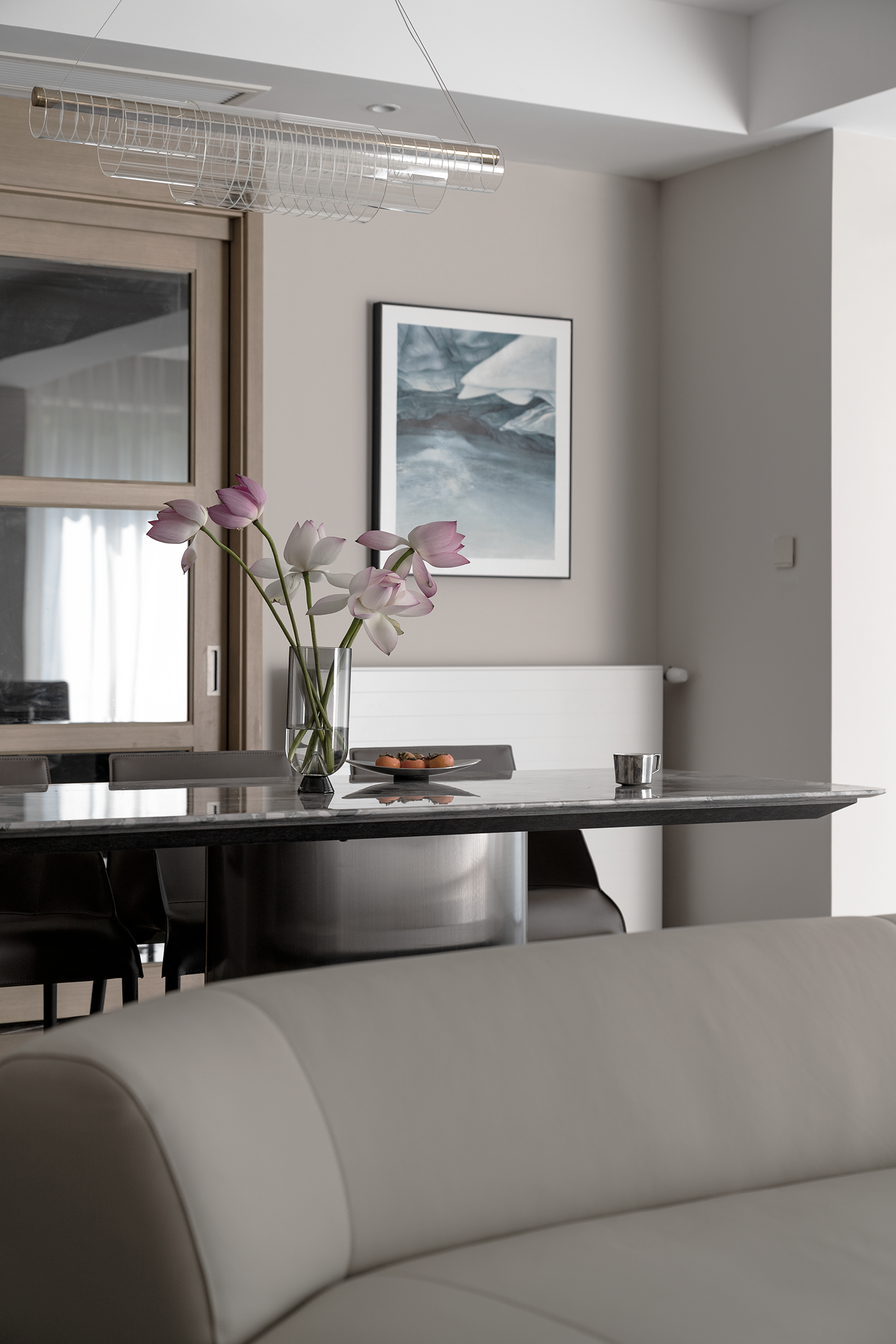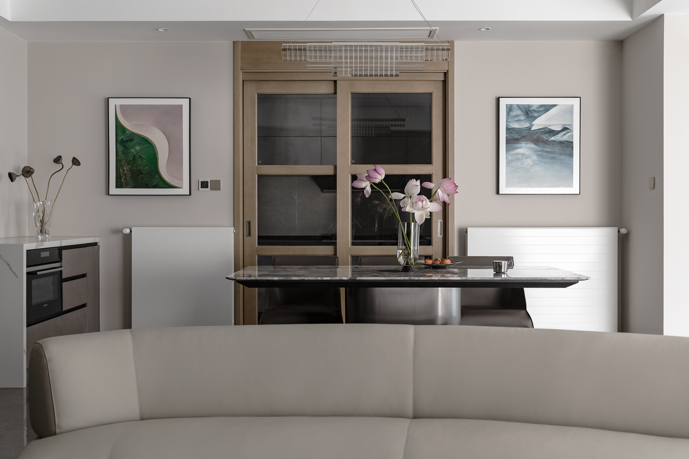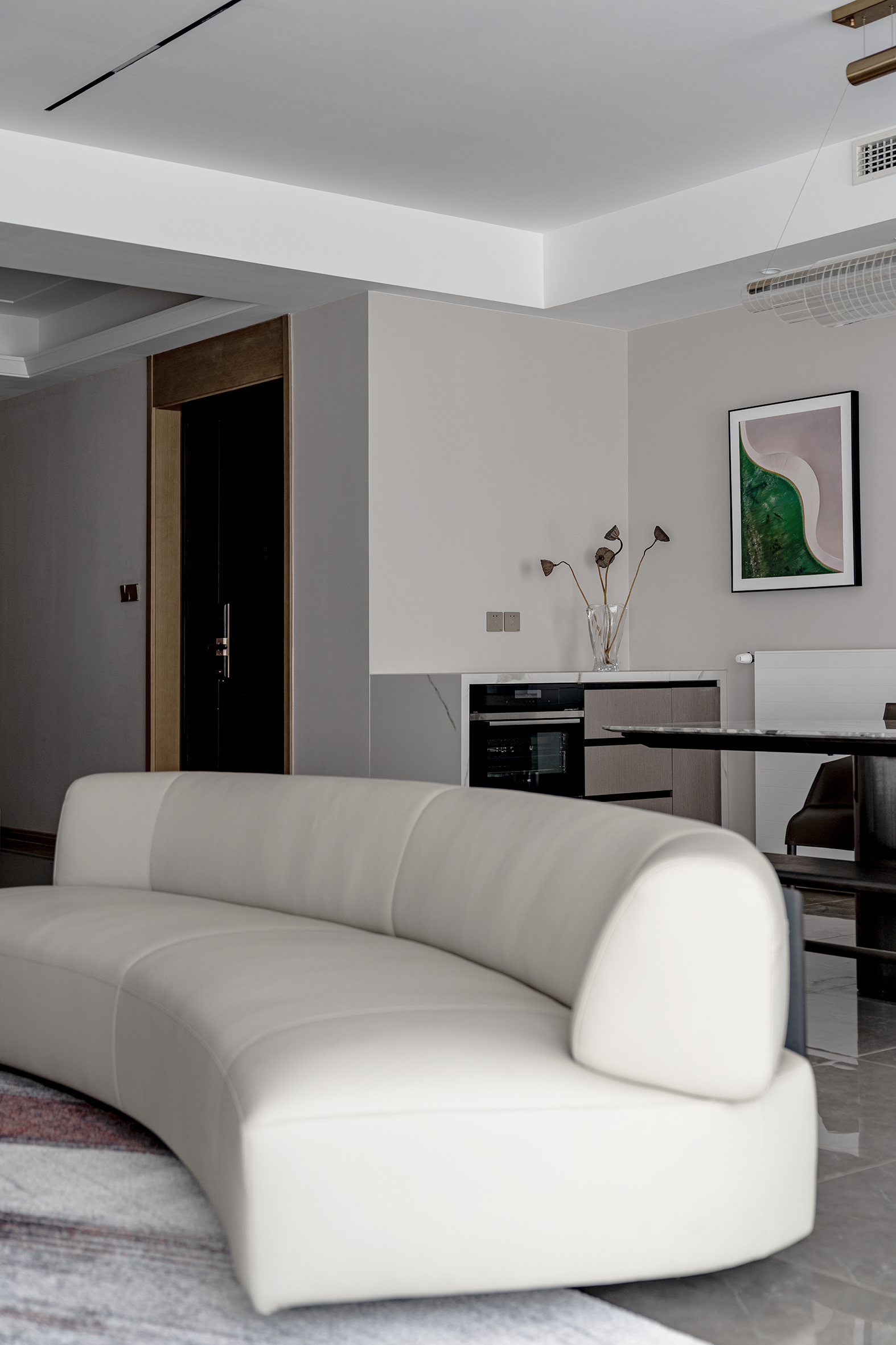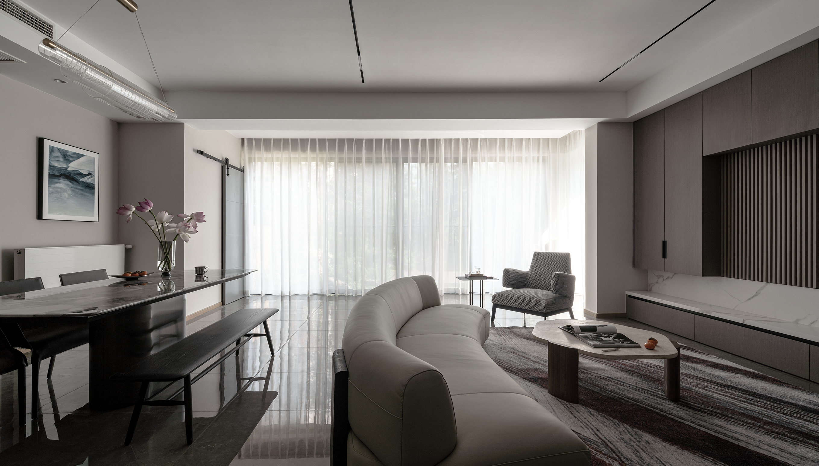 客厅室内室外的交互体验是这个家独有的,一大片落地窗也就是我们客厅最美的画幅,风动树影摇曳,光影的变换,季节的更替,我们透过窗户感受光的照耀,我们透过窗户感受自然的生命力。