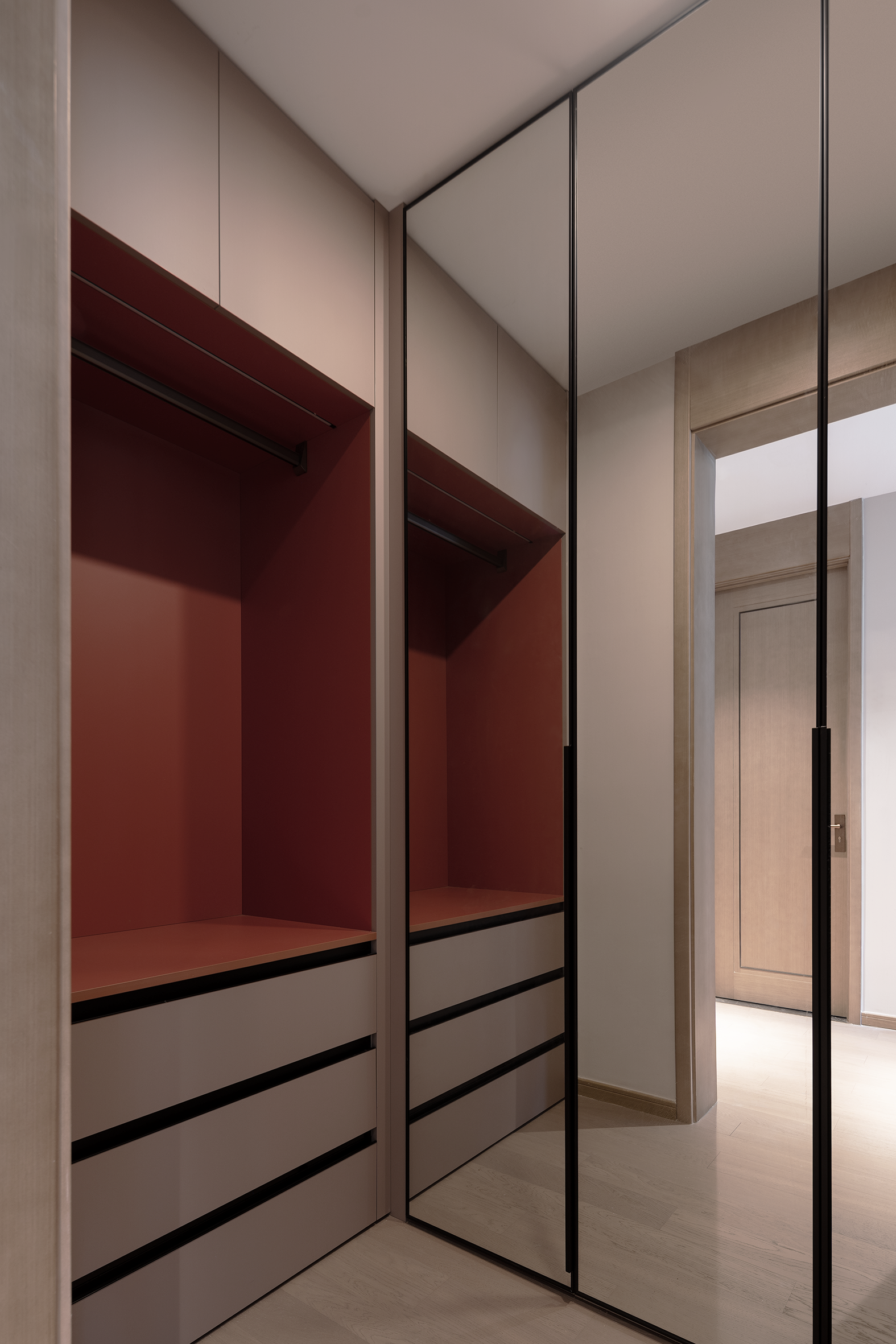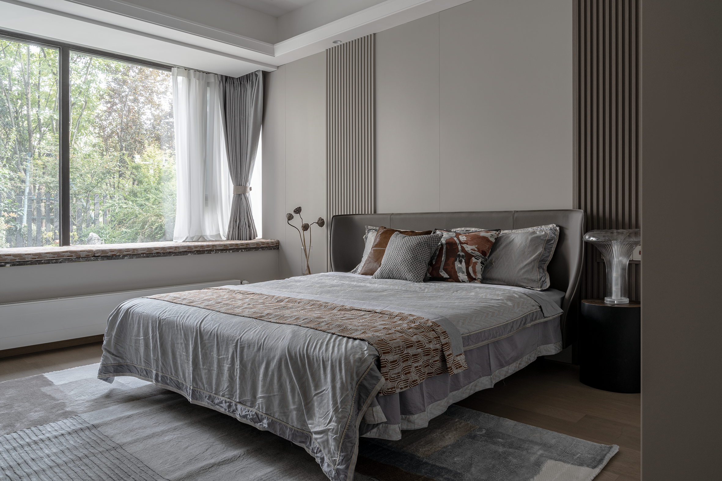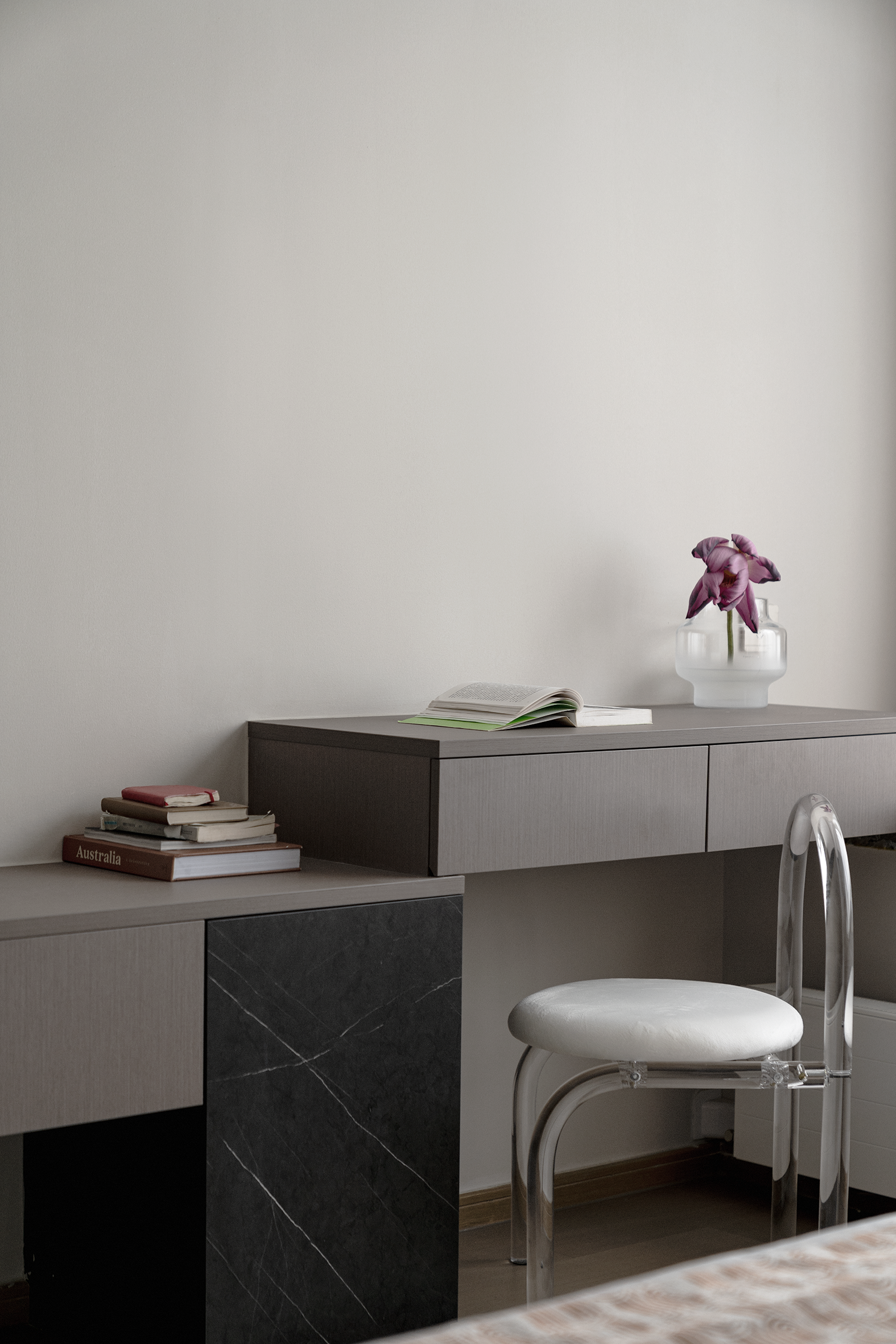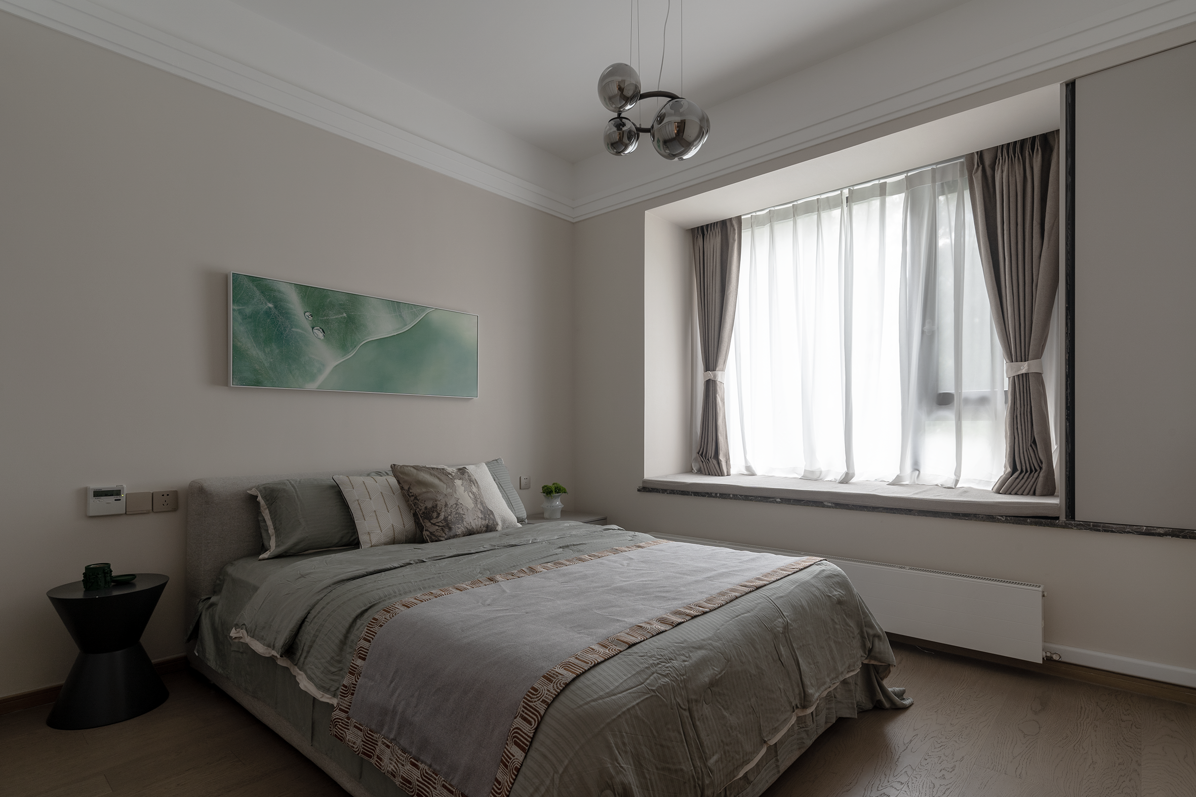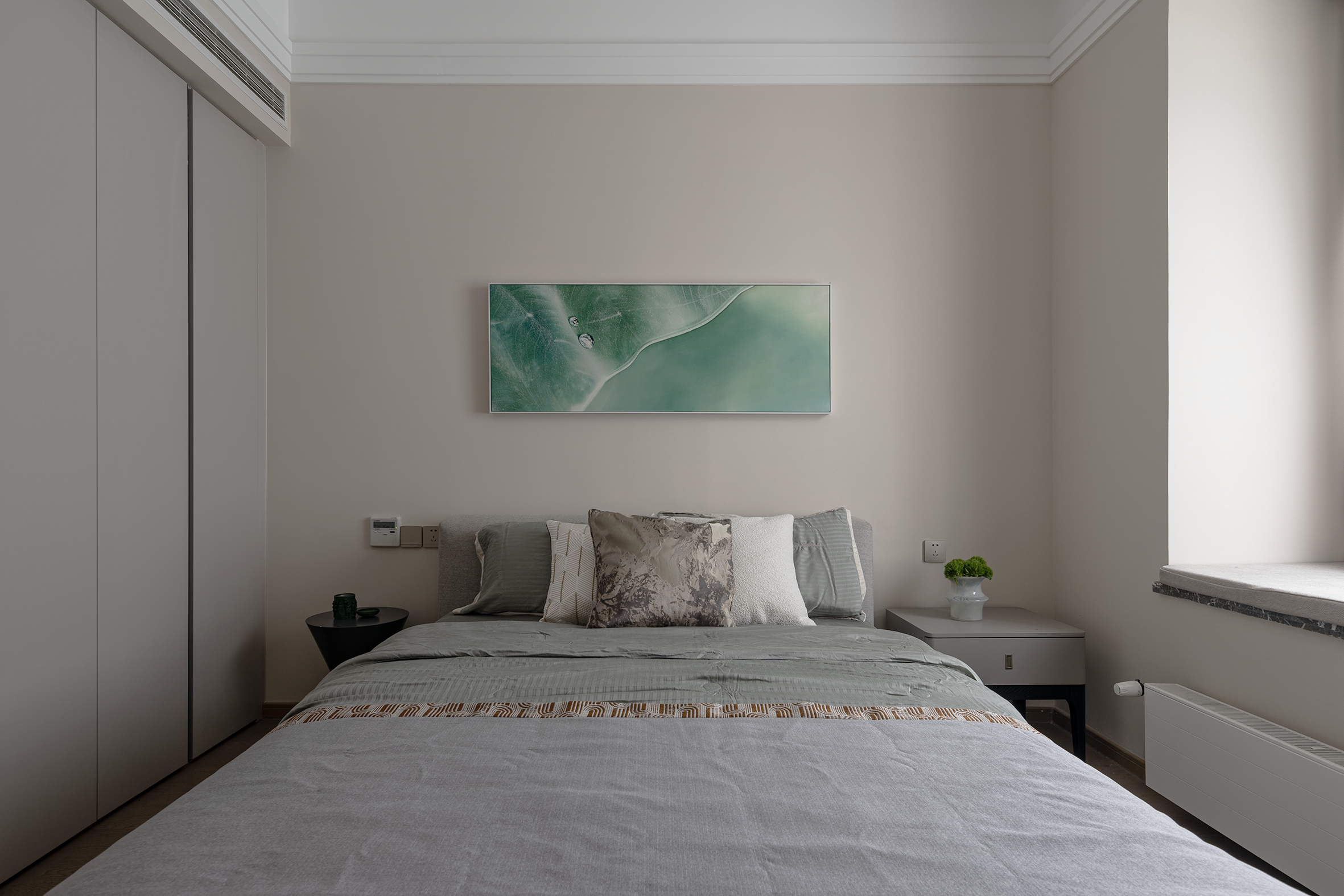 主卧整个感觉会更加的轻松自在,客户计划未来安装投影幕布,所以我们提前预留了位置,也在旁边增加了女主特别提出的梳妆台要求,靠在紧挨着花园的窗边梳妆,温婉动人又轻松愉悦。原有较宽的飘窗台,预留着之后放置蒲团和小木桌,坐在那里喝着茶看看书整理好心情迎接新的一天。