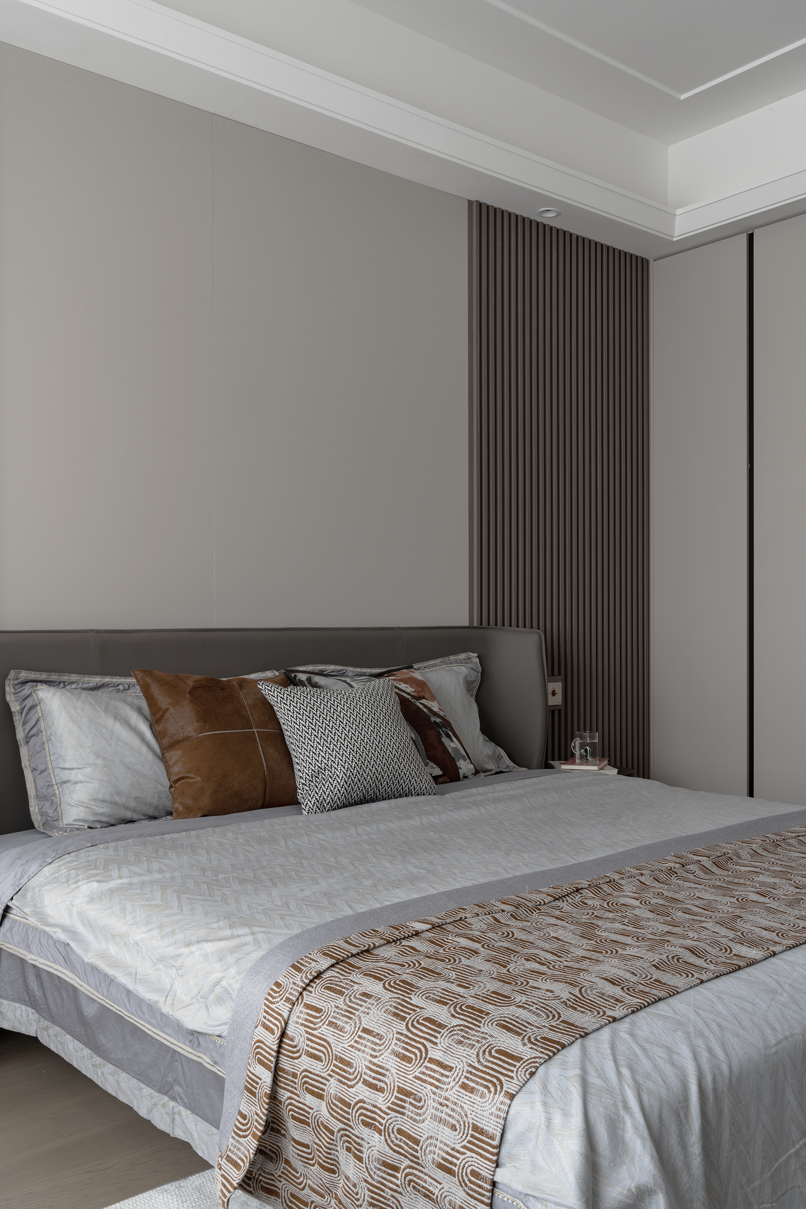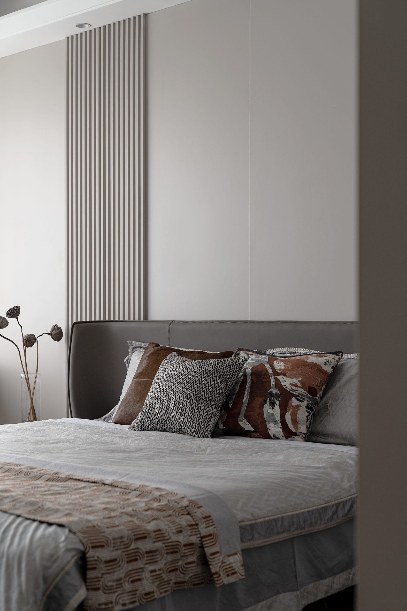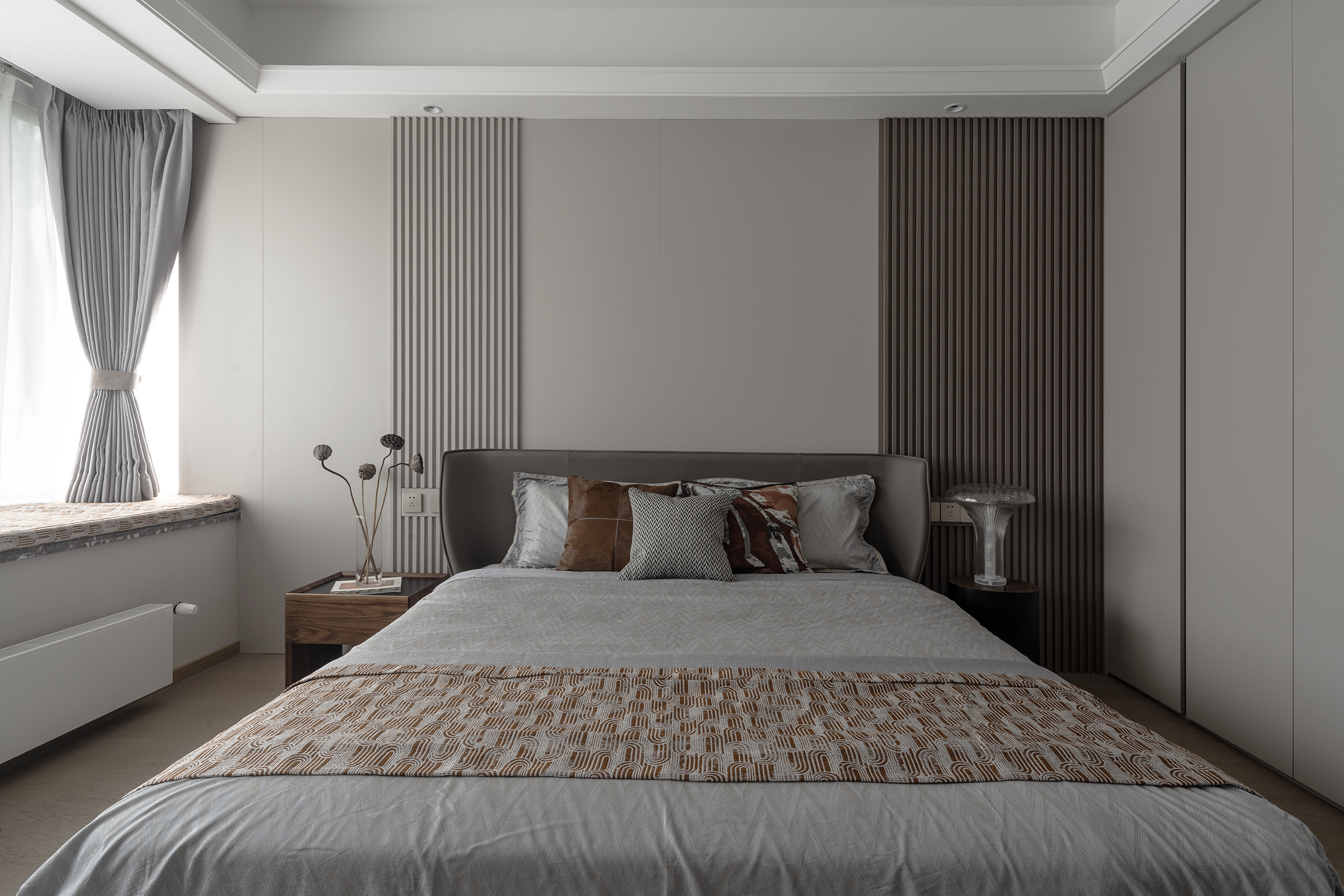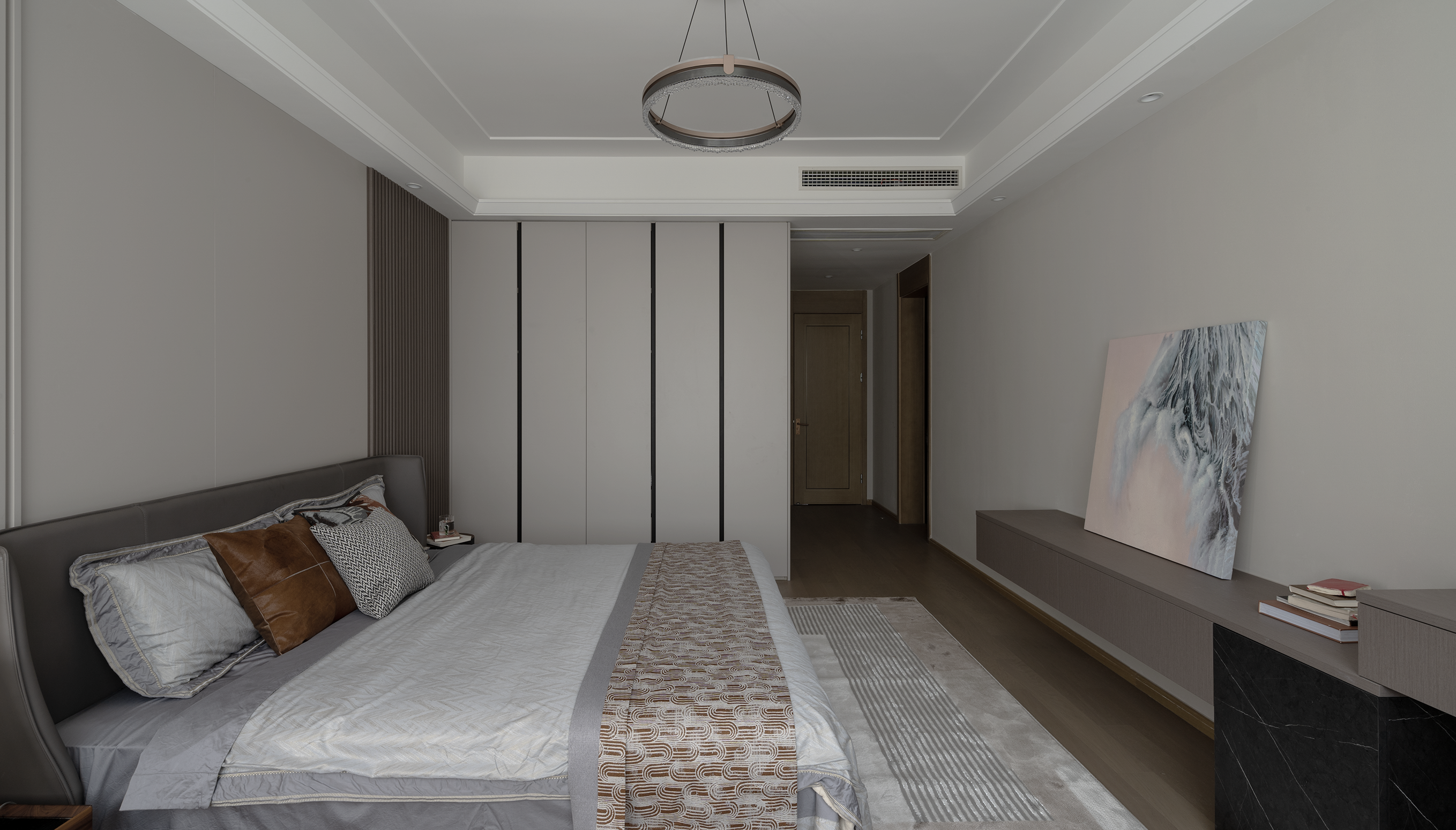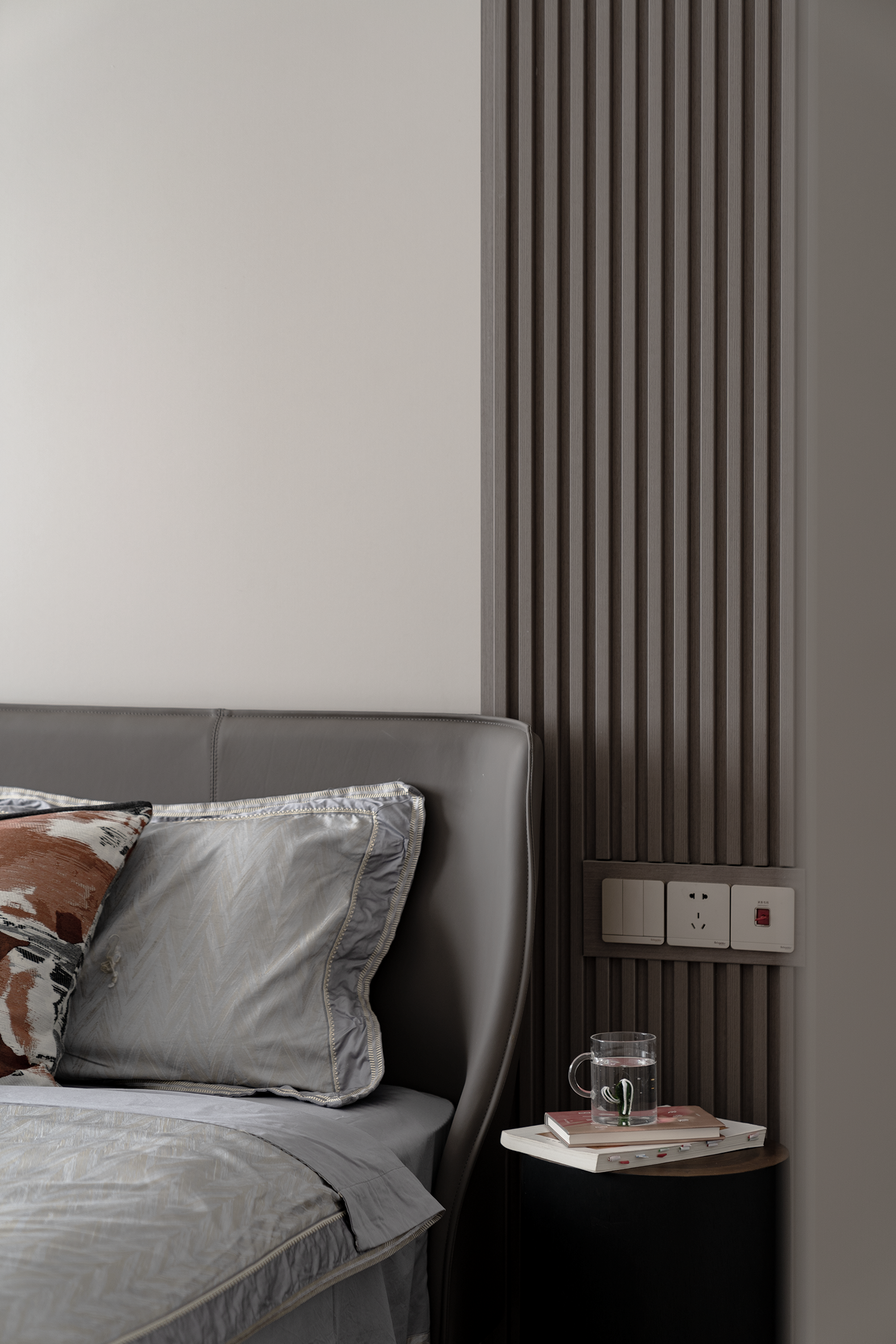主卧整个感觉会更加的轻松自在,客户计划未来安装投影幕布,所以我们提前预留了位置,也在旁边增加了女主特别提出的梳妆台要求,靠在紧挨着花园的窗边梳妆,温婉动人又轻松愉悦。原有较宽的飘窗台,预留着之后放置蒲团和小木桌,坐在那里喝着茶看看书整理好心情迎接新的一天。