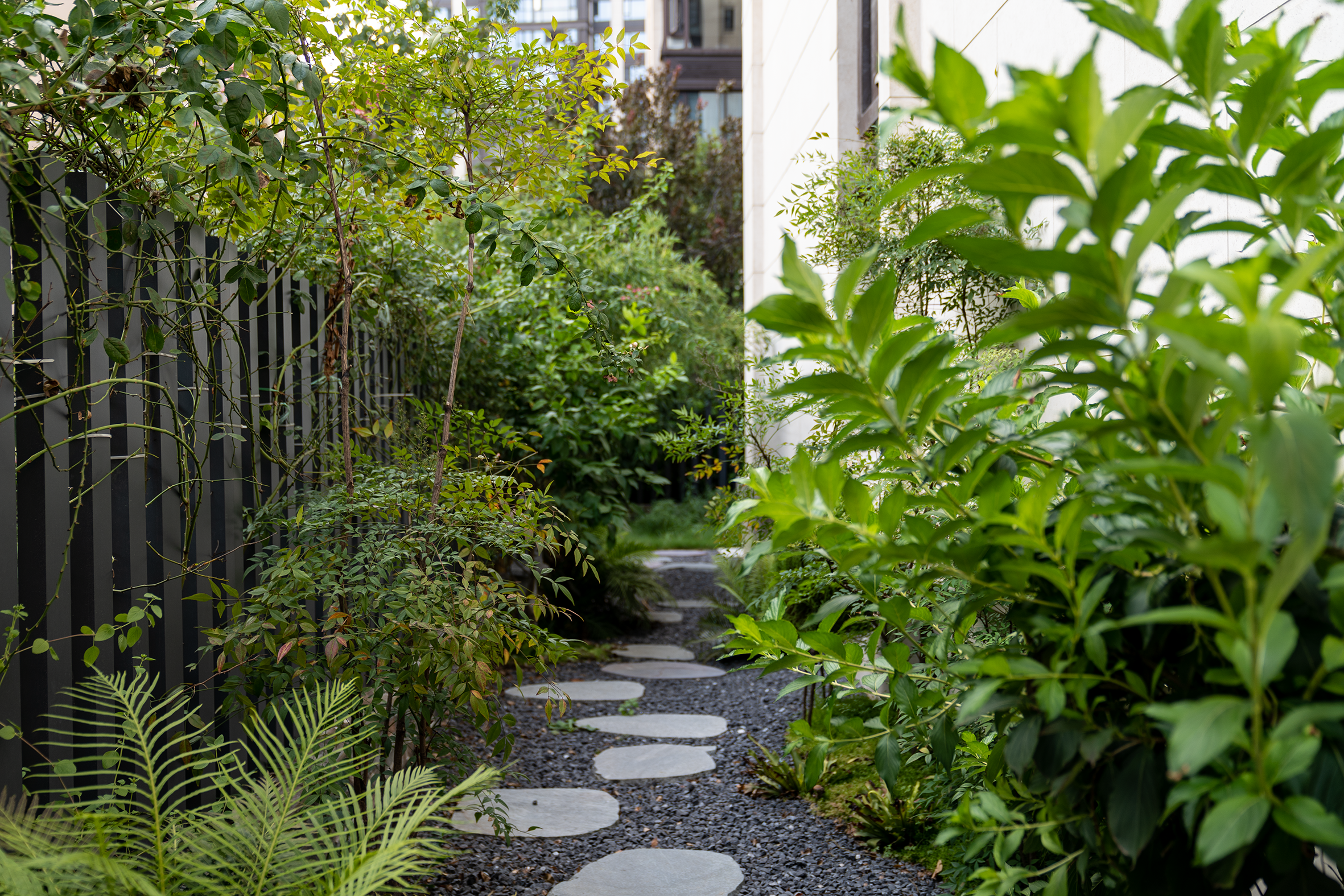 整体设计运用了木、石、光等元素相互融合,静水景观的加入使得整个场景显得更加灵动轻盈,栅栏和植物的搭配让整个场景安静而又私密,侧面蜿蜒跳动的汀步,又使狭长的通路变得活泼兼具生气,贯穿于整个场景,联动了前后花园,休息平台让我们有了尽量多的功能空间,喝茶、烧烤,只要你能想到的,在这里,都可以实现。