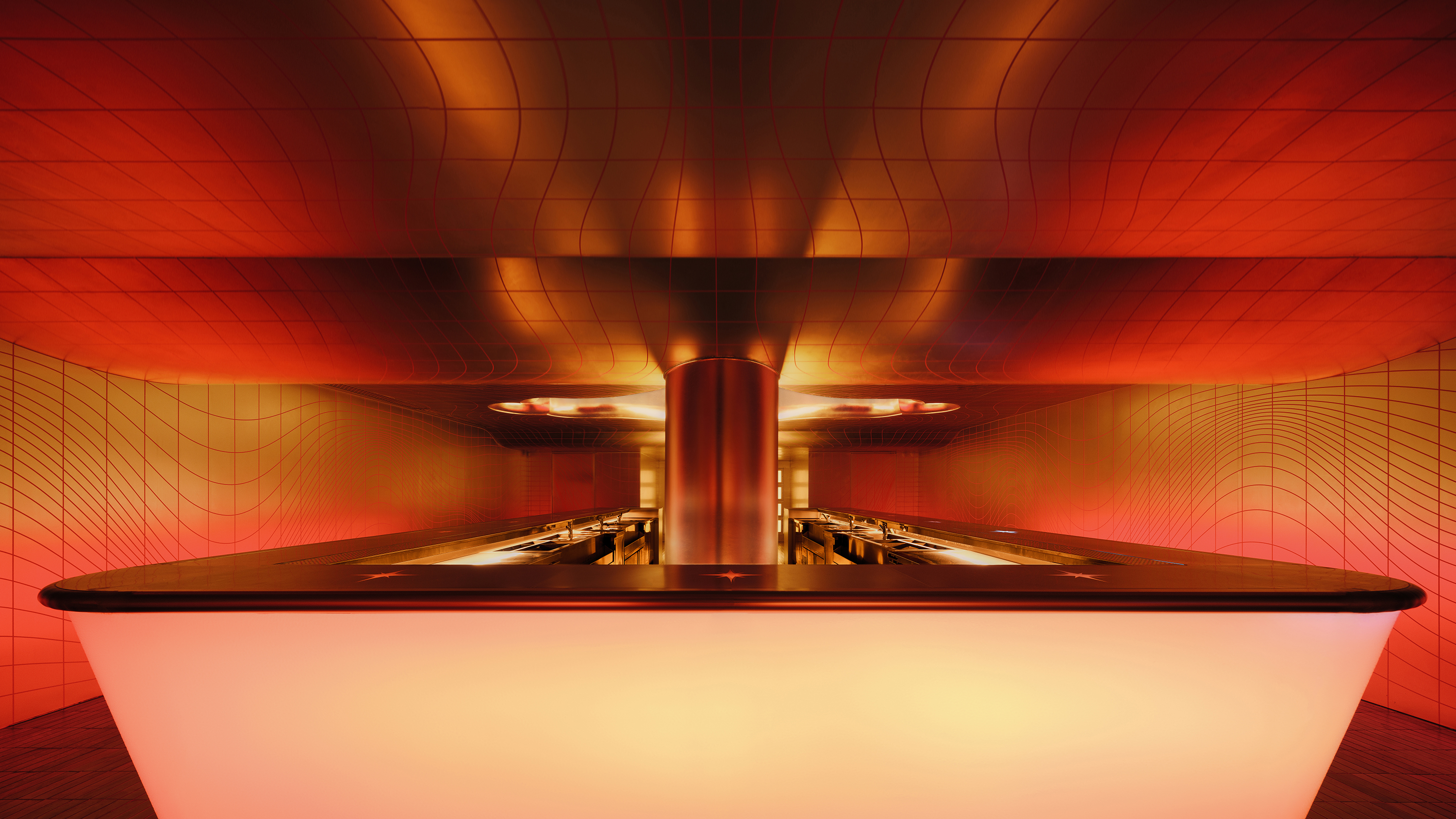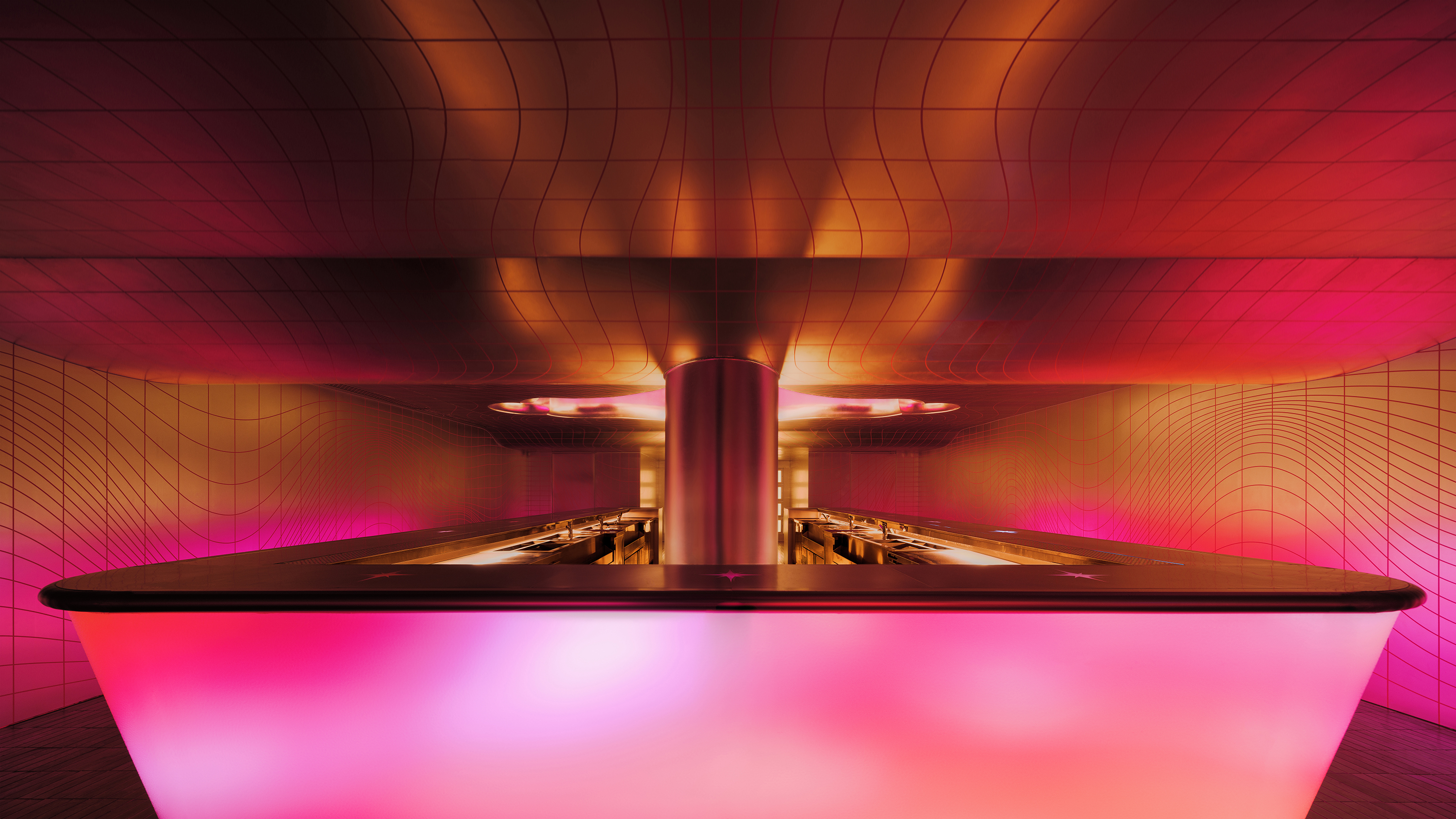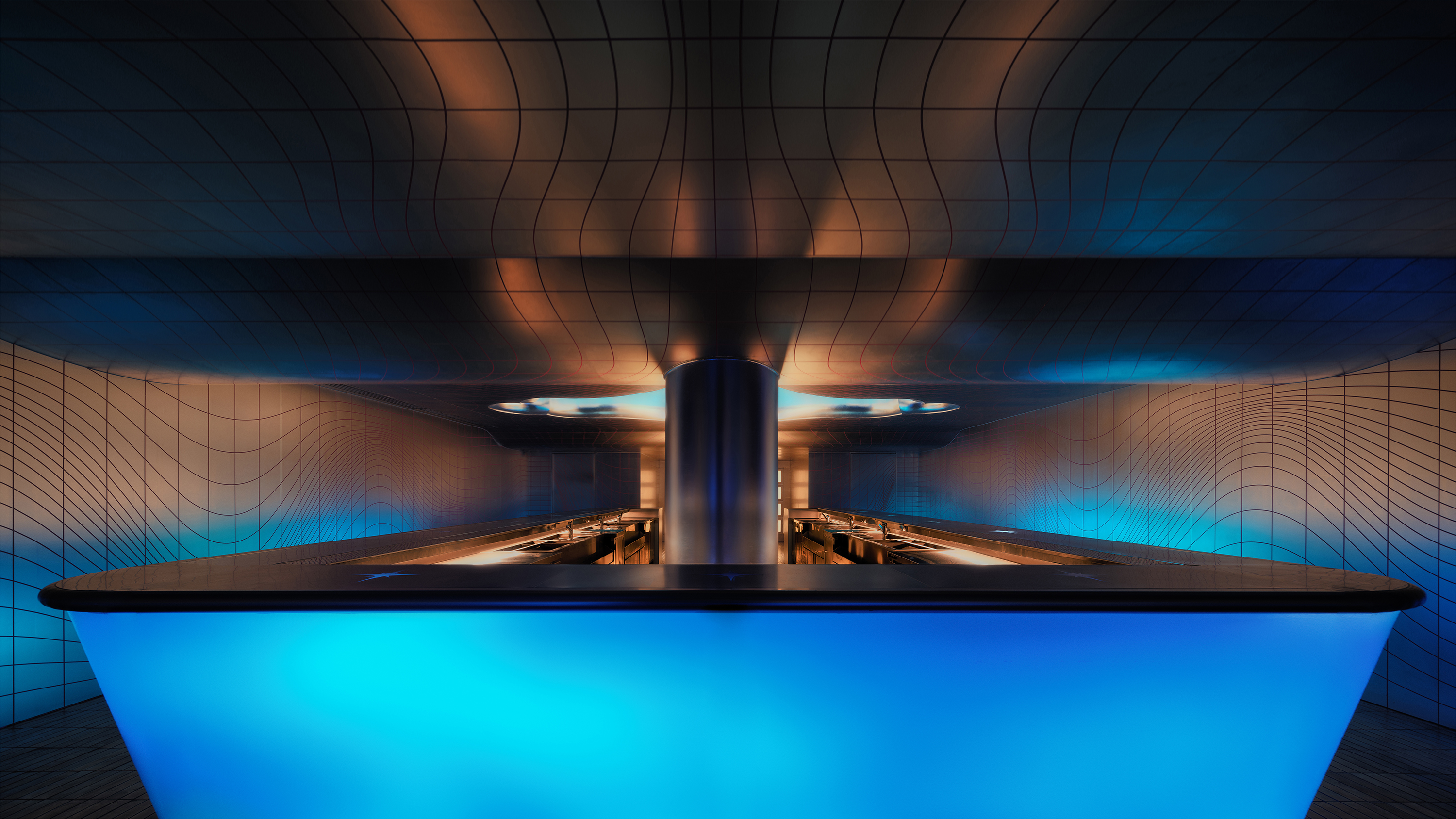 空间意境:打破COCKTAIL&WHISKY BAR的传统定义,将源自未来主义的粗野、先锋、无畏的美感,通过艺术感与科技力构筑的室内场景加以体现。营造出身处未来世界的空间错觉。设计从建筑外立面开始发力,将扭曲若水的网路转译为建筑的一部分,二维的墙面带来出三维的视觉体验,从而把商业的普通立面转变成一座极具美感的雕塑。同时为商业提供更加积极的视觉吸引力,吸引着来往消费者的眼球,进一步吸引消费者进入空间促进消费。